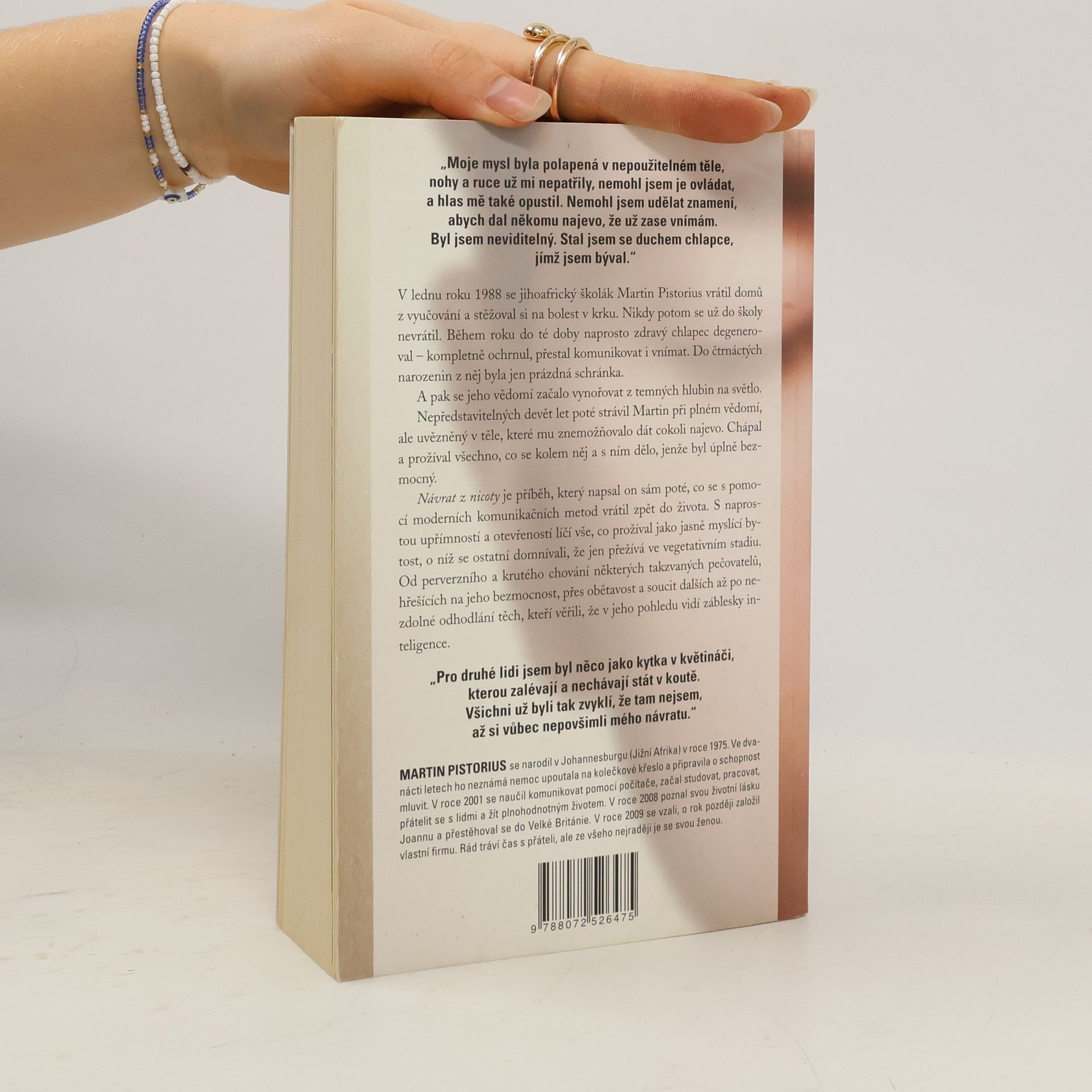Strhující vítězství chlapce, jenž se stal vězněm vlastního těla Deset let žil ve vegetativním stavu a jen on sám věděl, že je při plném vědomí. Nyní vypráví svůj neuvěřitelný, úžasný a zároveň otřesný příběh, který se stal světovým bestsellerem. V lednu roku 1988 se jihoafrický školák Martin Pistorius vrátil domů z vyučování a stěžoval si na bolest v krku. Nikdy potom se už do školy nevrátil. Během roku dosud naprosto zdravý chlapec degeneroval – kompletně ochrnul, přestal komunikovat i vnímat. Do čtrnáctých narozenin z něj byla jen prázdná schránka. Nepředstavitelných deset let poté strávil při plném vědomí, ale uvězněný v těle, které mu znemožňovalo dát cokoli najevo. Chápal a prožíval všechno, co se kolem něj a s ním dělo, jenže byl úplně bezmocný, pokud šlo o komunikaci. Návrat z nicoty je příběh, který napsal sám Martin poté, kdy se s pomocí moderních komunikačních metod vrátil zpět do života. S naprostou upřímností a otevřeností líčí vše, co prožíval jako jasně myslící bytost, o níž se ostatní domnívali, že jen přežívá ve vegetativním stadiu. Od perverzního a krutého chování některých takzvaných pečovatelů, hřešících na jeho bezmocnost, přes obětavost a soucit dalších až po nezdolné odhodlání těch, kteří věřili, že v jeho pohledu vidí záblesky inteligence.