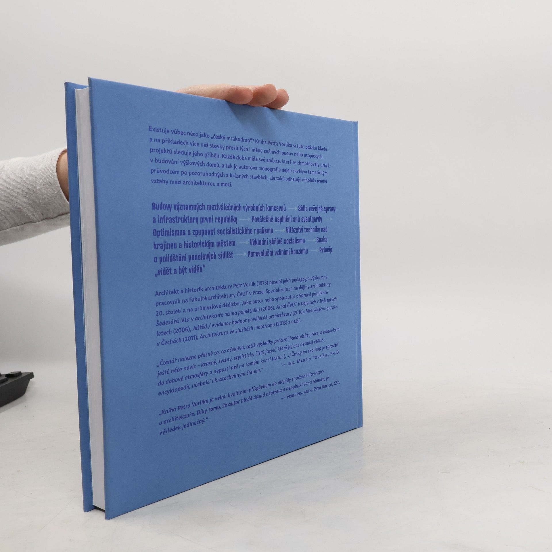 Existuje vůbec něco jako „český mrakodrap“? Kniha Petra Vorlíka sleduje na příkladech více než stovky proslulých i méně známých staveb nebo utopických projektů příběh skromného českého mrakodrapu. Zachycuje např.budovy významných meziválečných výrobních koncernů, sídel veřejné právy a infrastruktury pokrokové republiky, poválečné naplnění snů avantgardy, nekritický optimismus, ale i zpupnost socialistického realismu, vítězství techniky nad krajinou a historickým městem, prominentní výkladní skříně socialismu, snahu o polidštění jednotvárných panelových sídlišť i porevoluční vzlínání konzumu a principu „vidět a být viděn“. Každá doba měla své ambice, které se mnohdy zhmotnily právě v budování výškových staveb. Na příkladech jednotlivých výškových budov lze tedy oukázat na mnohdy jemné vztahy mezi mocí a architekturou.