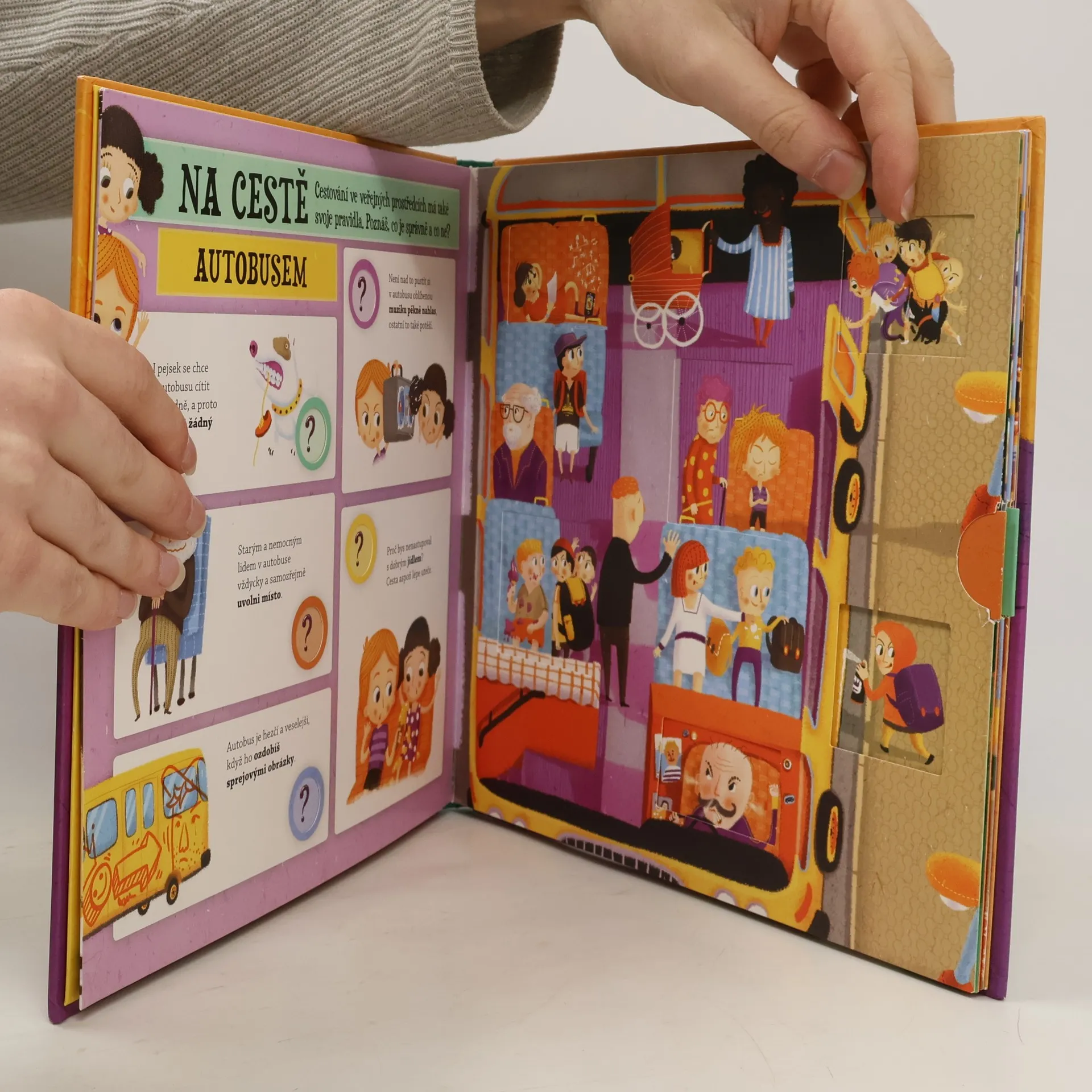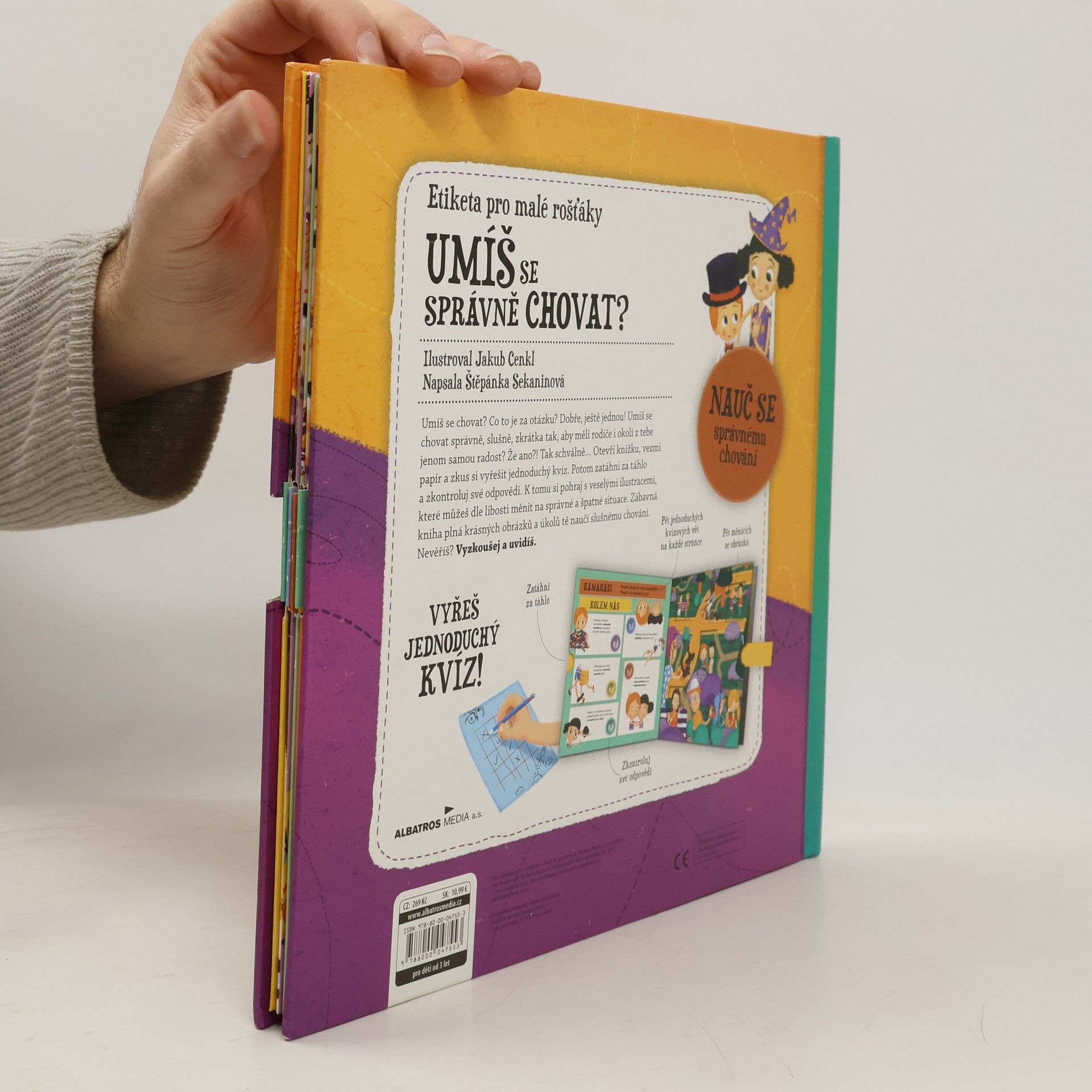 Umíš se chovat??! Tak schválně… Otevři knížku, vezmi papír a zkus si odpovědět na jednoduché kvízové věty. Potom zatáhni za táhlo a zkontroluj své odpovědi. K tomu si můžeš pohrát s veselými ilustracemi, které můžeš dle libosti měnit na správné a špatné situace. Zábavná veselá kniha plná obrázků a úkolů tě naučí slušnému chování.