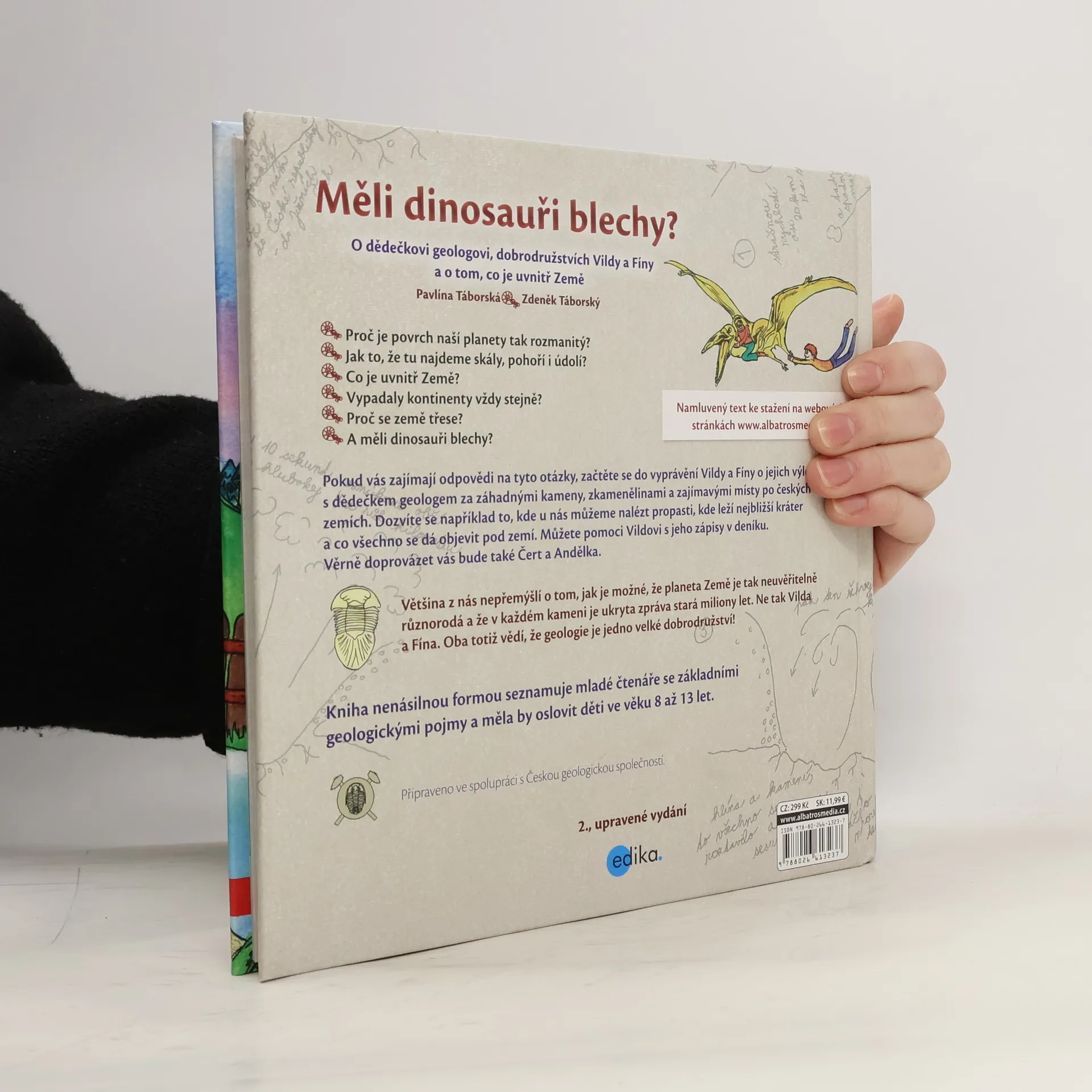 Proč je povrch naší planety tak rozmanitý? * Jak to, že tu najdeme skály, pohoří i údolí? * Co je uvnitř Země? * Vypadaly kontinenty vždy stejně? * Proč se země třese? * A měli dinosauři blechy? Pokud vás zajímají odpovědi na tyto otázky, začtěte se do vyprávění Vildy a Fíny o jejich výletech s dědečkem geologem za záhadnými kameny, zkamenělinami a zajímavými místy po českých zemích. Dozvíte se například to, kde u nás můžeme nalézt propasti, kde leží nejbližší kráter a co všechno se dá objevit pod zemí. Můžete pomoci Vildovi s jeho zápisy v deníku. Věrně doprovázet vás bude také Čert a Andělka. Většina z nás nepřemýšlí o tom, jak je možné, že planeta Země je tak neuvěřitelně různorodá a že v každém kameni je ukryta zpráva stará miliony let. Ne tak Vilda a Fína. Oba totiž vědí, že geologie je jedno velké dobrodružství! Kniha nenásilnou formou seznamuje mladé čtenáře se základními geologickými pojmy a měla by oslovit děti ve věku 8 až 13 let.
