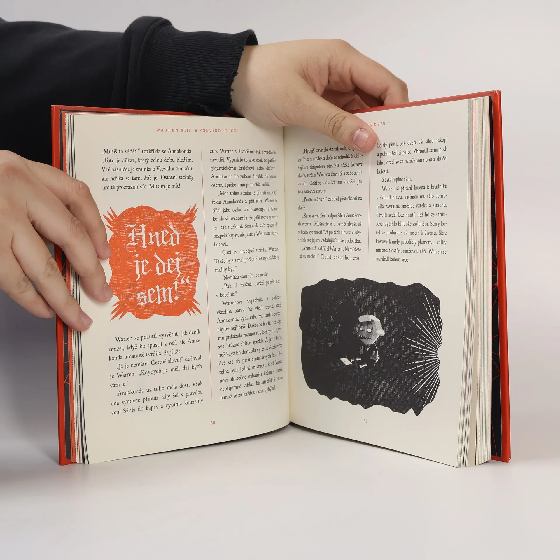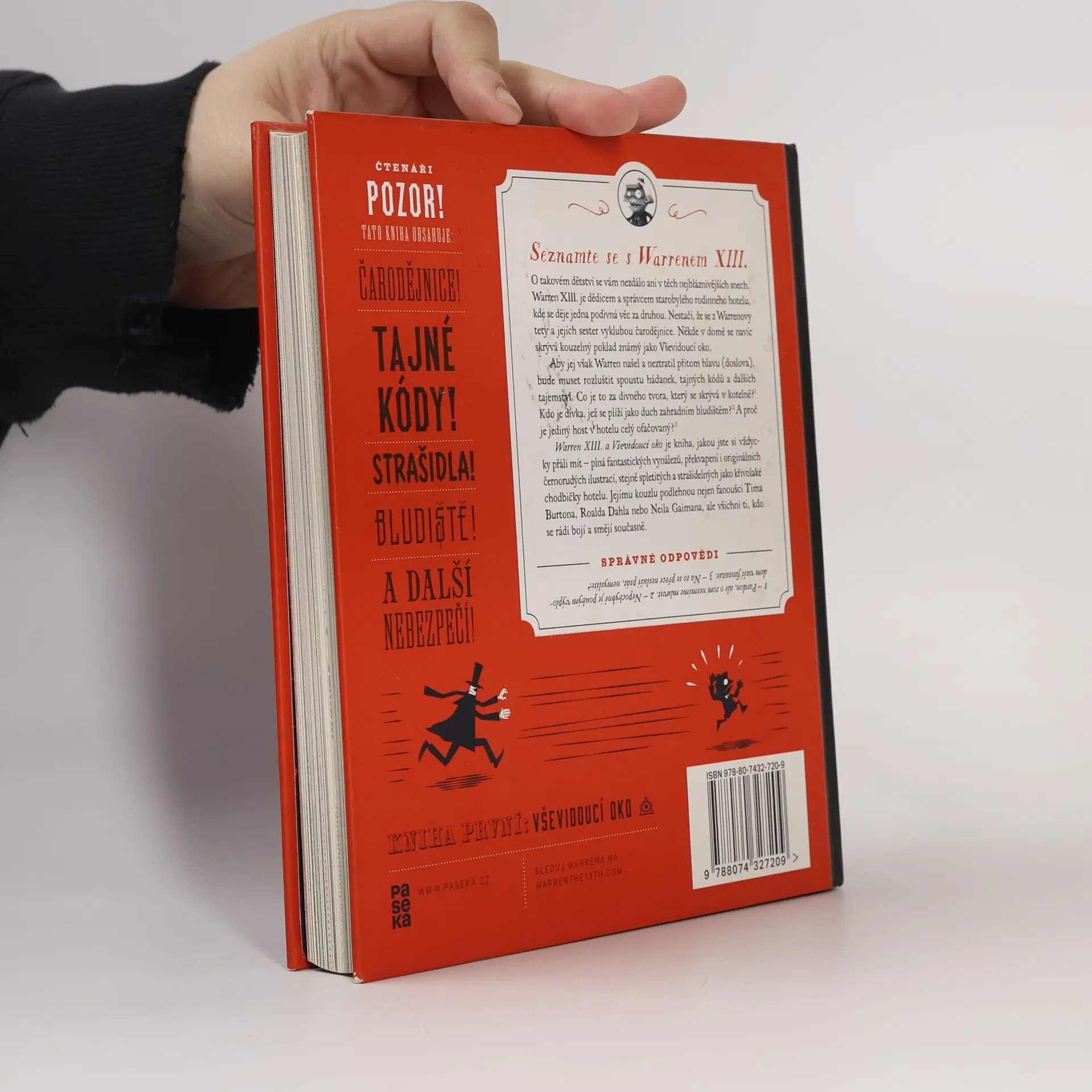 O takovém dětství se vám nezdálo ani v těch nejbláznivějších snech. Warren XIII. je dědicem a správcem starobylého rodinného hotelu, kde se děje jedna podivnější věc za druhou. V kotelně žije tvor se spoustou chapadel, zahradním bludištěm se plíží přízračná dívka, ze sester Warrenovy tety se vyklubou čarodějnice a mezi záhadnými hosty narazíte třeba na muže, který je od hlavy až k patě celý ofačovaný. Někde v domě se navíc skrývá kouzelný poklad známý jako Vševidoucí oko. Aby jej však Warren našel a neztratil přitom hlavu (doslova), bude muset rozluštit spoustu hádanek, tajných kódů a dalších tajemství. Warren XIII. a Vševidoucí oko je kniha, jakou jste si vždycky přáli mít – plná fantastických vynálezů, překvapení i originálních černo-rudých ilustrací, stejně spletitých a strašidelných jako křivolaké chodbičky hotelu. Jejímu kouzlu podlehnou nejen fanoušci Tima Burtona, Roalda Dahla nebo Neila Gaimana, ale všichni ti, kdo se rádi bojí a smějí současně.