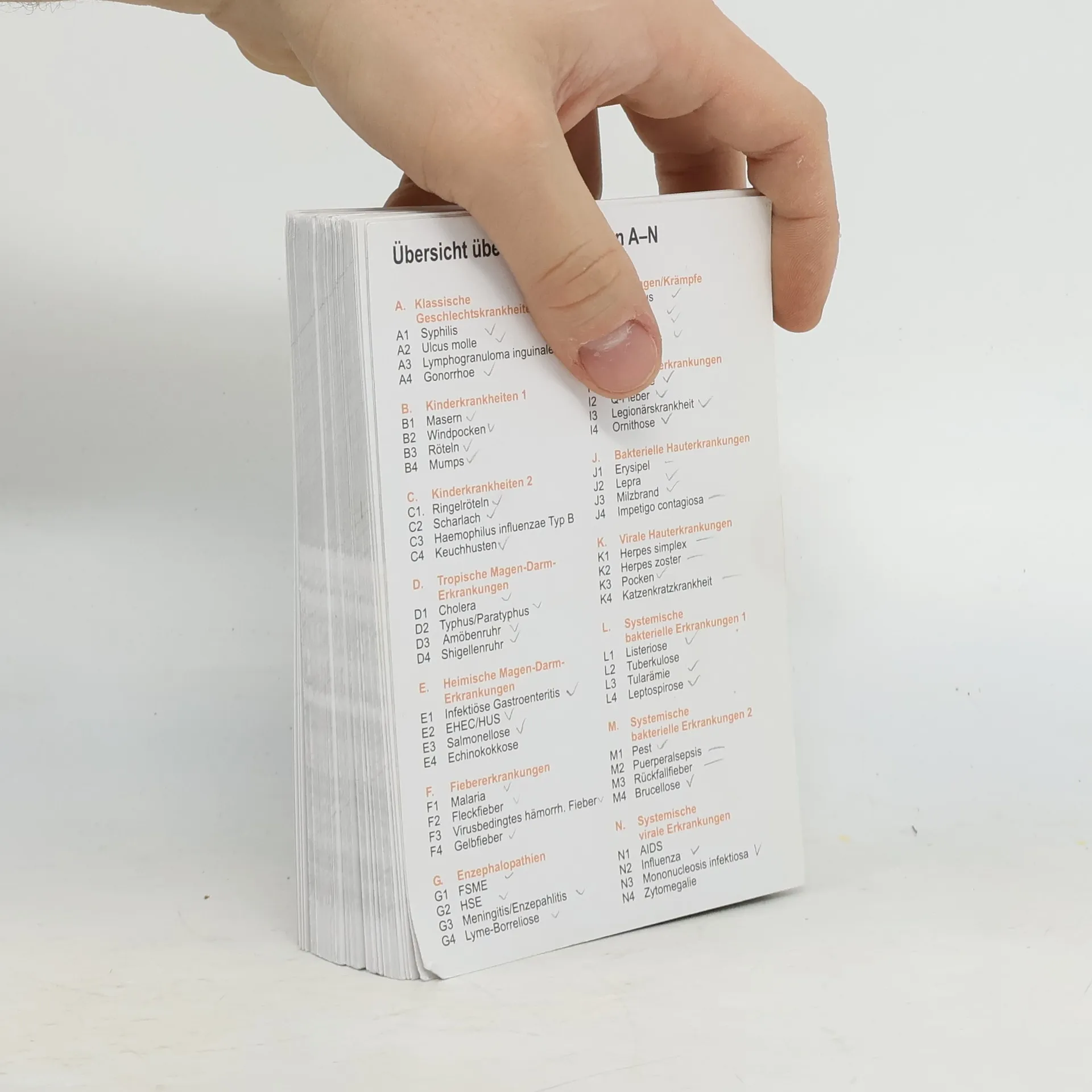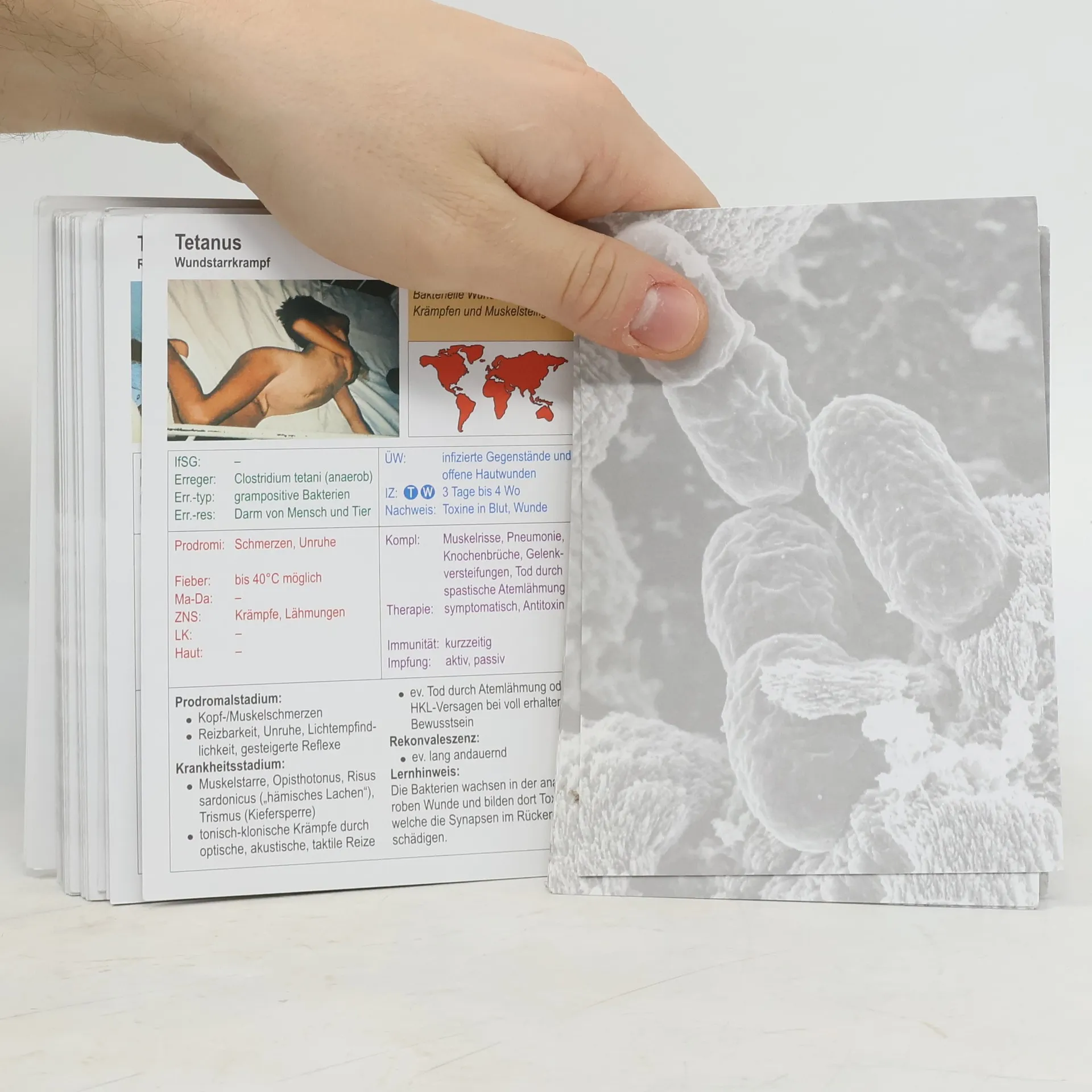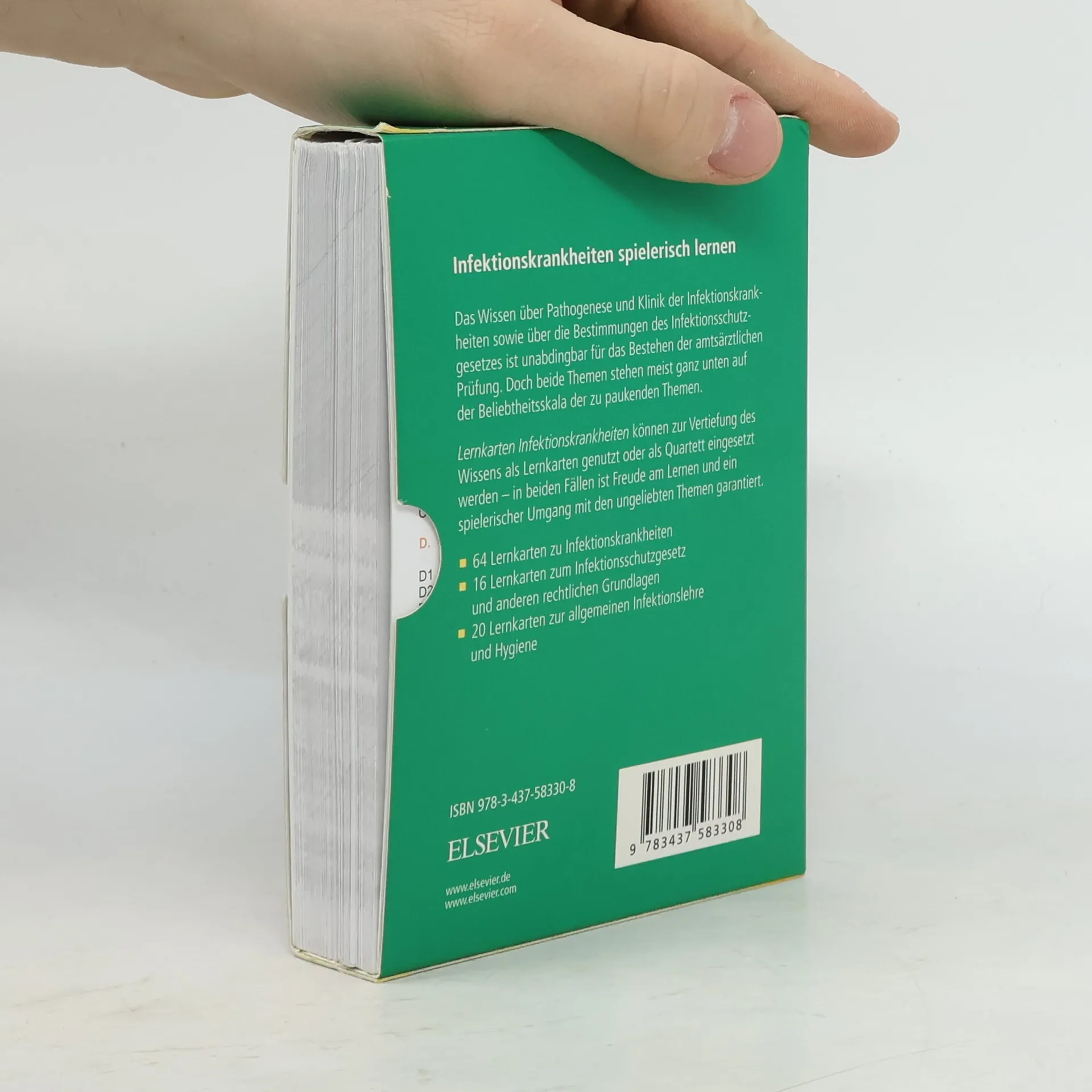 Das Wissen über Pathogenese und Klinik der Infektionskrankheiten sowie über die Bestimmungen des Infektionsschutzgesetzes ist unabdingbar für das Bestehen der amtsärztlichen Prüfung. Doch beide Themen stehen meist ganz unten auf der Beliebtheitsskala der zu paukenden Themen. Lernkarten Infektionskrankheiten können zur Vertiefung des Wissens als Lernkarten genutzt oder als Quartett eingesetzt werden – in beiden Fällen ist Freude am Lernen und ein spielerischer Umgang mit den ungeliebten Themen garantiert. 64 Lernkarten zu Infektionskrankheiten 16 Karten zum Infektionsschutzgesetz (IfSG) und anderen rechtlichen Grundlagen 20 Karten zur Allgemeinen Infektionslehre und Hygiene