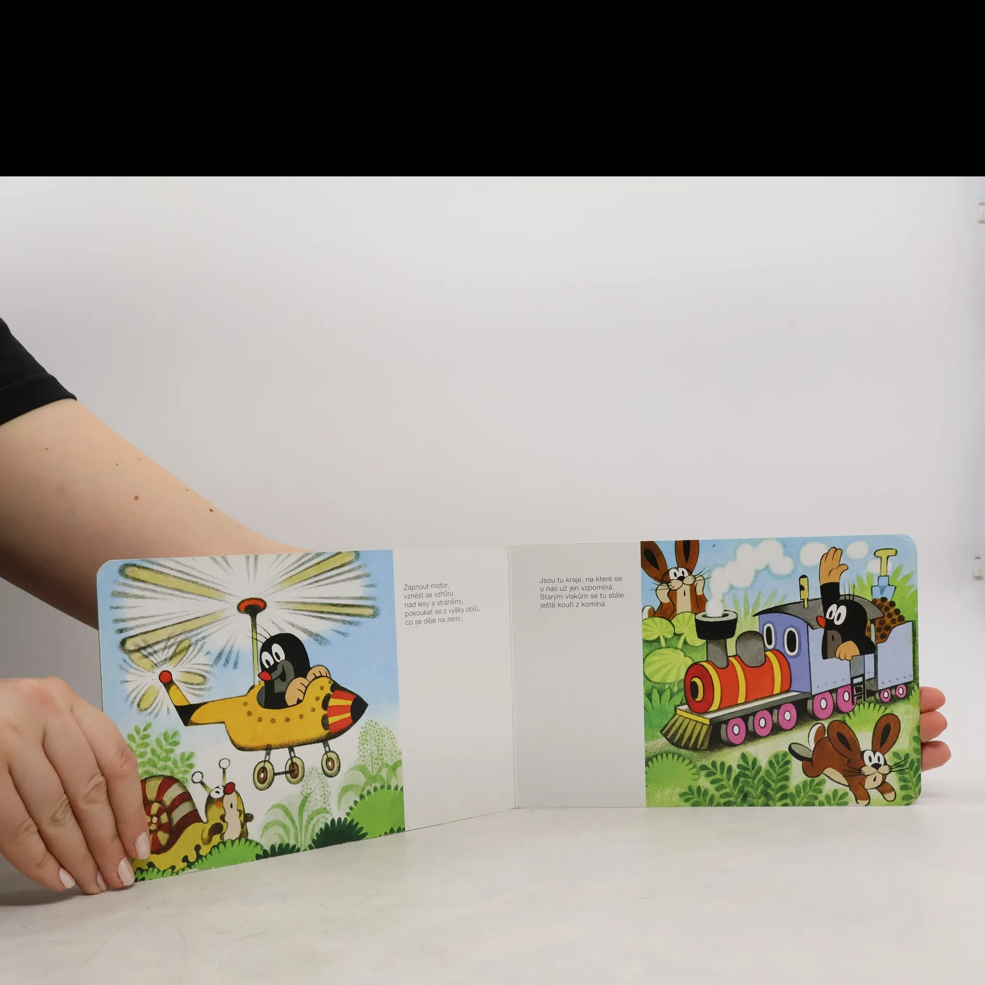 Krátká říkadla o cestování malého Krtečka - lodí a motorovým člunem po vodě, vrtulníkem a letadlem ve vzduchu, vlakem, autem a na motocyklu do přírody, ale třeba i na sněžném skútru a v ponorce.