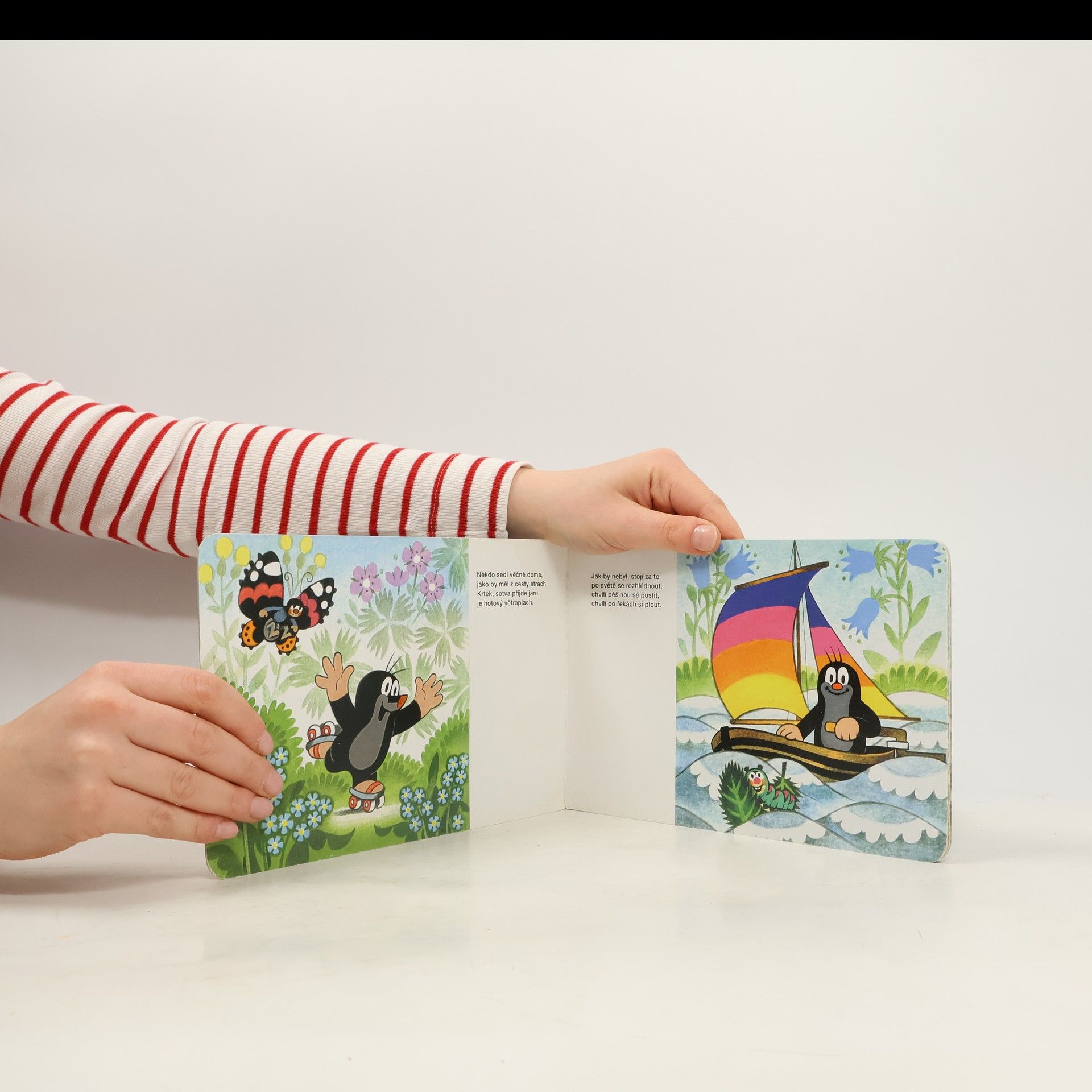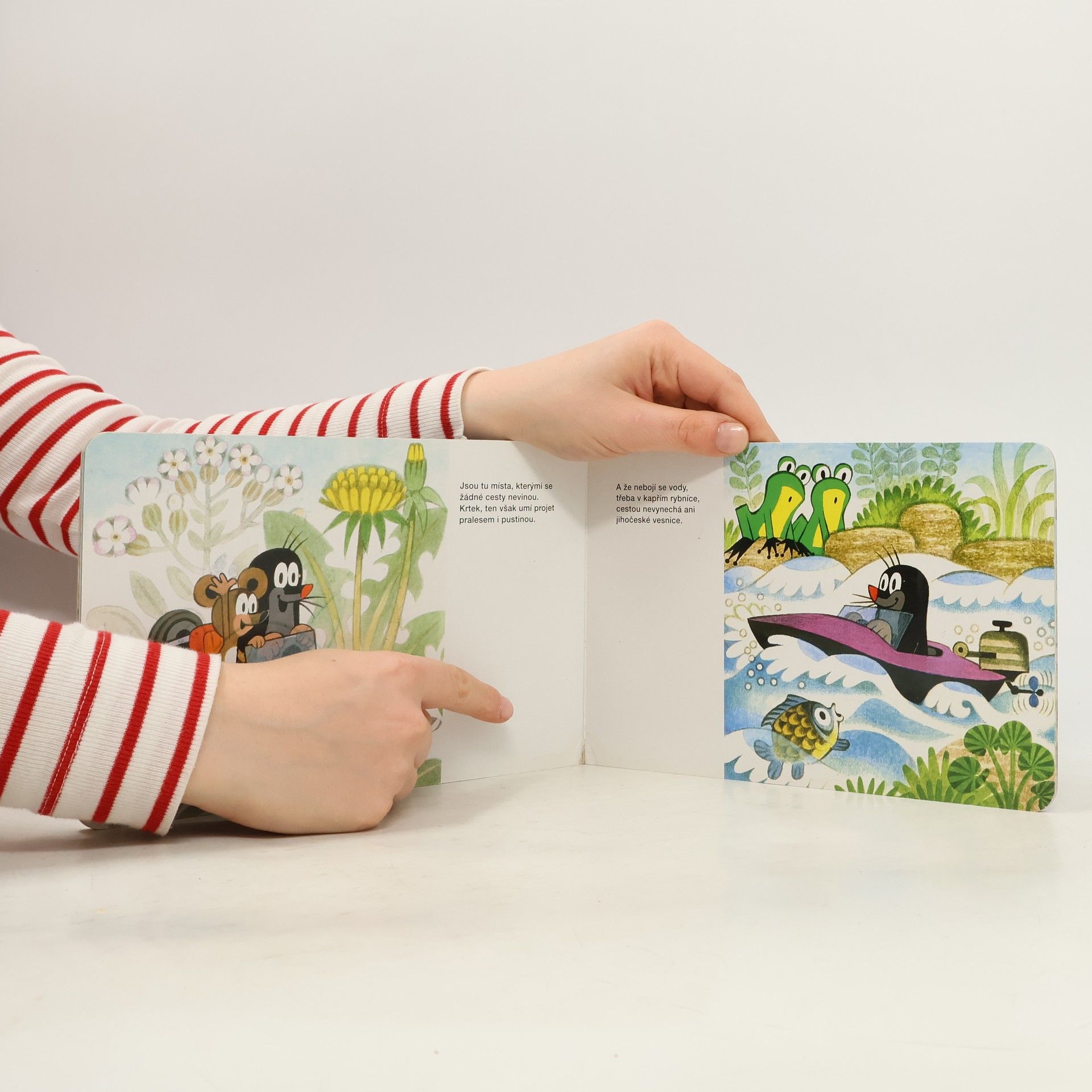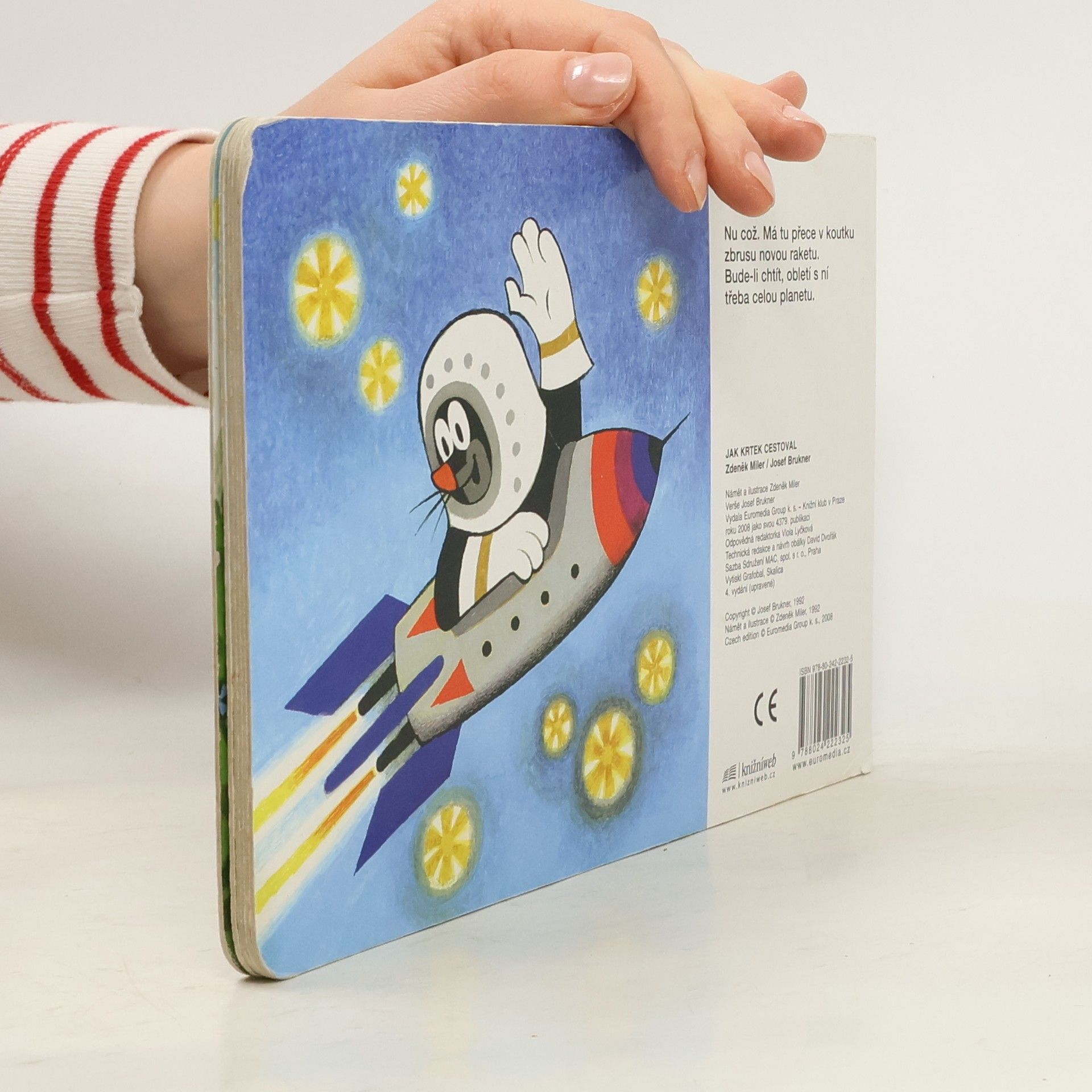 Krátká říkadla o cestování malého Krtečka - lodí a motorovým člunem po vodě, vrtulníkem a letadlem ve vzduchu, vlakem, autem a na motocyklu do přírody, ale třeba i na sněžném skútru a v ponorce.