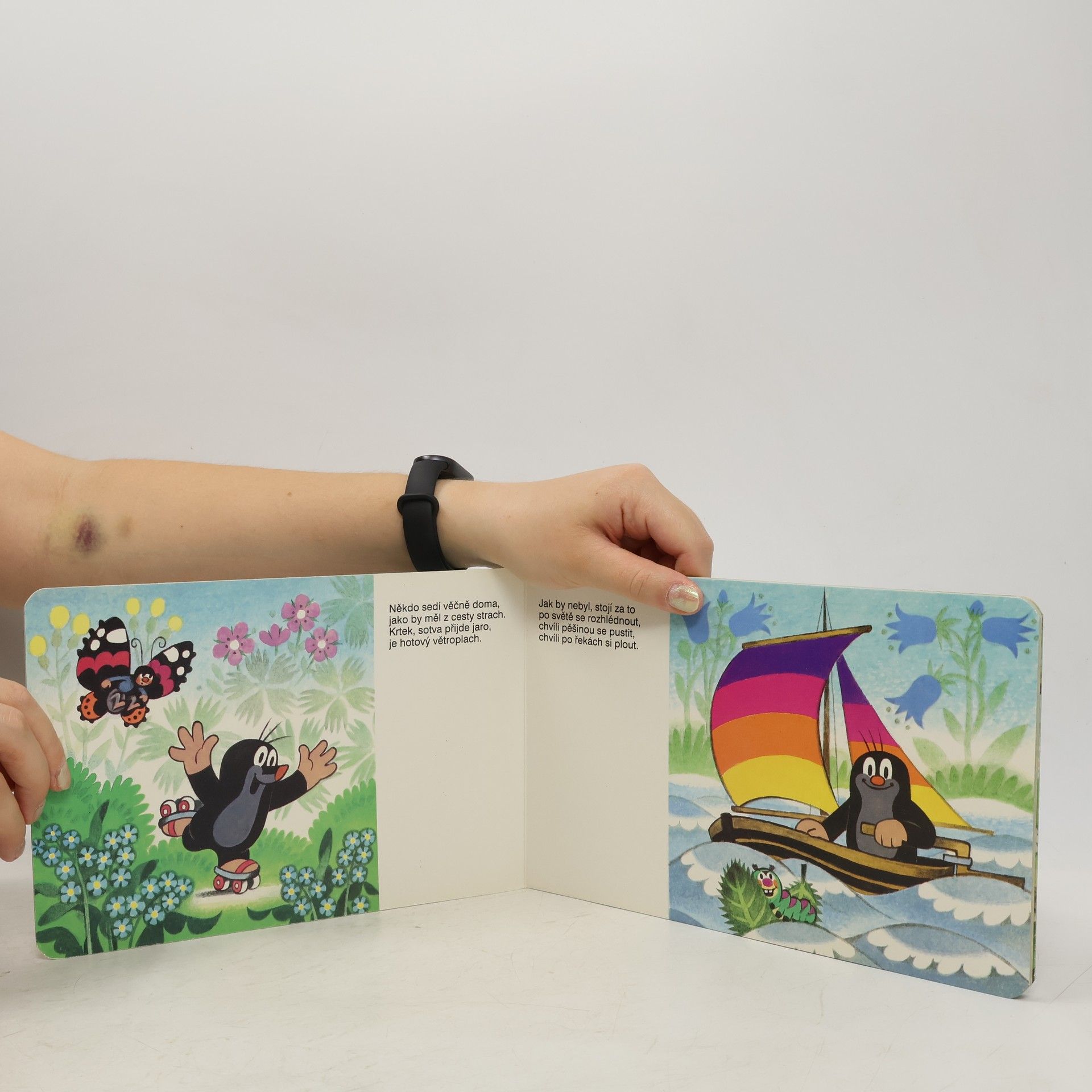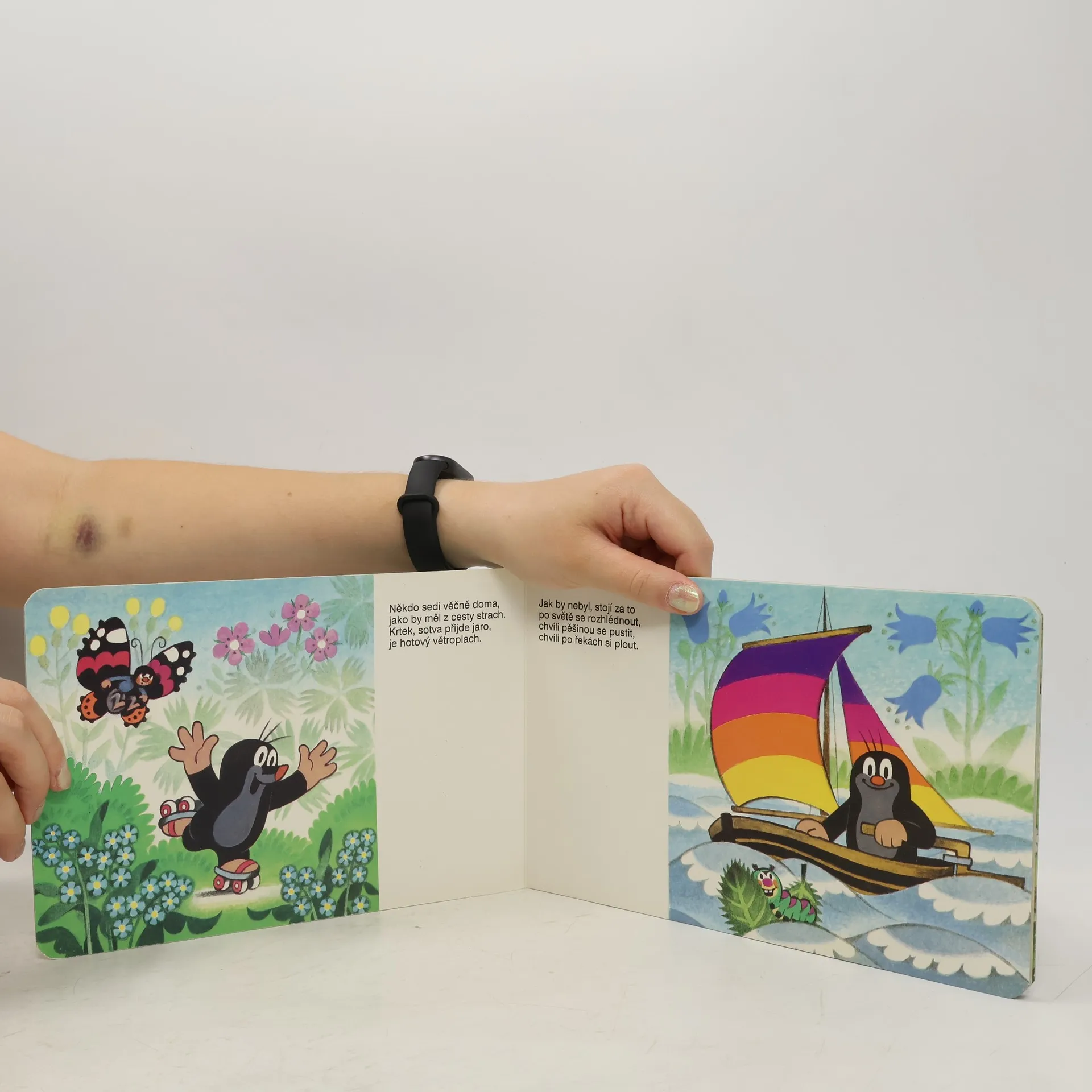Krátká říkadla o cestování malého Krtečka - lodí a motorovým člunem po vodě, vrtulníkem a letadlem ve vzduchu, vlakem, autem a na motocyklu do přírody, ale třeba i na sněžném skútru a v ponorce.