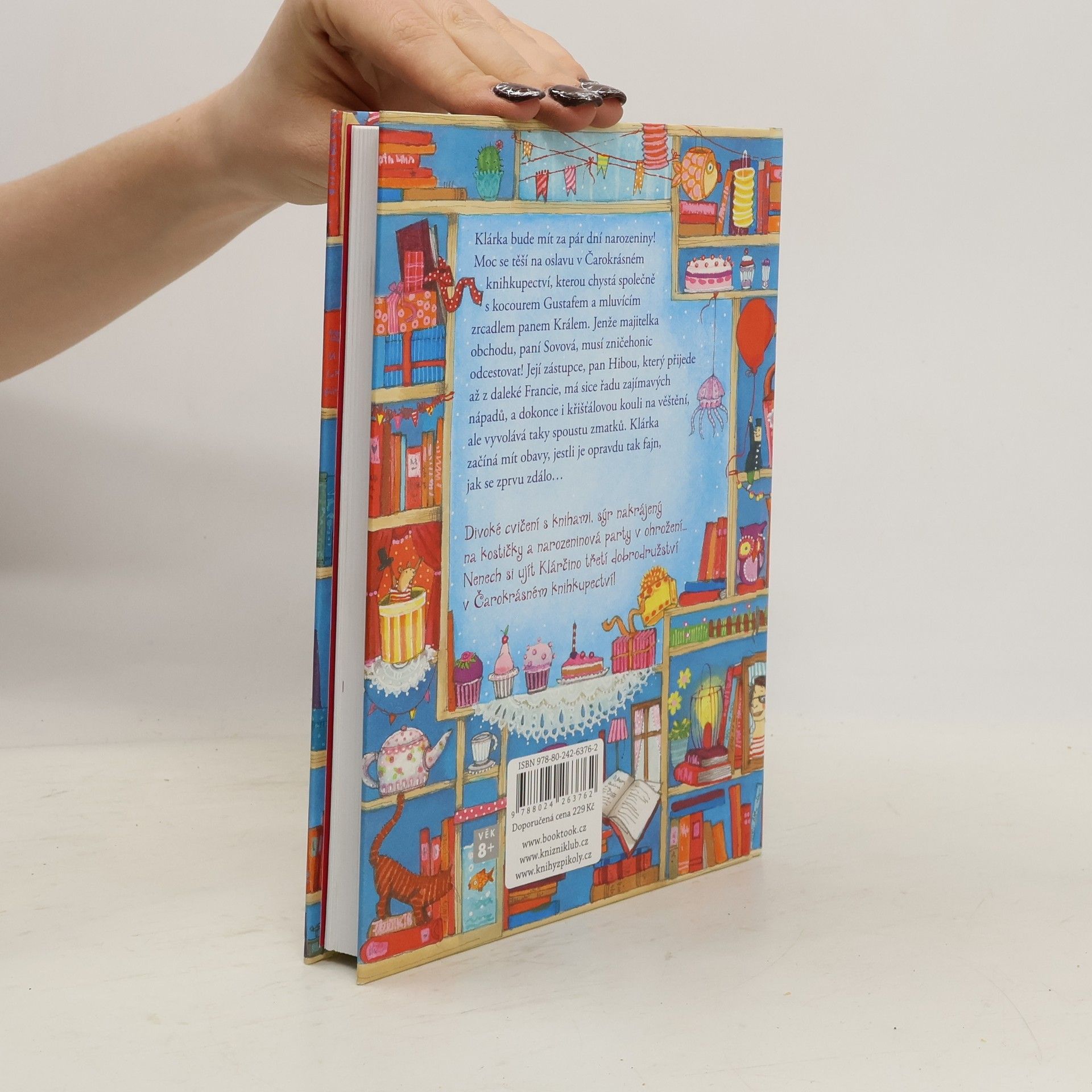 Klárka bude mít za pár dní narozeniny! Moc se těší na svoji oslavu v Čarokrásném knihkupectví, kterou chystá společně s kocourem Gustafem a mluvícím zrcadlem panem Králem. Jenže majitelka knihkupectví, paní Sovová, musí zničehonic odcestovat! Její zástupce pan Hibou má sice spoustu zajímavých nápadů a dokonce i křišťálovou kouli na věštění, ale vyvolává taky spoustu zmatků. Klárka začíná mít obavy, jestli je opravdu tak fajn, jak se zprvu zdálo… Divoké cvičení s knihami, sýr nakrájený na kostičky a narozeninová party v ohrožení – nenech si ujít Klárčino třetí dobrodružství v Čarokrásném knihkupectví! Kniha je určena dětem od 8 let.