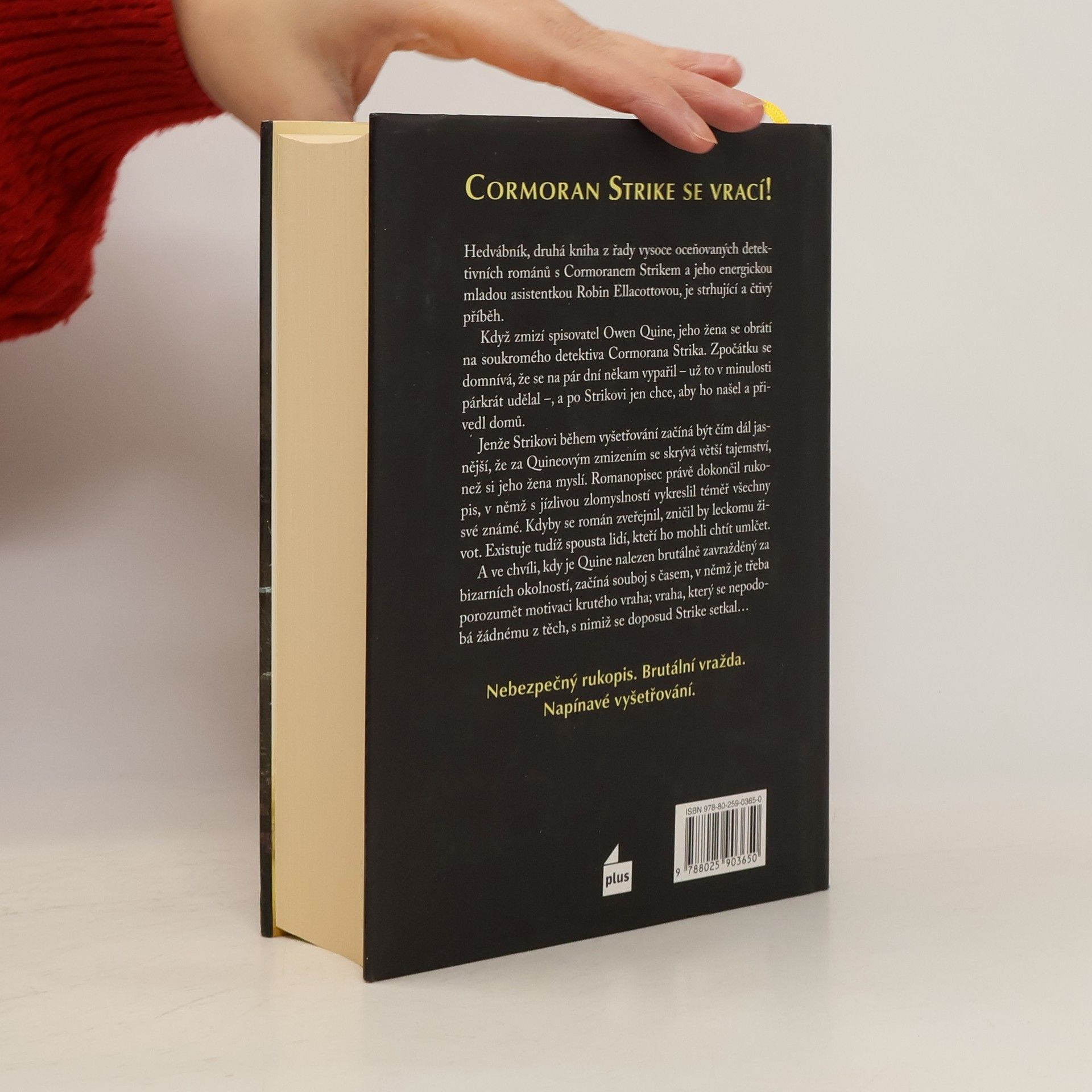 Kam se ztratil autor rukopisu, který nikdo nesmí číst a každý se ho bojí?Hedvábník, druhá kniha z řady vysoce oceňovaných detektivních románů s Cormoranem Strikem a jeho energickou mladou asistentkou Robin Ellacottovou je strhující a čtivý příběh.Když zmizí spisovatel Owen Quine, jeho žena se obrátí na soukromého detektiva Cormorana Strika. Zpočátku se domnívá, že se na pár dní někam vypařil – už to v minulosti párkrát udělal –, a po Strikovi jen chce, aby ho našel a přivedl domů.Jenže Strikovi během vyšetřování začíná být čím dál jasnější, že za Quineovým zmizením se skrývá větší tajemství, než si jeho žena myslí. Romanopisec právě dokončil rukopis, v němž s jízlivou zlomyslností vykreslil téměř všechny své známé. Kdyby se román zveřejnil, zničil by leckomu život. Existuje tudíž spousta lidí, kteří ho mohli chtít umlčet.A ve chvíli, kdy je Quine nalezen brutálně zavražděný za bizarních okolností, začíná souboj s časem, v němž je třeba porozumět motivaci krutého vraha; vraha, který se nepodobá žádnému z těch, s nimiž se doposud Strike setkal…Nebezpečný rukopis. Brutální vražda. Napínavé vyšetřování.