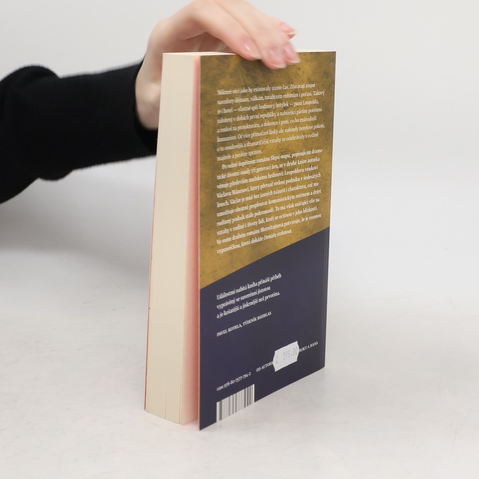 Některé věci jakoby existovaly mimo čas. Zůstávají stejné navzdory dějinám, válkám, totalitním režimům i počasí. Takový je i hotel pana Leopolda, vlastně spíše hodinový hotýlek, založený v dobách první republiky a nabízející potěšení a rozkoš párům za protektorátu, a dokonce i poté, co ho znárodnili komunisté. Oč více přímočaré lásky ale nabízely hotelové pokoje, o to osudovější a dramatičtější vztahy se odehrávaly v rodině majitele a posléze správce. Po velmi úspěšném románu Slepá mapa popisujícím dramatické životní osudy tří generací žen se v nové knize autorka věnuje především postavě jediné: Leopoldovu vnukovi Václavu Mánesovi, který převzal vedení podniku v šedesátých letech. Václav je muž bez vlastností, jasných názorů i charakteru, což mu umožňuje obratně proplouvat komunistickým režimem a držet rodinný podnik stále pohromadě, má však zničující vliv na vztahy v rodině i životy lidí, kteří se ocitnou v jeho blízkosti. Mornštajnová popisuje a vysvětluje Václavovy skutky tak obratně, že se teprve na konci knihy zděsíme, komu jsme to vlastně po celou dobu drželi palce.