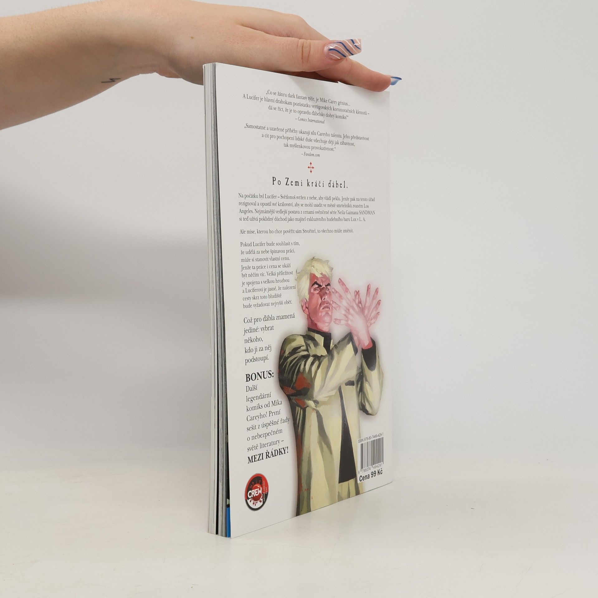 Po Zemi kráčí ďábel... Na počátku byl Lucifer - Světlonoš svržen z nebe, aby vládl peklu. Jenže pak na tento úřad rezignoval a opustil své království, aby se mohl usadit ve městě smrtelníků zvaném Los Angeles. Nejznámější vedlejší postava z cenami ověnčené série Neila Gaimana Sandman si teď užívá poklidný důchod jako majitel exkluzivního hudebního baru Lux v L.A. Ale mise, kterou ho chce pověřit sám Stvořitel, to všechno může změnit. Pokud Lucifer bude souhlasit s tím, že udělá za nebe špinavou práci, může si stanovit vlastní cenu. Jenže ta práce i cena se ukáží být něčím víc. Velká příležitost je spojena s velkou hrozbou a Luciferovi je jasné, že nalezení cesty skrz toto bludiště bude vyžadovat nejvyšší oběť. Což pro ďábla znamená jediné: vybrat někoho, kdo ji za něj podstoupí. Ve verzi, kterou nakladatelství Crew připravilo speciálně pro Pevnost, najdete počátek Luciferova příběhu, čili Světlonošovu cestu tak, jak vyšla poprvé, dále kratší příběh nazvaný Ďábel právě teď nemůže k telefonu a jako bonus pořádnou porci dalšího skvělého komiksu Mika Careyho, Mezi řádky.