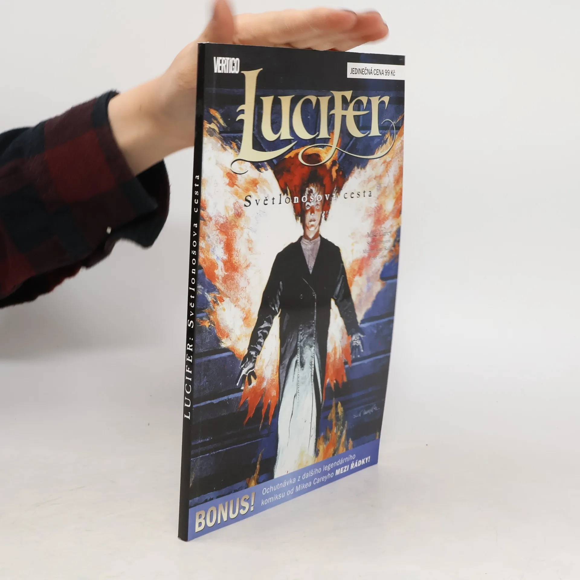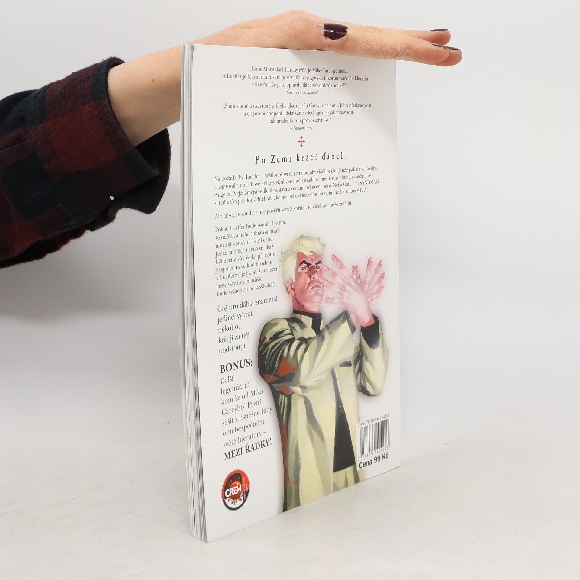 Po Zemi kráčí ďábel... Na počátku byl Lucifer - Světlonoš svržen z nebe, aby vládl peklu. Jenže pak na tento úřad rezignoval a opustil své království, aby se mohl usadit ve městě smrtelníků zvaném Los Angeles. Nejznámější vedlejší postava z cenami ověnčené série Neila Gaimana Sandman si teď užívá poklidný důchod jako majitel exkluzivního hudebního baru Lux v L.A. Ale mise, kterou ho chce pověřit sám Stvořitel, to všechno může změnit. Pokud Lucifer bude souhlasit s tím, že udělá za nebe špinavou práci, může si stanovit vlastní cenu. Jenže ta práce i cena se ukáží být něčím víc. Velká příležitost je spojena s velkou hrozbou a Luciferovi je jasné, že nalezení cesty skrz toto bludiště bude vyžadovat nejvyšší oběť. Což pro ďábla znamená jediné: vybrat někoho, kdo ji za něj podstoupí. Ve verzi, kterou nakladatelství Crew připravilo speciálně pro Pevnost, najdete počátek Luciferova příběhu, čili Světlonošovu cestu tak, jak vyšla poprvé, dále kratší příběh nazvaný Ďábel právě teď nemůže k telefonu a jako bonus pořádnou porci dalšího skvělého komiksu Mika Careyho, Mezi řádky.