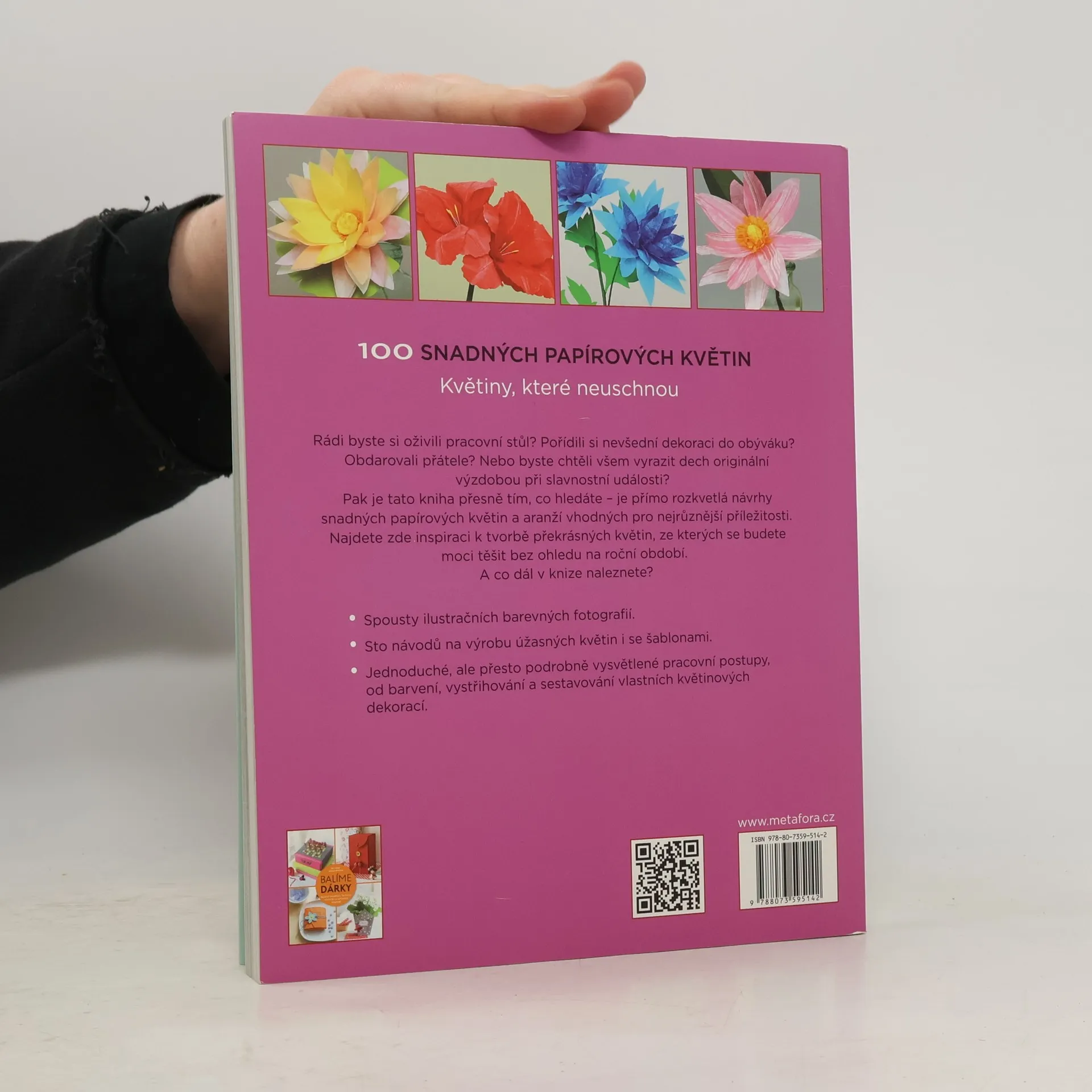 Květiny vždy potěší. A to nejen ty skutečné, jimž musíte vyměňovat vodu ve váze a nakonec je zvadlé vyhodíte, ale i ty, které nezvadnou nikdy – papírové. Kniha nabízí sto návodů na výrobu úžasných papírových květin. Jednoduché, dopodrobna vysvětlené pracovní postupy, od barvení, vystřihování a sestavování vlastních nádherných květinových vazeb. Rádi byste si oživili pracovní stůl? Pořídili si nevšední dekoraci do obýváku? Obdarovali přátele? Nebo byste chtěli všem vyrazit dech originální výzdobou při slavnostní události? Pak je tato kniha přesně tím, co hledáte. Najdete zde inspiraci k tvorbě překrásných květin, z nichž se budete moci těšit bez ohledu na roční období. Papírové květiny rozzáří barvami svatební tabuli, vyniknou jako nápaditá výzdoba interiérů a poslouží i jako drobný dárek nebo ozdoba do vlasů. Mimo přehledných návodů najdete v knize také neodolatelné ilustrační barevné fotografie a detailní šablony.