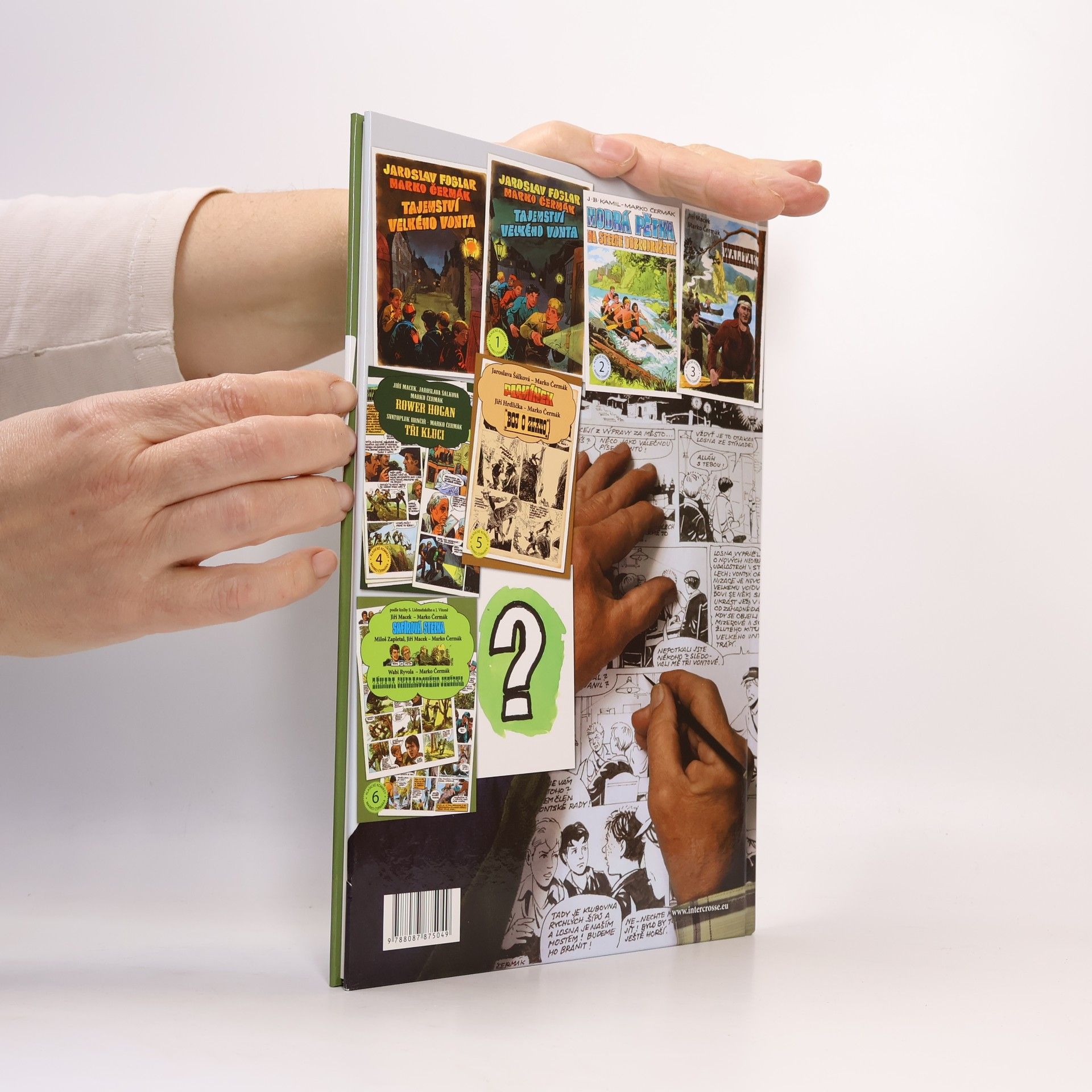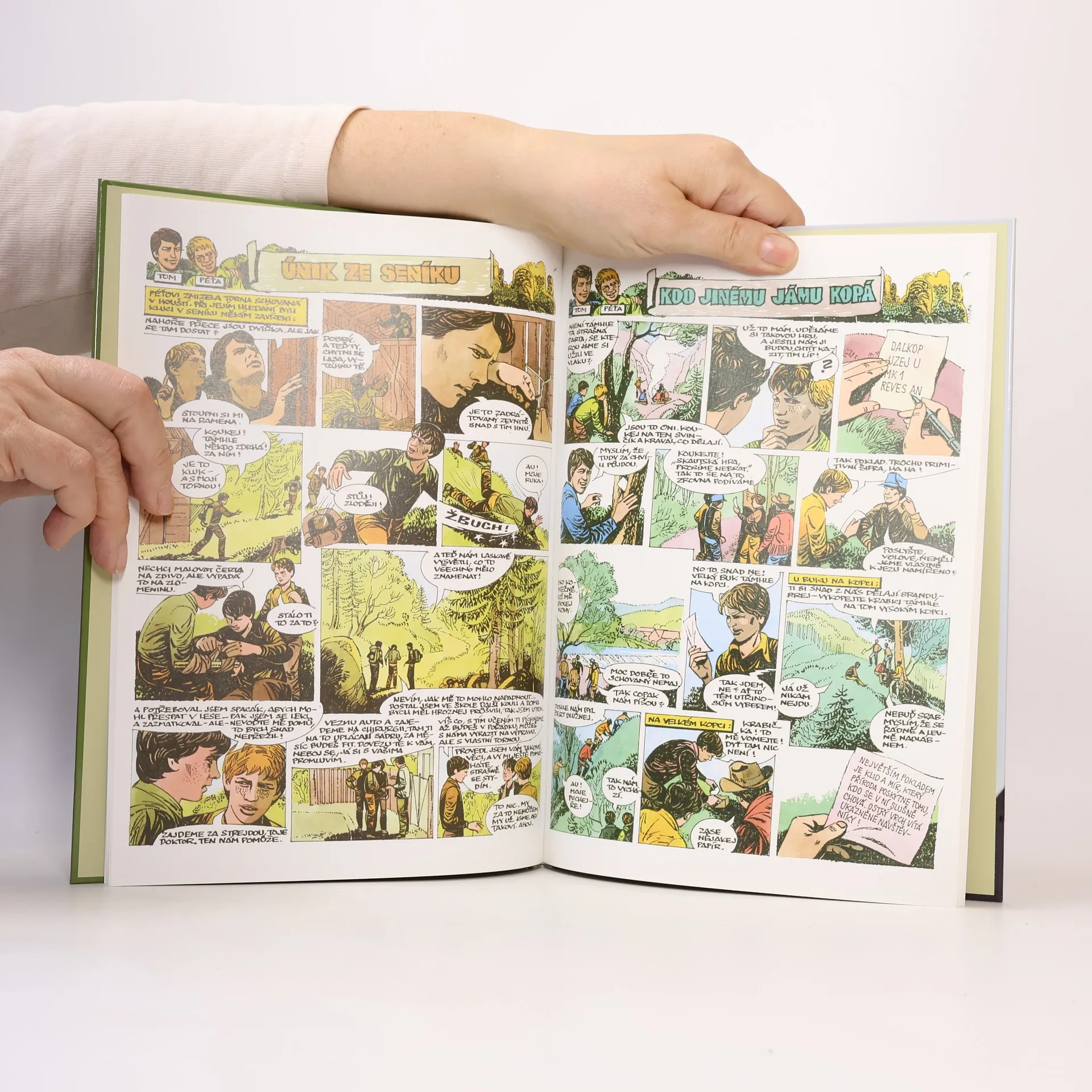 První příběh je inspirován stejnojmennou knihou S. Lidmaňského a J. Vitoně o prázdninovém putování skupiny chlapců, kteří po splnění řady úkolů získávají právo stát se členy trampské osady. Druhý dobrodružný komiks byl provázán s psanými Příběhy Starého vlka z časopisu Skaut - Junák a byl nazýván podle hlavních protagonistů Tom a Péťa. A poslední napínavý příběh vtáhne čtenáře do opuštěného lomu v těžko přístupné krajině, který ukrývá tajemství. Tento příběh vyšel začátkem 90. let v časopisu Stezka. Komiksy: Safírová stezka Scénář: Jiří Macek Kresba: Marko Čermák Tom a Péťa Scénář: Miloš Zapletal, Jiří Macek Kresba: Marko Čermák Záhada smaragdového jezírka Scénář: Wabi Ryvola Kresba: Marko Čermák