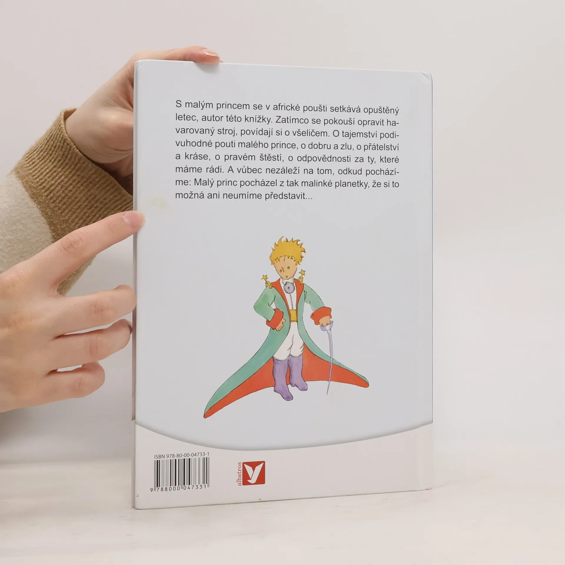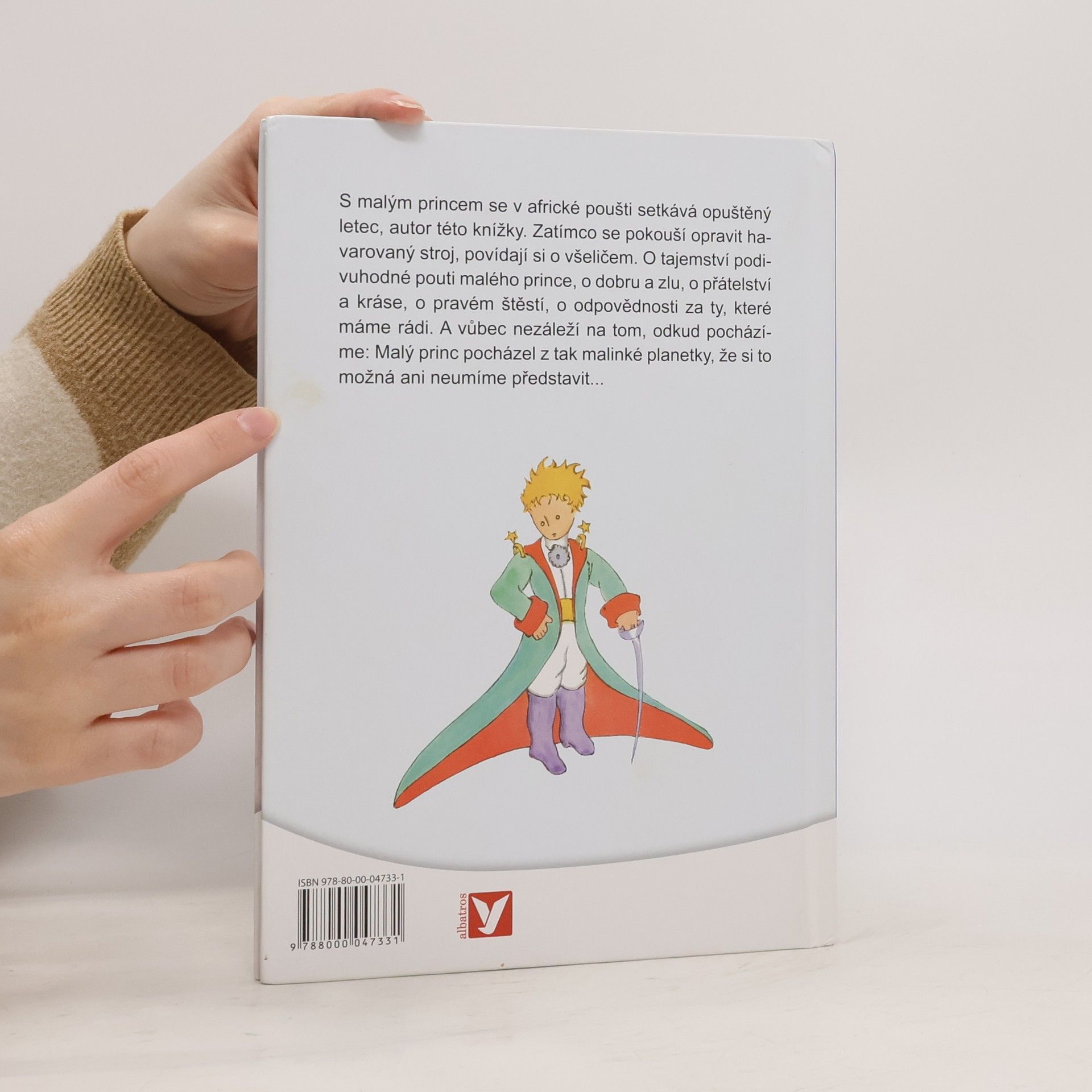 S Malým princem se v africké poušti setkává opuštěný letec, autor této knížky. Zatímco se pokouší opravit havarovaný stroj, povídají si o všeličem. O tajemství podivuhodné pouti Malého prince, o dobru a zlu, o přátelství a kráse, o pravém štěstí, o odpovědnosti za ty, které máme rádi. A vůbec nezáleží na tom, odkud pocházíme: Malý princ pocházel z tak malinké planetky, že si to možná ani neumíme představit...