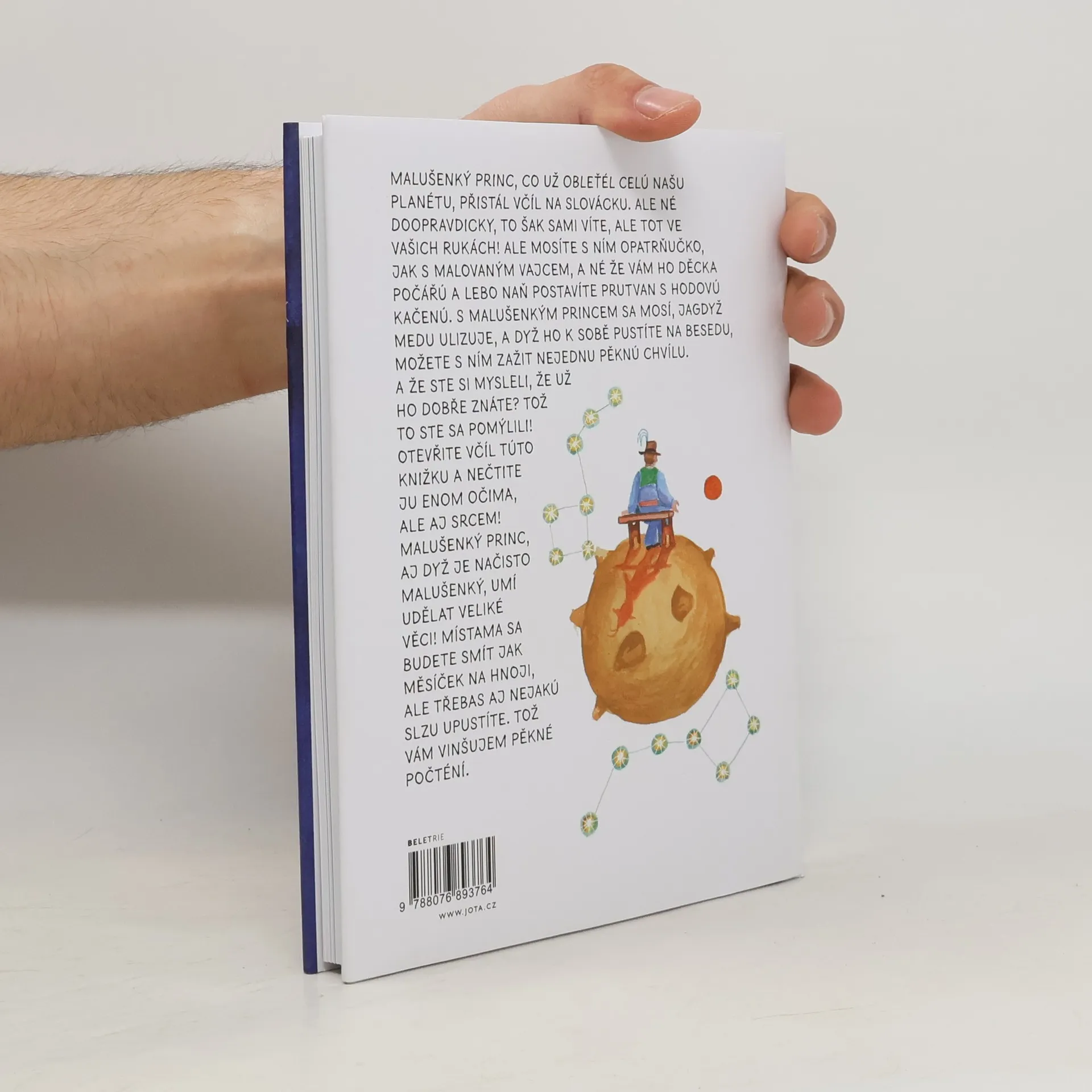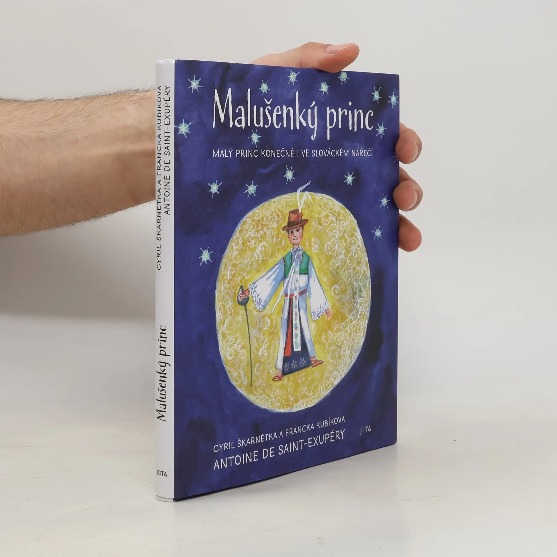 Malý princ a Slovácko? Ba! Malý princ se po Brně, Valašsku a Krkonoších vydává i na Slovácko! Malušenký princ, co už obleťél celú našu planétu, přistál včíl na Slovácku. Ale né doopravdicky, to šak sami víte, ale tot ve vašich rukách! Ale mosíte s ním opatrňučko, jak s malovaným vajcem, a né že vám ho děcka počářú a lebo naň postavíte prutvan s hodovú kačenú. S malušenkým princem sa mosí, jagdyž medu ulizuje, a dyž ho k sobě pustíte na besedu, možete s ním zažit nejednu pěknú chvílu. A že ste si mysleli, že už dobře znáte? Tož to ste sa pomýlili! Otevřite včíl túto knižku a nečtite ju enom očima, ale aj srcem! Kultovní kniha francouzského spisovatele a pilota Antoina de Saint-Exupéryho byla přeložena do více než 350 jazyků a dialektů. Každý ji zná. Vášnivá sběratelka knižních vydání Malého prince Martina Dlabajová si dlouho lámala hlavu tím, jak něžný příběh převést také do svérázného Slovácka. V její práci jí pomohli překladatelé Cyril Škarnétka a Francka Kubíkova. Knihu svými ilustracemi doprovází František Pavlica. Počtou si nejen lidé ze Slovácka. Laik se přiučí místnímu nářečí, odborník znásobí své znalosti a všichni získají nový pohled na známý příběh z nezvyklé perspektivy.