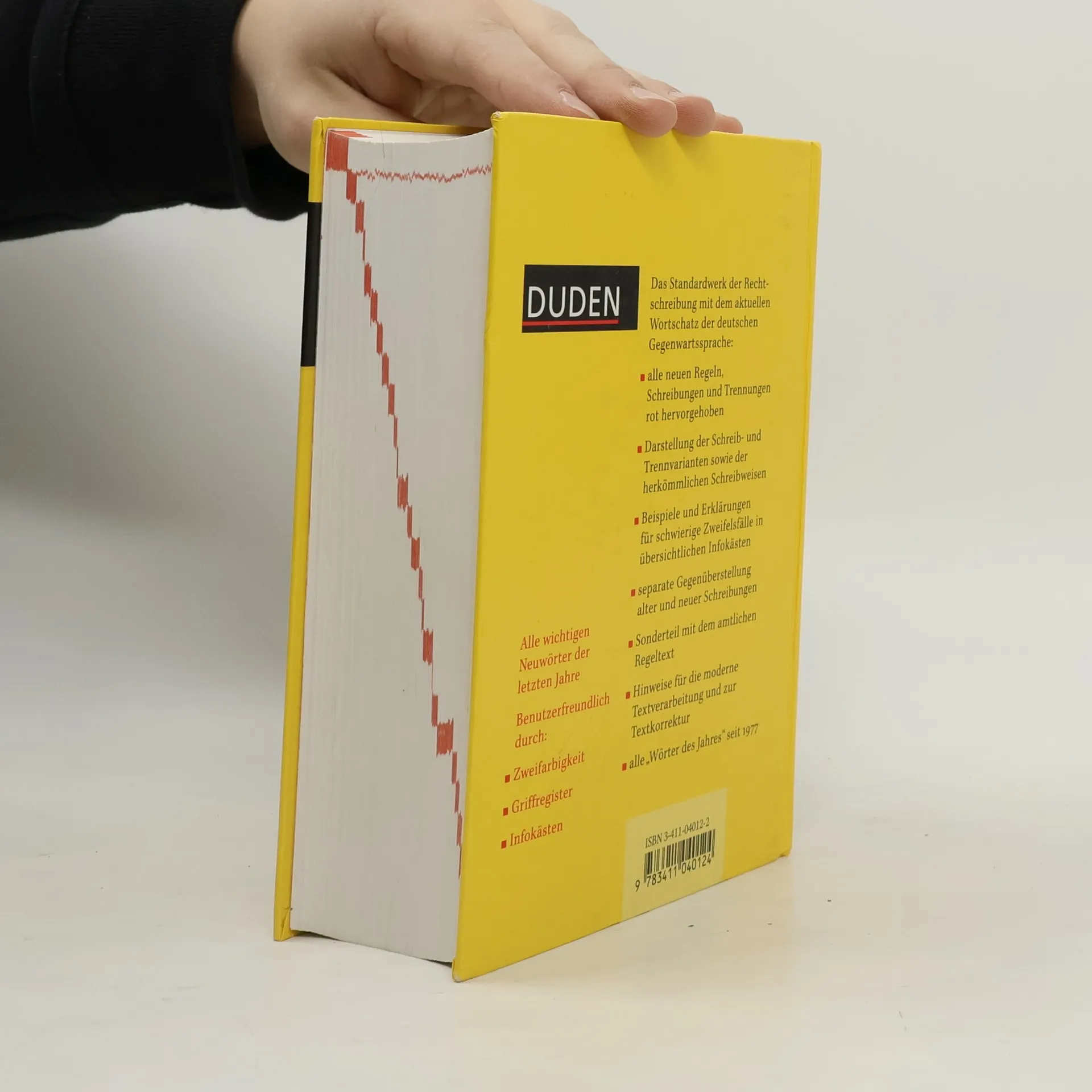 Ganz im sommerlich gelben Outfit präsentiert sich der aktuelle Duden zur neuen Rechtschreibung. In dieser 22., völlig neu bearbeiteten Auflage sind alle neuen Rechtschreibregeln verbindlich zusammengefasst. Zudem haben es 5.000 neue Wörter geschafft, Einzug in das Standardwerk zu halten -- von "aufbrezeln" über "Bimbes" und "Maschendrahtzaun" bis hin zum "Warmduscher". Der Duden 2000 verzeichnet alle neuen und alle herkömmlichen Schreib- und Trennweisen eines Wortes und informiert somit umfassend über den heutigen Stand der deutschen Rechtschreibung. Um das Nachschlagen und damit den Umstieg auf die neuen Regeln zu erleichtern, wurde das gesamte Lay-out des Innenteils verbessert. Allen voran bieten die 300 farbig hervorgehobenen Infokästen zu Stichwörtern, deren Schreibung und korrekter Gebrauch besondere Schwierigkeiten bereiten, eine gute Übersicht. Informativ und gut verständlich ist auch der einleitende Teil "Rechtschreibung und Zeichensetzung". Die Regeln sind nach Themen wie Apostroph oder Bindestrich geordnet und farbig unterlegt. Ausführliche Beispiele zu den einzelnen Regeln helfen dabei, Unsicherheiten zu beseitigen. Somit ist der Duden 2000 mit seinen insgesamt 120.000 Stichwörtern und den über 500.000 Beispielen ein sehr vielseitiges deutsches Wörterbuch, das alle Fragen der sprachlichen Alltagspraxis beantwortet. --Bettina Wenzel und Herwig Slezak