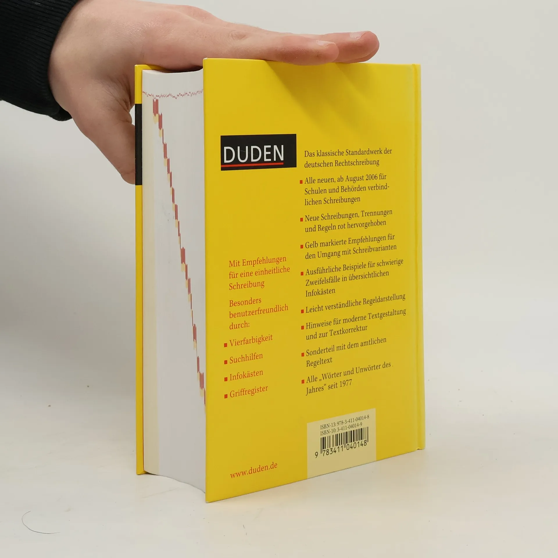 Das umfassende Standardwerk auf der Grundlage der neuen amtlichen Regeln. Rund 130.000 Stichwörter, davon 3.000 neue Wörter. Über 500.000 Beispiele, Bedeutungserklärungen und Angaben zu Worttrennung, Aussprache, Grammatik, Etymologie und Stil. In 300 übersichtlichen Infokästen werden schwierige Zweifelsfälle der deutschen Sprache anhand von Beispielen ausführlich erklärt. NEU: mit Dudenempfehlung bei mehreren zulässigen Schreibweisen. NEU: jetzt vierfarbig zur besseren Orientierung.