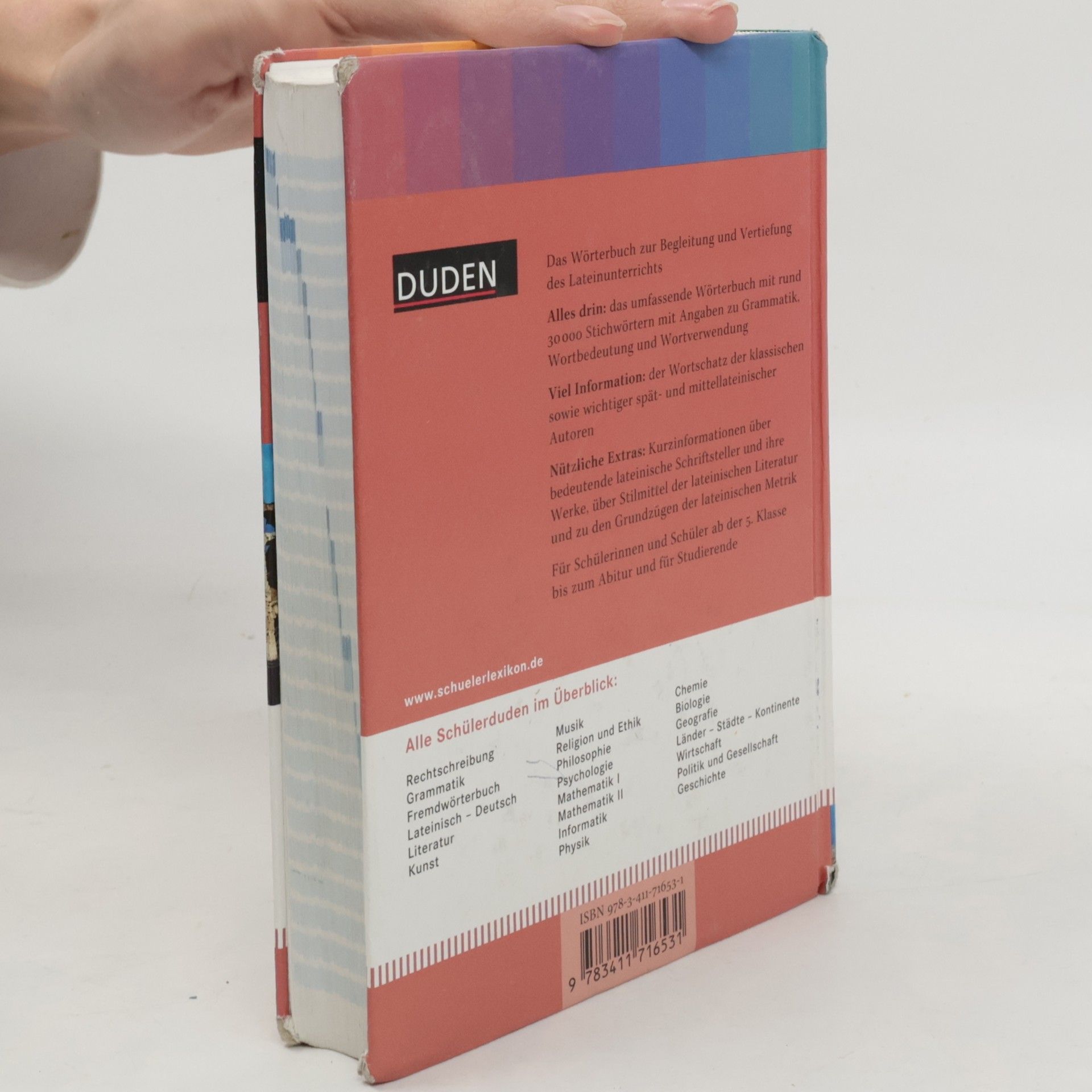 Dieses Wörterbuch enthält mit rund 30.000 Stichwörtern den lateinischen Wortschatz von der ersten Unterrichtsstunde bis zum Studium. Alle Stichwörter sind mit Angaben zur Grammatik, Wortbedeutung und Wortverwendung versehen und übersichtlich gegliedert. Der farbige Band berücksichtigt neben dem Wortschatz der Klassiker auch denjenigen der wichtigsten spät- und mittellateinischen Autoren. Ergänzt mit Sonderseiten zu lateinischen Autoren und lateinischer Literatur. Für Schüler von der 5. Klasse bis zum Abitur sowie für Studierende.