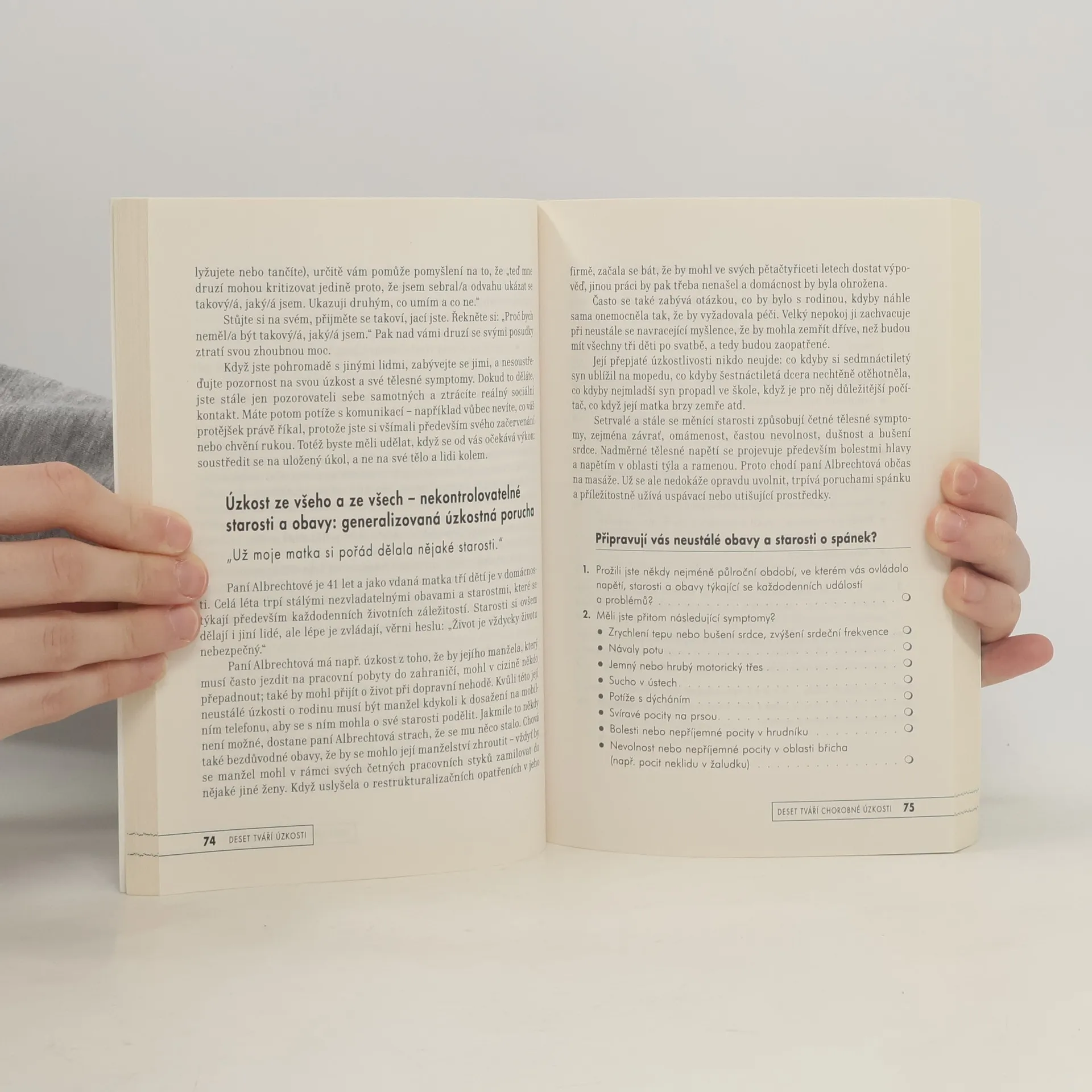 V současné době onemocní nějakou formou úzkostné poruchy v průběhu svého života každý čtvrtý člověk z populace. U žen je toto onemocnění nejčastějším psychickým problémem, u mužů druhým nejčastějším po problémech s alkoholem. Zkušení autoři řady úspěšných knih popisují deset tváří úzkosti, tedy formy úzkostných poruch. U jednotlivých poruch vysvětlují názorně jejich vznik, dynamiku, specifické projevy a nabízejí osvědčené přístupy k jejich překonání. Ty vycházejí jak z mnohaletých odborných zkušeností autorů, tak z nejnovějších poznatků kognitivně-behaviorální terapie a mentálního tréninku. Autoři nabízejí přístup zahrnující konfrontační terapii, mentální trénink, kognitivní terapii, tělesný trénink, trénink emocí, posilování sebevědomí a trénink zvládání stresu.