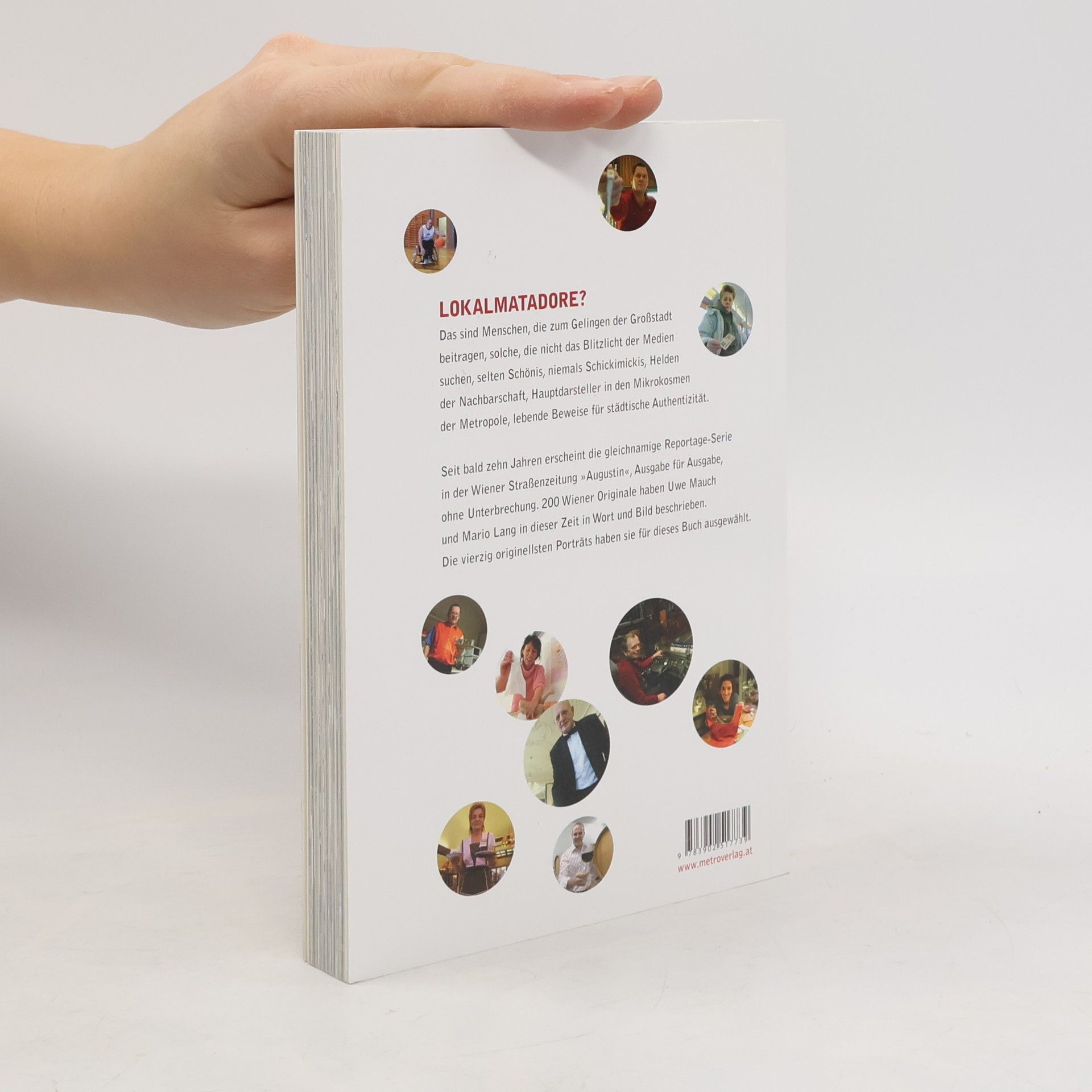 Lokalmatadore. Seit bald zehn Jahren erscheint die gleichnamige Reportage-Serie in der Wiener Straßenzeitung „Augustin“, Ausgabe für Ausgabe, ohne Unterbrechung. 200 Wiener Originale haben Uwe Mauch und Mario Lang in dieser Zeit in Wort und Bild beschrieben. Die vierzig originellsten Porträts haben sie für dieses Buch ausgewählt. Lokalmatadore? Das sind Menschen, die zum Gelingen der Großstadt beitragen, solche, die nicht das Blitzlicht der Medien suchen, selten Schönis, niemals Schickimickis, Helden der Nachbarschaft, Hauptdarsteller in den Mikrokosmen der Metropole, lebende Beweise für städtische Authentizität. Dieser ursprünglichen Definition folgen Mauch und Lang bis heute. Ihr unkonventioneller Zugang bietet die Möglichkeit, Wien abseits bekannter Klischees kennen zu lernen.