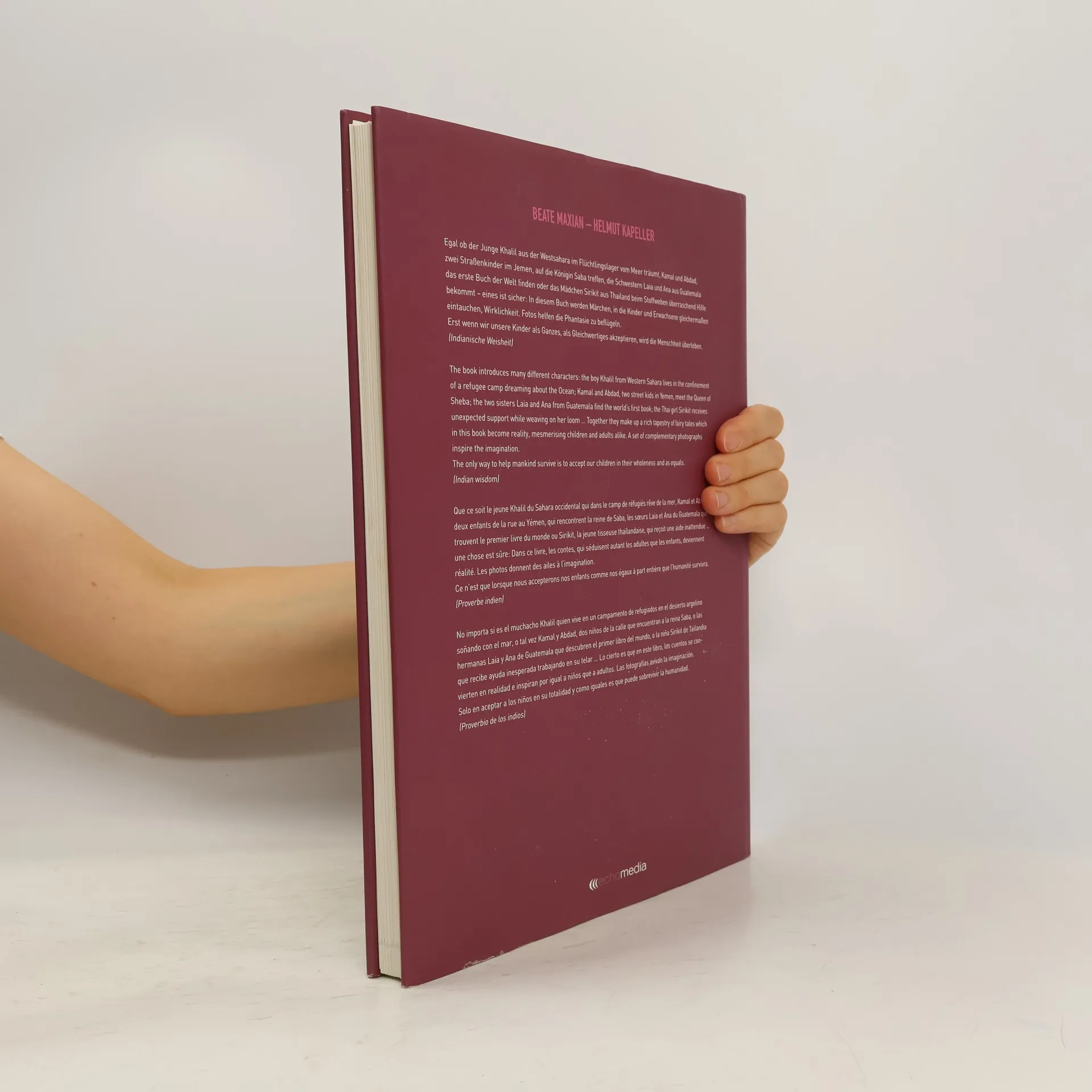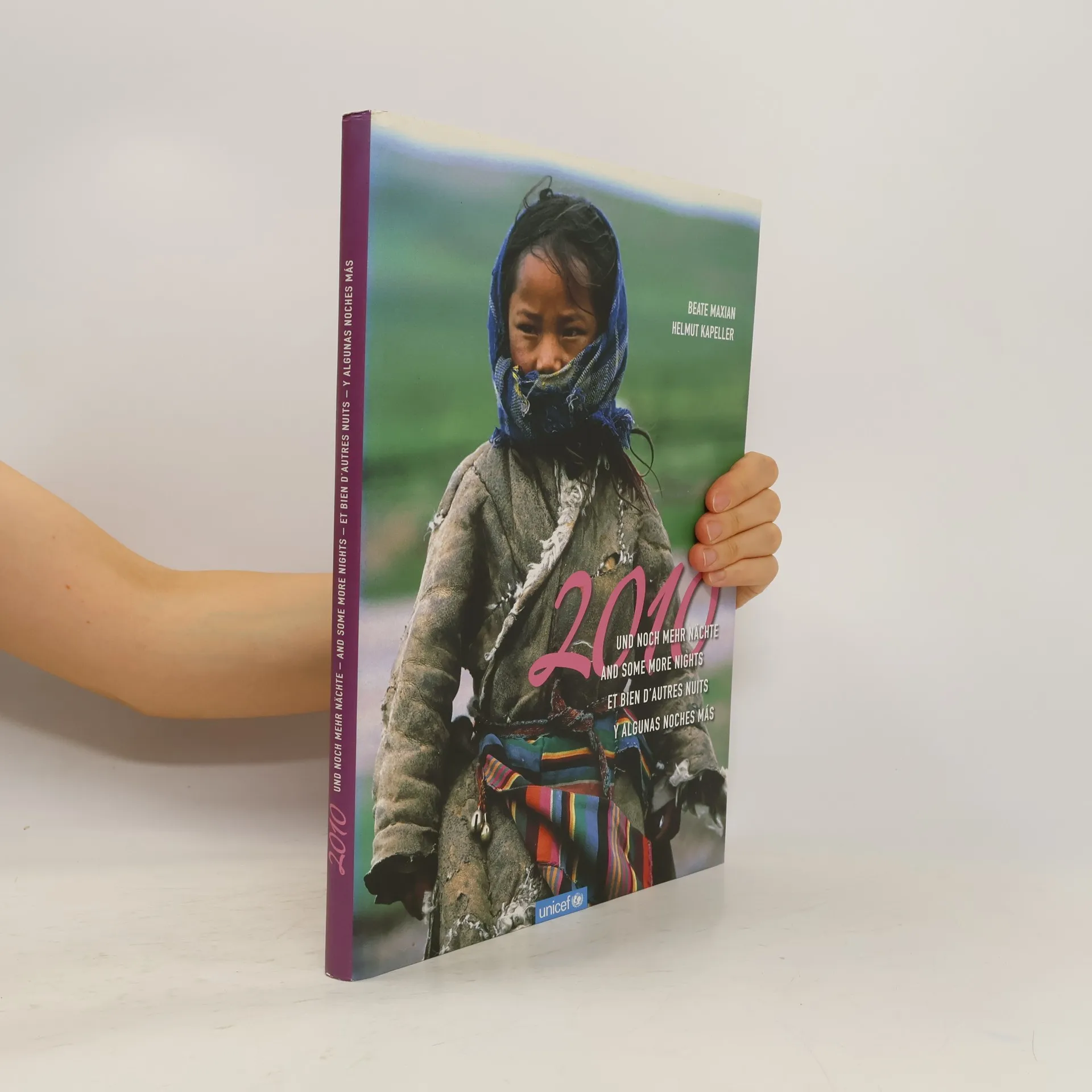 Ein (Vor-) Lesebuch mit Kinderfotos aus aller Welt das sowohl den erwachsenen Leser als auch den kleinen Zuhörer gleichermaßen fasziniert. Ein Buch für UNICEF - die Geschichten sind in vier Sprachen erzählt! Egal ob der Junge Khalil im Flüchtlingslager vom Meer träumt, Kamal und Abdad, zwei Straßenkinder im Jemen, auf die Königin Saba treffen, die Schwestern Laia und Ana aus Guatemala das erste Buch der Welt finden oder das Mädchen Sirikit aus Thailand beim Stoffweben überraschend Hilfe bekommt: Eines ist sicher, in diesem Buch werden Märchen Wirklichkeit, in die Kinder und Erwachsene gleichermaßen eintauchen. „2010 und noch mehr Nächte" heißt der Text- und Bildband in vier Sprachen (Deutsch, Englisch, Französisch und Spanisch). Märchen rund um den Globus, für Kinder und Erwachsene, geschrieben von Beate Maxian und mit zahlreichen Kinderporträts des Fotografen Helmut Kapeller illustriert. Und auch Sir Roger Moore, ehemaliger James-Bond-Darsteller und jetziger Botschafter für UNICEF, sowie UN-Generalsekretär Ban Ki-moon und Barbara Prammer, Nationalratspräsidentin der Republik Österreich, sind mit ihren persönlichen Gedanken im Buch vertreten.
