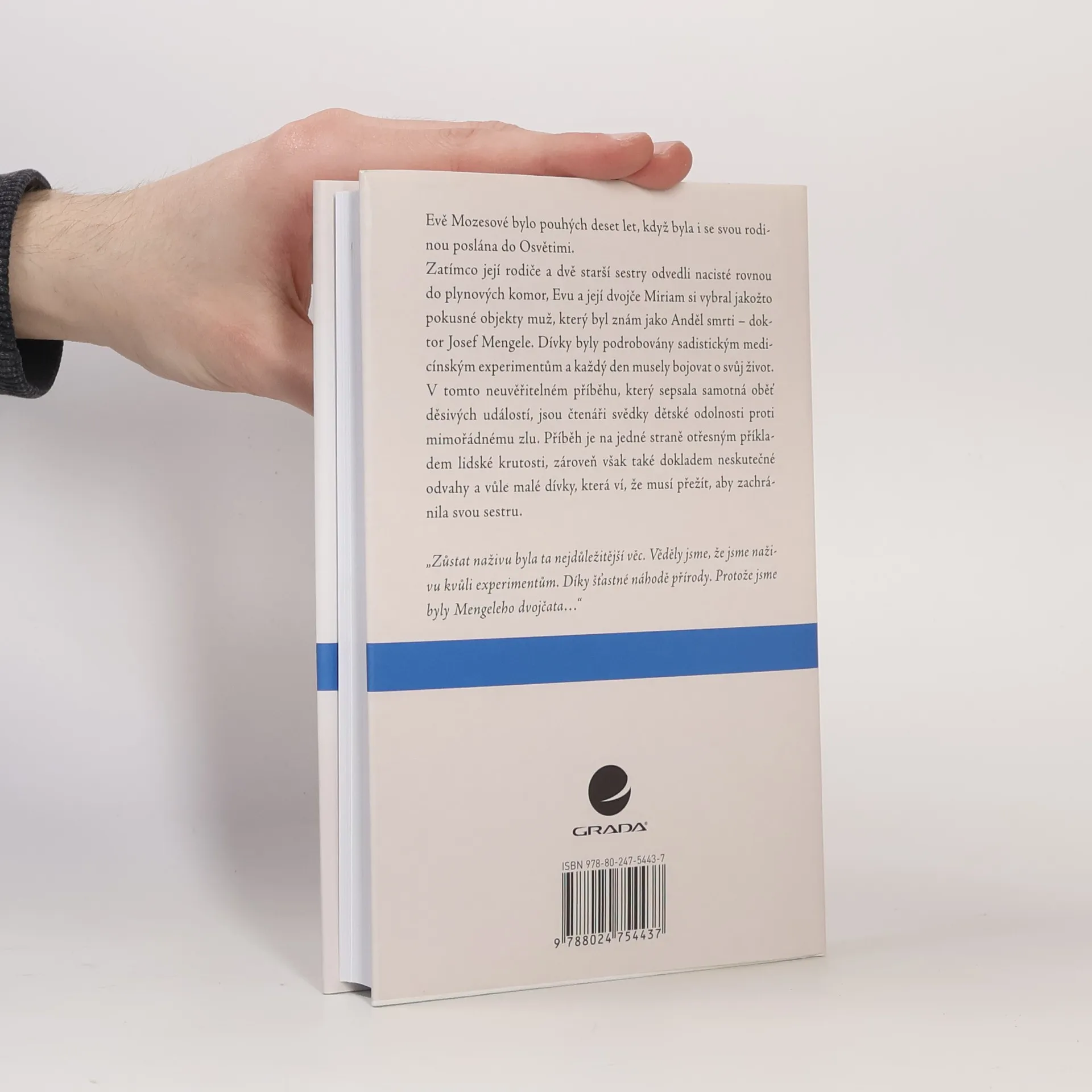 Evě Mozes bylo deset let, když byla se svou rodinou poslána do Osvětimi. Zatímco její rodiče a dvě starší sestry byli posláni do plynových komor, Evu a její dvojče Miriam si vybral coby pokusné objekty muž, který byl znám jako Anděl smrti – Dr. Josef Mengele. Dívky byly podrobeny sadistickým medicínským experimentům a musely každodenně bojovat o svůj život. V tomto neuvěřitelném příběhu, který sepsala samotná oběť děsivých událostí, jsou čtenáři svědky dětské odolnosti proti mimořádnému zlu. Eva byla například vystavena infekci, u níž Mengele věřil, že bude smrtelná, a bude pak moci provést pitvu i na Miriam, která měla sloužit jako „srovnávací vzorek“. Přežila – a dodnes neví, jaké onemocnění to bylo. Po osvobození tábora sestry založily skupinu, která podporovala bývalé oběti Mengeleho experimentů.