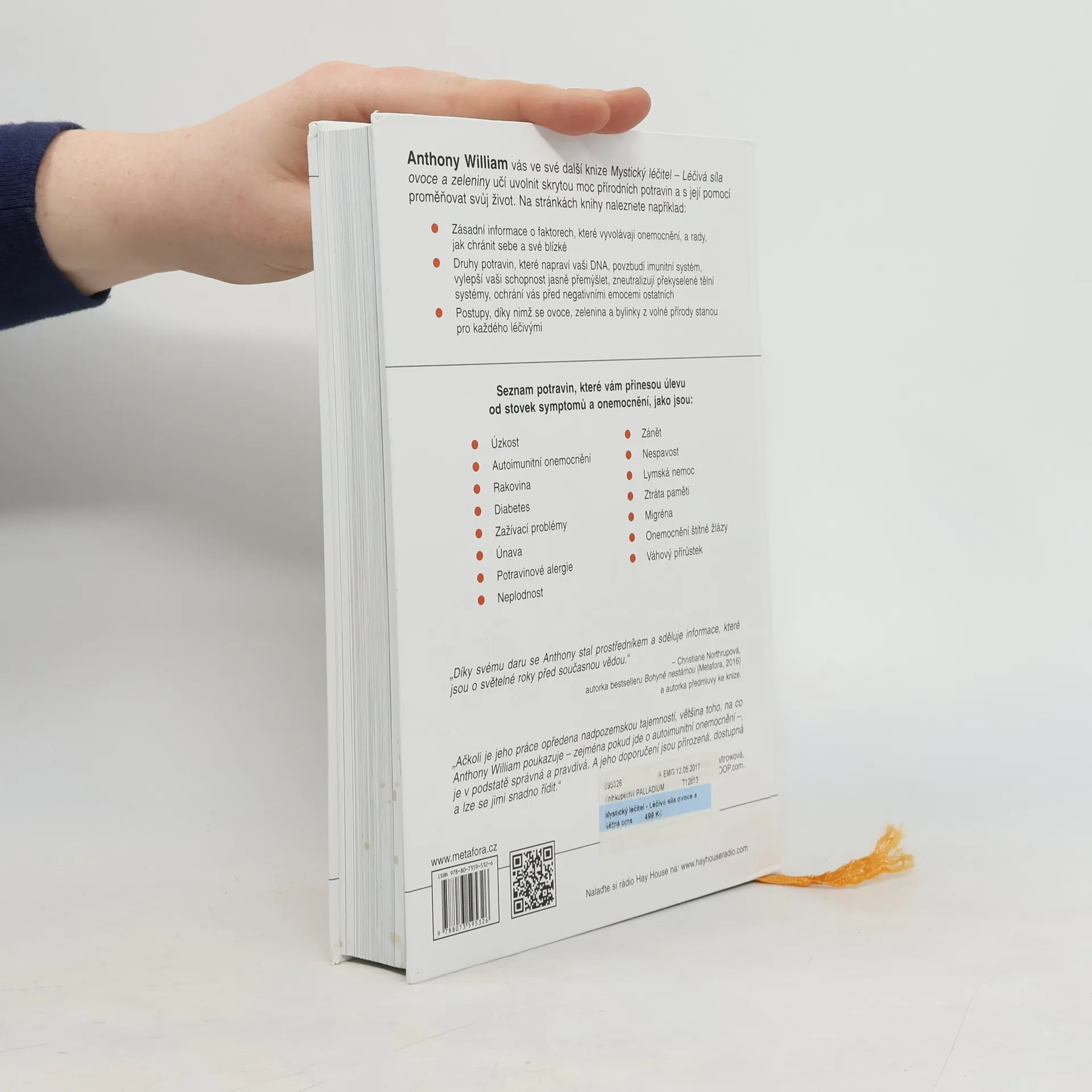 ANTHONY WILLIAM coby Mystický léčitel pomohl tisícům lidí uzdravit se z nemocí, které byly buď chybně diagnostikovány, neúčinně léčeny nebo považovány za nevyléčitelné. Božský hlas mu přímo sděluje, co je pravou příčinou bolesti či nemoci konkrétního člověka a co pro své uzdravení každý může udělat. Léčivá síla ovoce a zeleniny pojednává naprosto nově o léčivém potenciálu více než 50 druhů ovoce, zeleniny a bylinek z volné přírody. Díky informacím, které jinde nenajdete, porozumíte vlastnímu zdraví a ochráníte tak sebe a své blízké před utrpením a nemocemi. Odkryjte skrytou sílu ovoce a zeleniny a proměňte svůj život. OBJEVÍTE: •Proč jsou borůvky ovocem vzkříšení, chřest zřídlem mládí a citrony vás pozvednou, kdykoli se dozvíte něco špatného •Nejlepší potraviny pro úlevu od žlučových kamenů, hypertenze, psychické otupělosti, onemocnění štítné žlázy, migrény a stovek dalších symptomů a nemocí •Konkrétní léčivou sílu kiwi, okurek, manga, ředkviček a mnoha dalších •Nahlédnete do mechanismu nezvladatelných chutí, pochopíte, jak využít stres ve váš prospěch a jak klíčovou roli hraje ovoce v otázce plodnosti Většina informací v knize se dramaticky liší od názorů konvenční medicíny, takže neočekávejte stále stejně omílaná doporučení. Připravte se na nový pohled na potraviny jako na účinné nástroje, které vás uzdraví a přinesou vám pohodu i dobrou kondici.