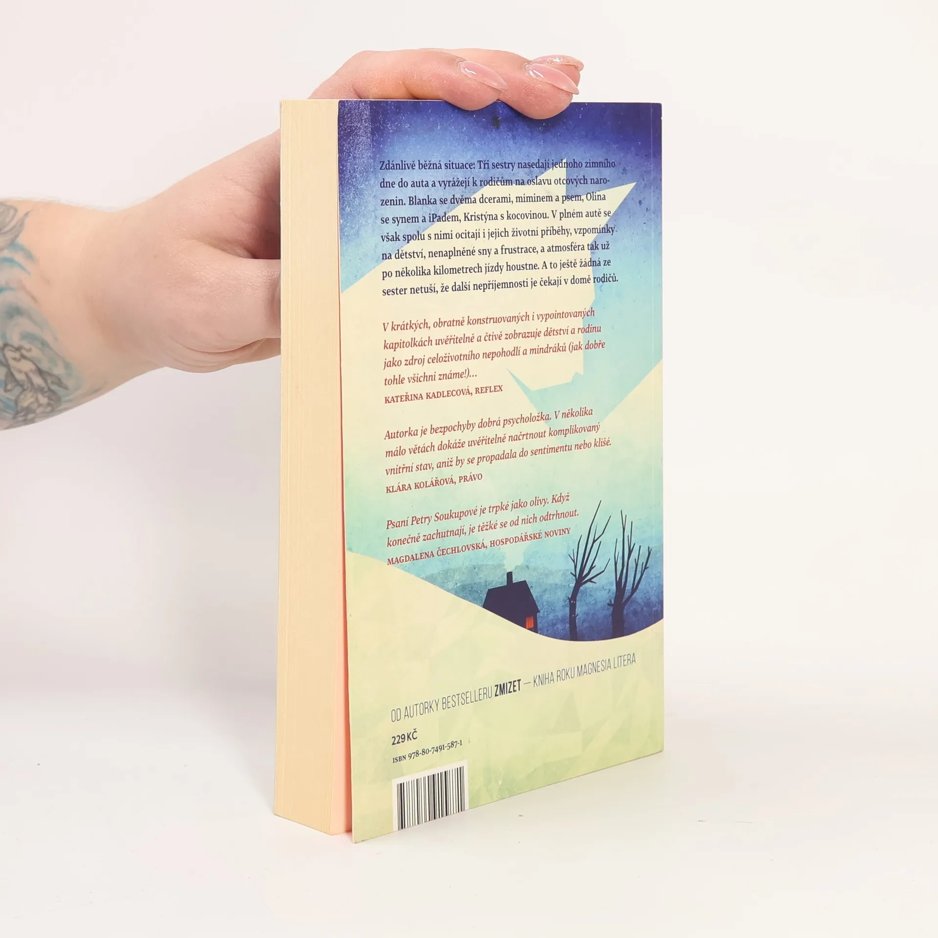 Zdánlivě běžná situace: Tři sestry nasedají jednoho zimního dne do auta a vyrážejí k rodičům na oslavu narozenin svého otce. Blanka se dvěma dcerami, miminem a psem, Olina se synem a tabletem, Kristýna s kocovinou. V jednom autě se však spolu s nimi ocitají i jejich životní příběhy, vzpomínky na dětství, nenaplněné sny a frustrace a sedmimístné Volvo XC se tak už po několika kilometrech jízdy mění v napěchovaný papiňák, který každou chvíli hrozí výbuchem. A to ještě žádná ze sester netuší, že další drama je čeká v domě rodičů. V rodinných vztazích a na první pohled obyčejných událostech dokáže Soukupová zachytit otisky spletitých osudů, dávných zážitků a frustrací s takovou bravurou, že před čtenářem vyvstávají jako jedinečná životní dramata. Autorčin typický způsob vyprávění s předstíranou ledabylostí a neokázale podtrhuje autenticitu příběhu a vtahuje do něj čtenáře natolik, že se sám stává jedním z pasažérů auta jedoucího na rodinnou oslavu.