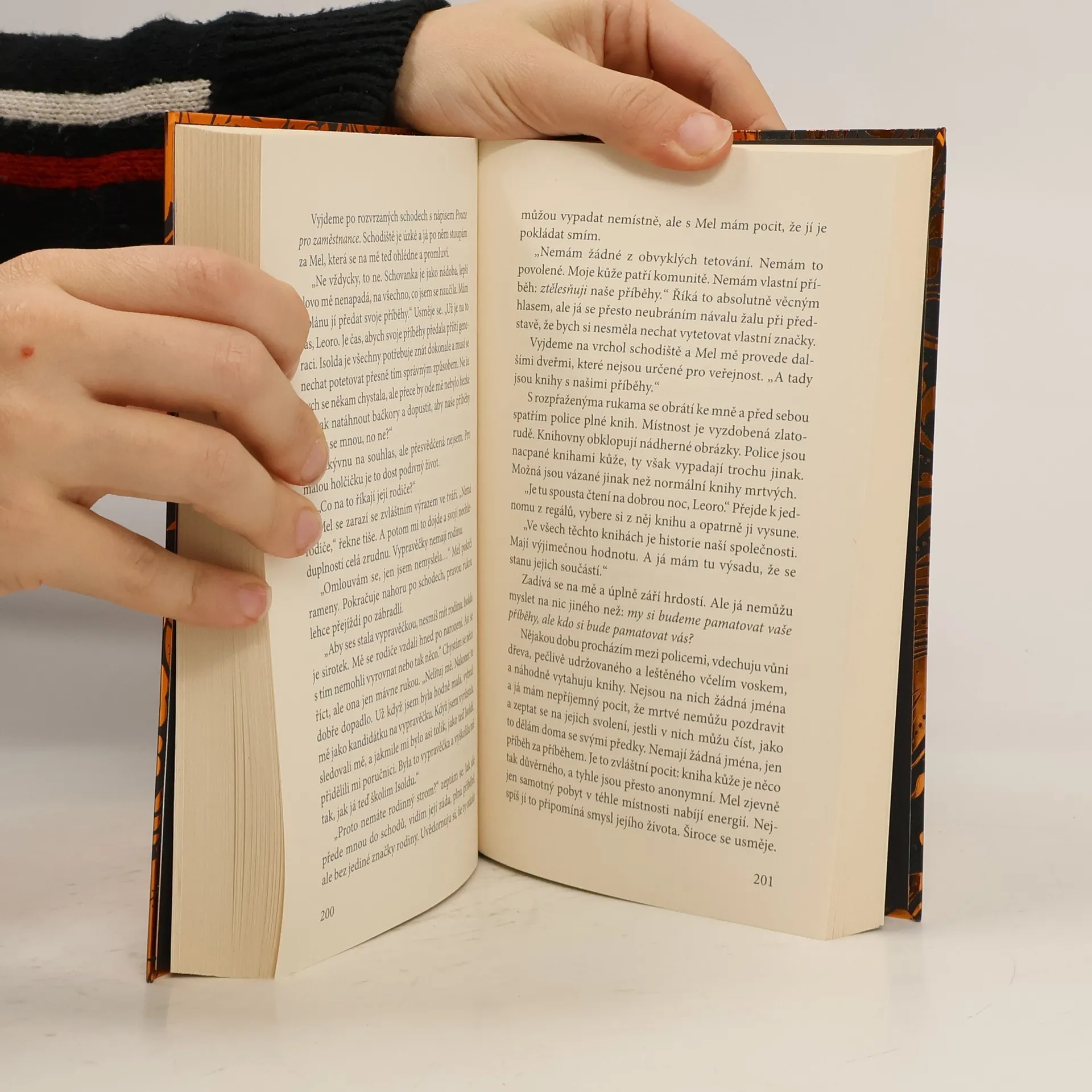 Představte si, že žijete v zemi, kde každá přelomová událost, každé důležité rozhodnutí, všechno, co pro vás má nějaký význam, skončí na vašem těle jako tetování. Po smrti pak z potetované kůže vytvoří knihu, která bude vašim potomkům sloužit jako vzpomínka na vás a vám jako záruka věčného života. V takovém světě žije Leora. Když její otec zemře, Leora by dala cokoli, jen aby mohl v paměti ostatních žít navždy. Ví totiž, že její otec si zasloužil, aby jeho kniha kůže se záznamem celého jeho dobrého života přetrvala navěky. Když však zjistí, že z knihy jejího otce někdo kus vyřízl a knihu upravil, musí se pustit do pátrání, které ji přiměje zamyslet se nad tím, zda svého otce vůbec znala. A jestli zná samu sebe. A jestli všechno, v co celý život věřila, je vůbec pravda. Tak začíná rozplétání strašného tajemství…