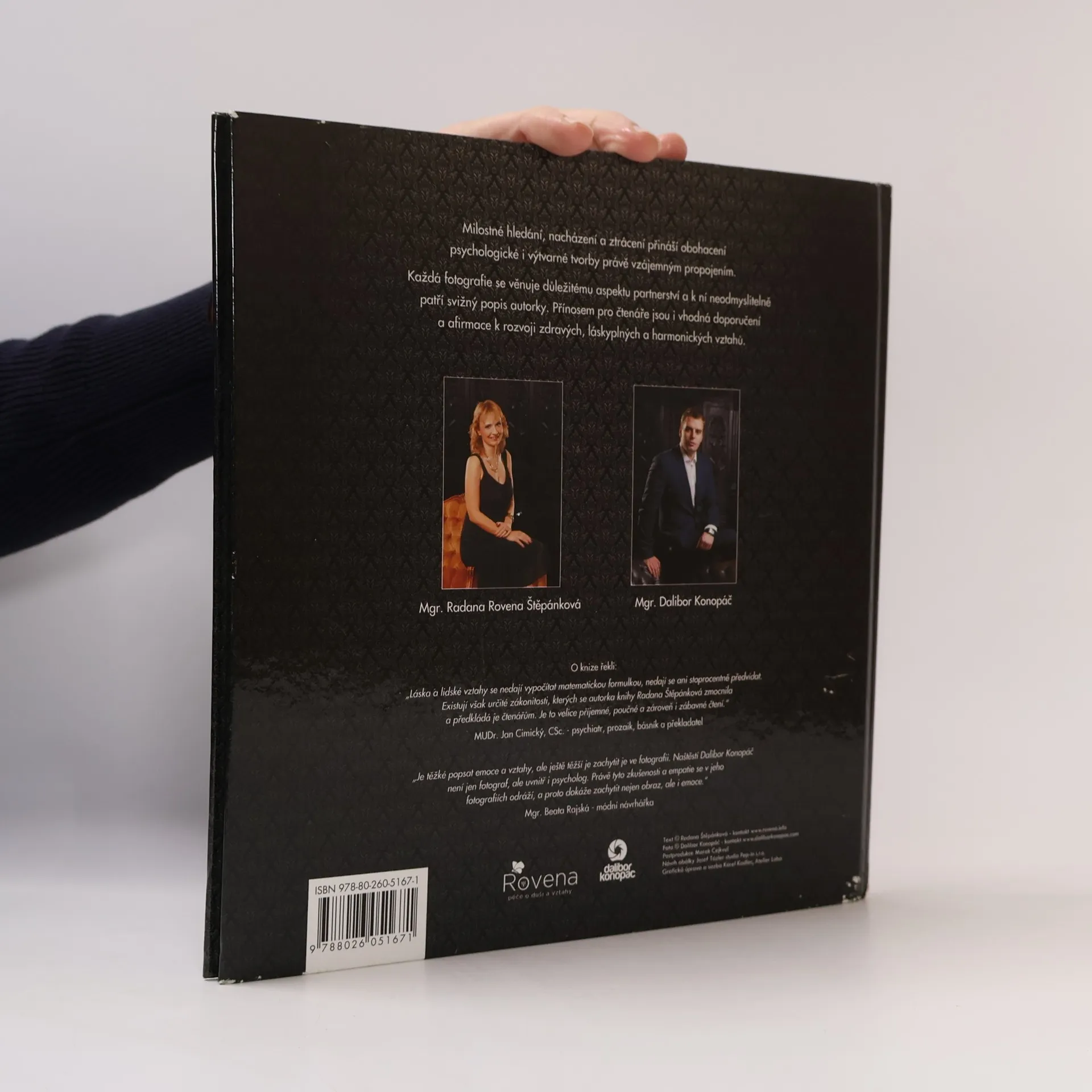 Dárkově provedená kniha obsahuje 22 fotografií, které vznikly ze spolupráce psycholožky a fotografa. Jedná se o projekt, který spojuje umění výtvarné s psychologickým. Předmluvu ke knize napsal MUDr. Jan Cimický Každá fotografie se věnuje důležitému aspektu partnerství a k ní neodmyslitelně patří i jeho popis daného. U každého tématu kromě popisu naleznete doporučení a vhodné afirmace, které vám mohou posloužit k rozvoji zdravých a harmonických vztahů. Kniha je rozdělena na tři části: Blok Radosti se věnuje krásným a příjemným aspektům partnerského života, zároveň dává inspiraci, jak je rozvinout a udržet ve vašem životě. Blok Zápletky zahrnuje běžné náročné momenty, se kterými se v partnerském životě často setkáváme a potřebujeme je zvládnout co nejlépe, abychom mohli žít v hezkém partnerském vztahu. Závěrečný blok Patologie je věnován jevům v partnerském životě, které jsou neslučitelné s životaschopným láskyplným partnerským vztahem, přestože se jich lidé běžně dopouštějí.