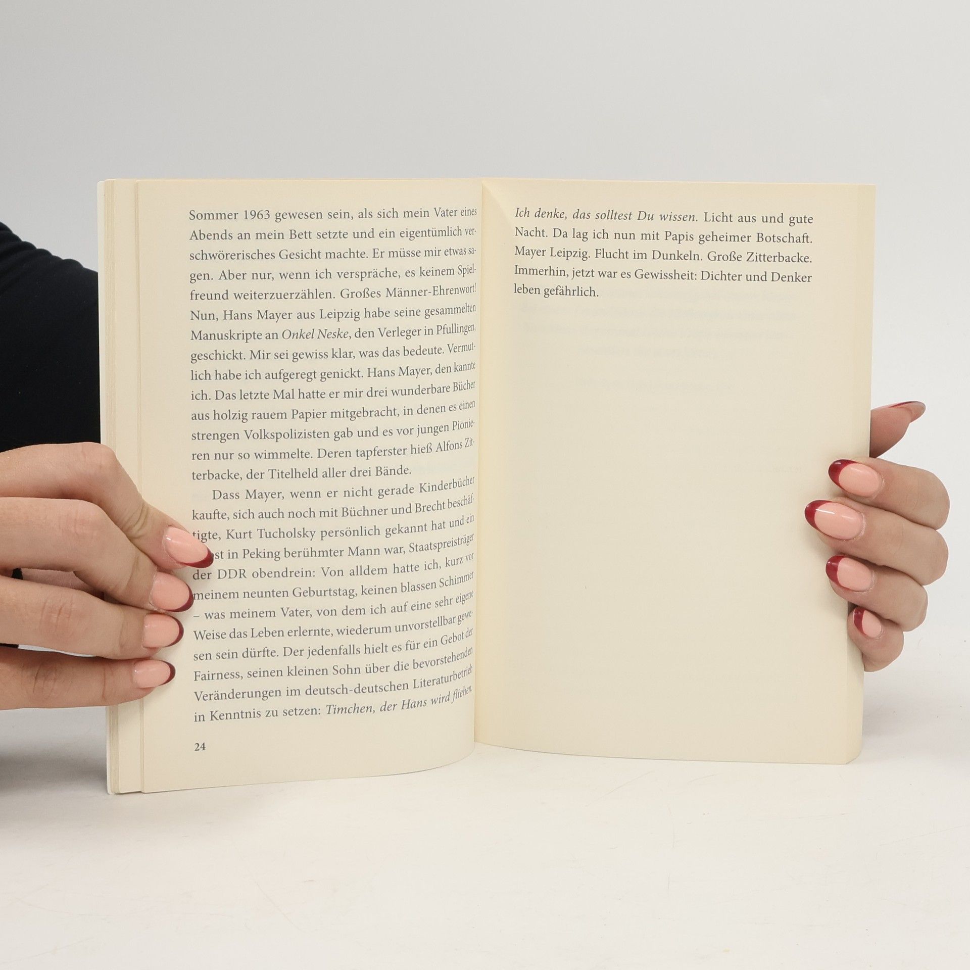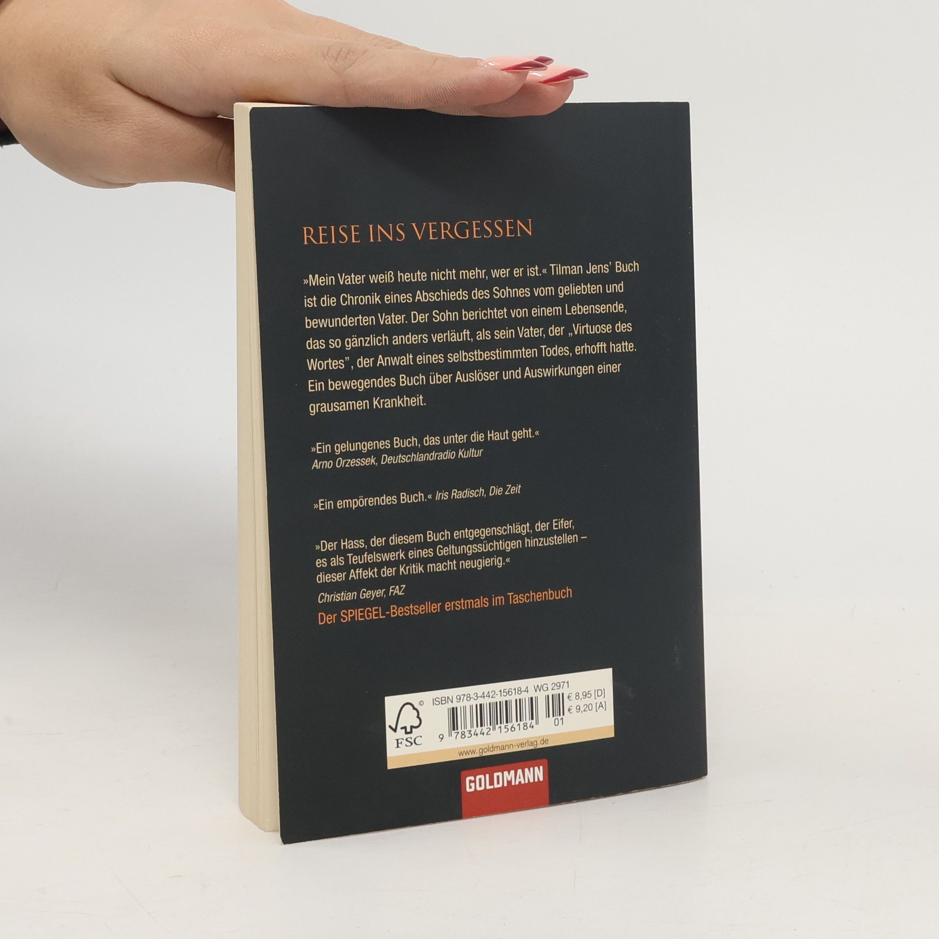 „Mein Vater weiß heute nicht mehr, wer er ist.“ Walter Jens und die Reise ins Vergessen. Tilman Jens’ Buch ist die Chronik eines langsamen Abschieds des Sohnes vom geliebten und bewunderten Vater. Der Sohn berichtet von einem Lebensende, das so gänzlich anders verläuft, als sein Vater, der „Virtuose des Wortes”, der Anwalt eines selbstbestimmten Todes, erhofft hatte. Ein bewegendes Buch über Auslöser und Auswirkungen einer grausamen Krankheit.