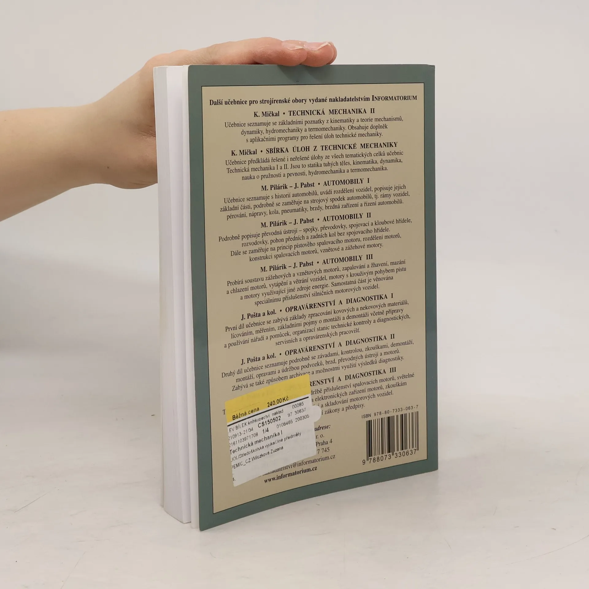 První díl učebnice technické mechaniky obsahuje středoškolskou látku statiky tuhých těles, grafických metod statiky a pružnosti a pevnosti. Hlavní pozornost je zaměřena na metodicky správné a obecně platné postupy řešení úloh a problémů technické mechaniky.