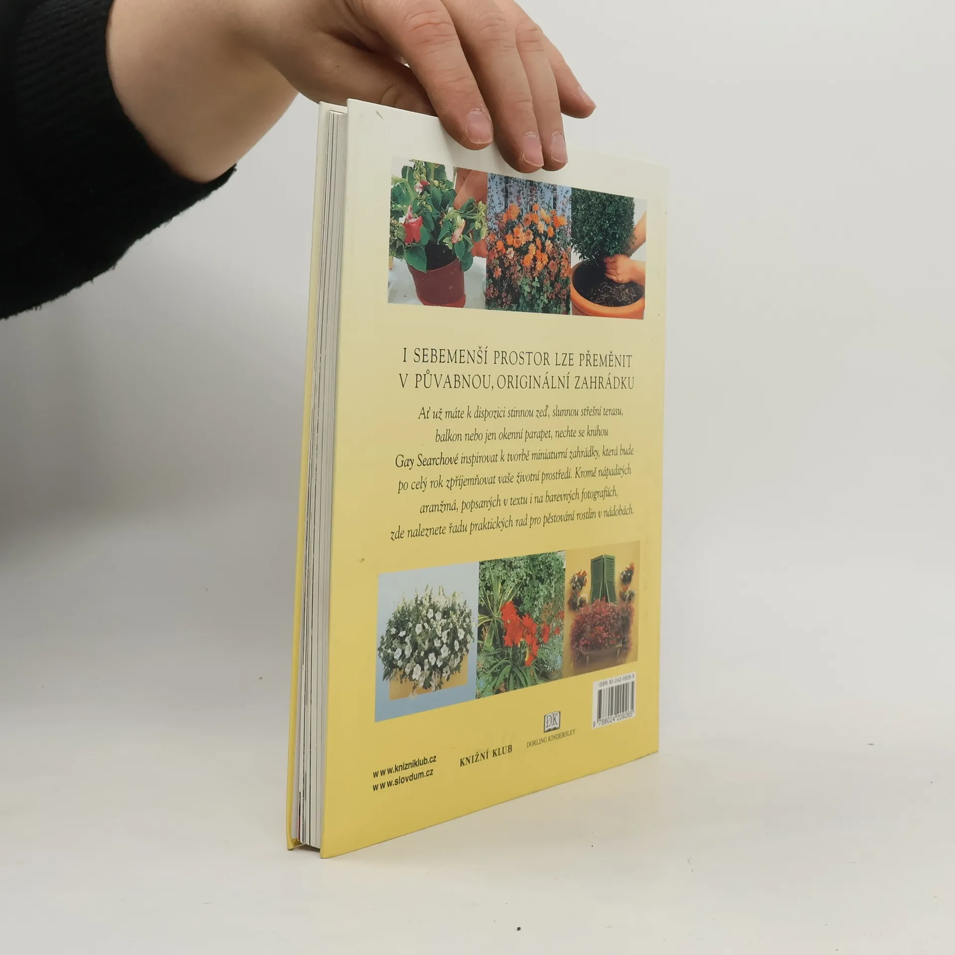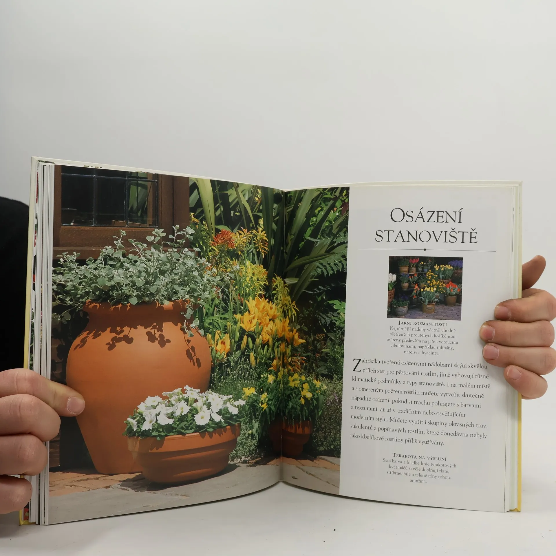Jak už vyplývá z návrhů názvu, publikace pojednává o pěstování rostlin v nádobách, ať už na terase, balkóně, patiu či dokonce jen na okenním parapetu. Najdete zde širokou škálu atraktivního osázení pro nejrůznější stanoviště, včetně možných obměn konkrétního aranžmá, tipů pro jeho celoroční ošetřování a detailního plánu výsadby s podrobným nákresem a uvedeným množstvím sazenic. Hlavní kapitoly této části knihy jsou tři: Zdi, schodiště a vchody; Malá prostranství; Okenní parapety. Ve druhé části publikace najdete rady pro rozvržení prostoru, určeného k osázení, s ohledem na nejrůznější typy stanoviště. Dále pak klíč, který vám pomůže vybrat vhodné rostliny. Třetí část se zabývá výběrem, výrobou a výzdobou nádob pro rostliny a obsahuje také srozumitelné, podrobné postupy při výsadbě a ošetřování rostlin, doprovázené fotografiemi. Závěrečná část obsahuje rejstřík, kde najdete všechny použité rostliny, jejich popis a nároky na pěstování.