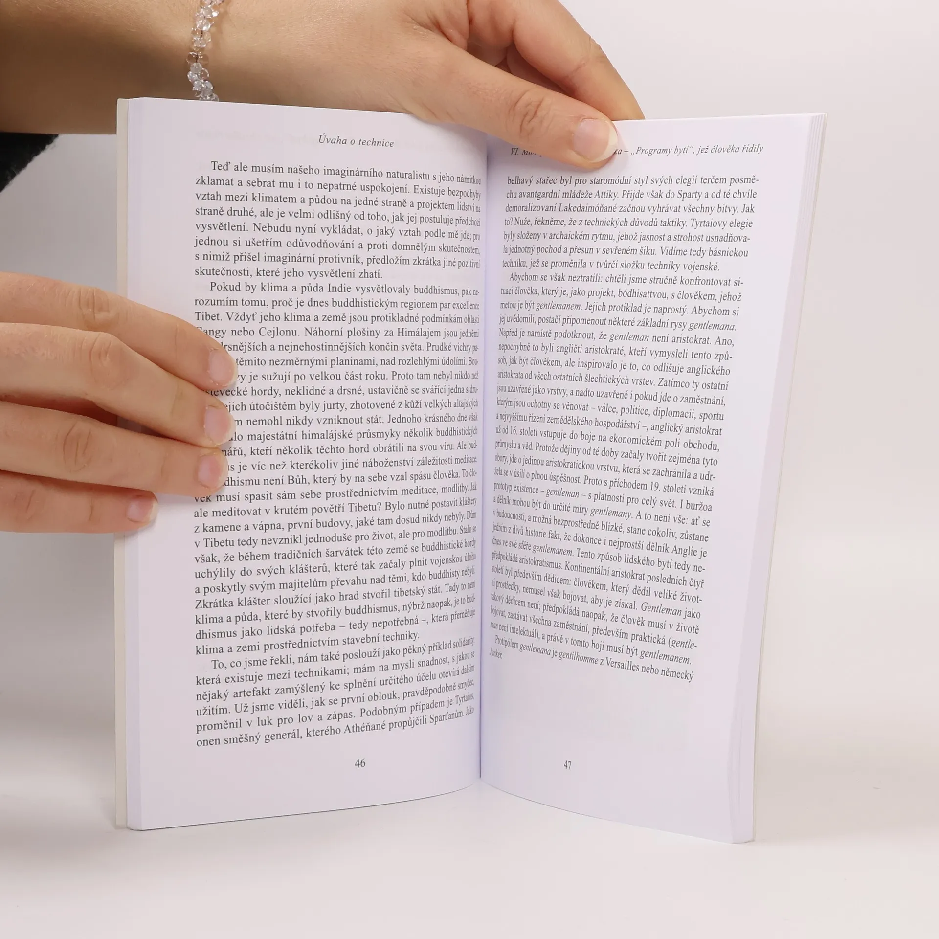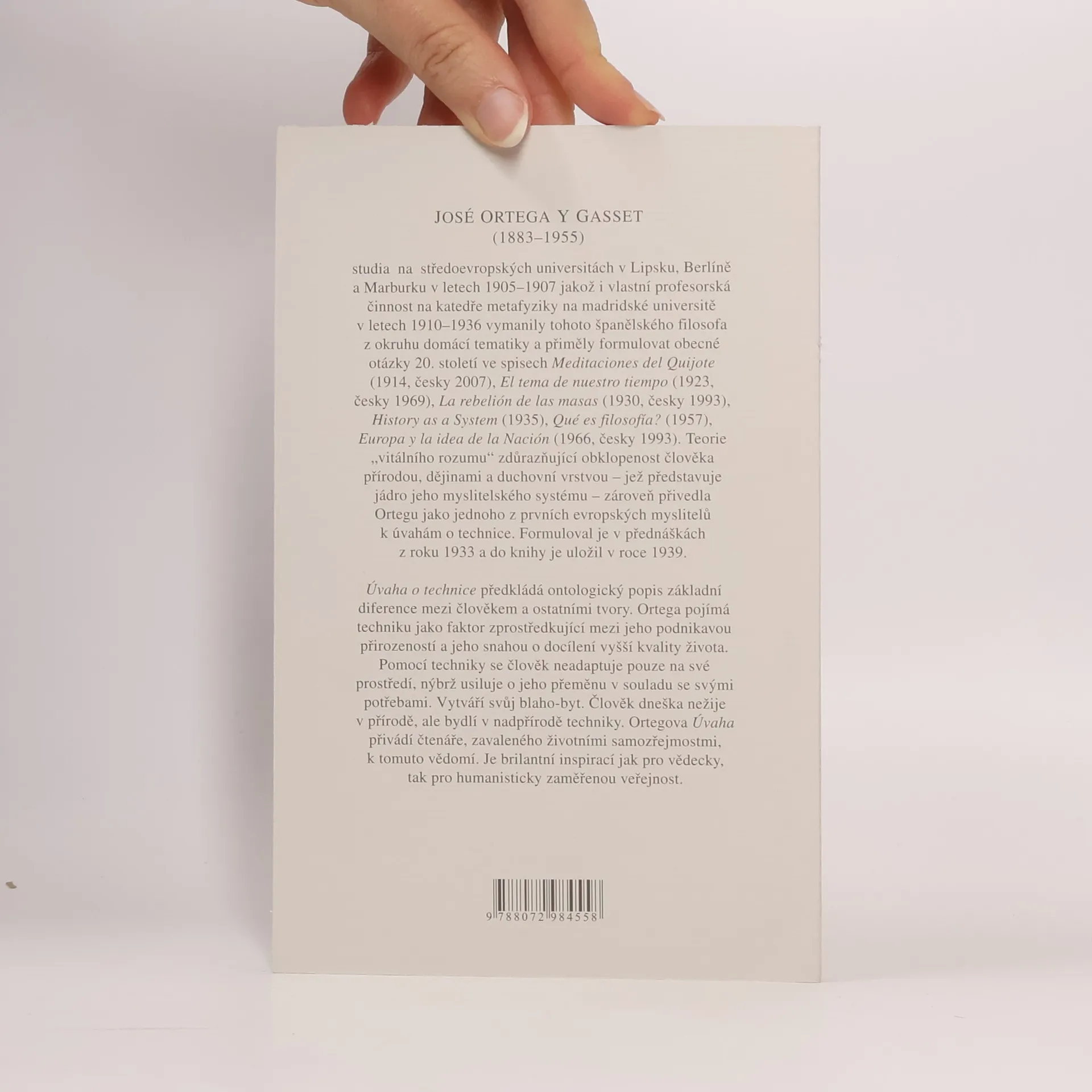 Těžištěm svazku je přednáškový cyklus z roku 1933, ve kterém španělský filosof podnikl jeden z vůbec prvních pokusů o teoretické uchopení techniky a jejího vztahu k člověku. V dalších esejích se Ortega y Gasset vyjadřuje k pozdnímu Heideggerovi, s nímž se setkal na kolokviu v Darmstadtu, k filosofickému stylu, k architektuře či k teoretickým problémům fyziky. Přeložil M. Špína.
