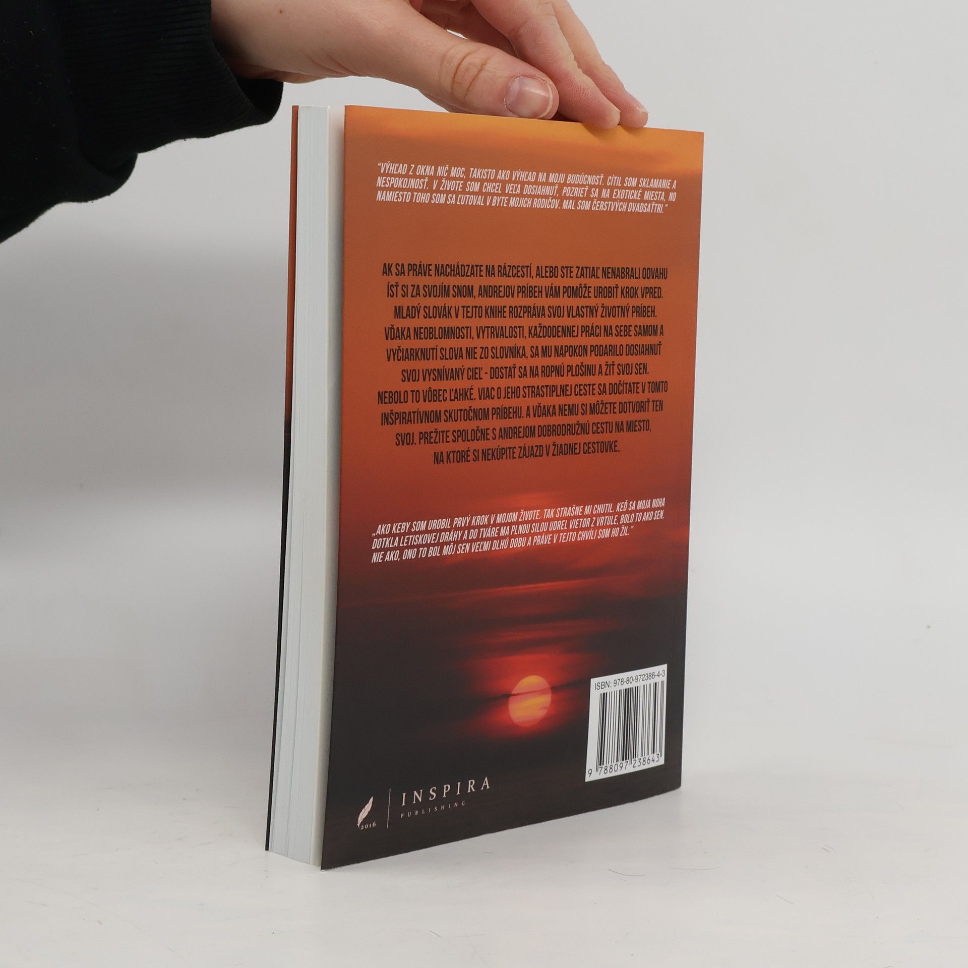 "Výhľad z okna nič moc, takisto ako výhlaď na moju budúcnosť. Cítil som sklamanie a nespokojnosť. V živote som chcel veľa dosiahnuť, pozrieť sa na exotické miesta, no namiesto toho som sa ľutoval v byte mojich rodičov. Mal som čerstvých dvadsaťtri." Ak sa práve nachádzate na rázcestí, alebo ste zatiaľ nenabrali odvahu ísť si za svojím snom, Andrejov príbeh Vám pomôže urobiť krok vpred. Mladý Slovák v tejto knihe rozpráva svoj vlastný životný príbeh. Vďaka neoblomnosti, vytrvalosti, každodennej práci na sebe samom a vyčiarknutí slova NIE zo slovníka, sa mu napokon podarilo dosiahnuť svoj vysnívaný cieľ - dostať sa na ropnú plošinu a žiť svoj sen. Nebolo to vôbec ľahké. Viac o jeho strastiplnej ceste sa dočítate v tomto inšpiratívnom skutočnom príbehu. A vďaka nemu si môžete dotvoriť ten svoj. Prežite spoločne s Andrejom dobrodružnú cestu na miesto, na ktoré si nekúpite zájazd v žiadnej cestovke. „Ako keby som urobil prvý krok v mojom živote. Tak strašne mi chutil. Keď sa moja noha dotkla letiskovej dráhy a do tváre ma plnou silou udrel vietor z vrtule, bolo to ako sen. Nie ako, ono to bol môj sen veľmi dlhú dobu a práve v tejto chvíli som ho žil..."