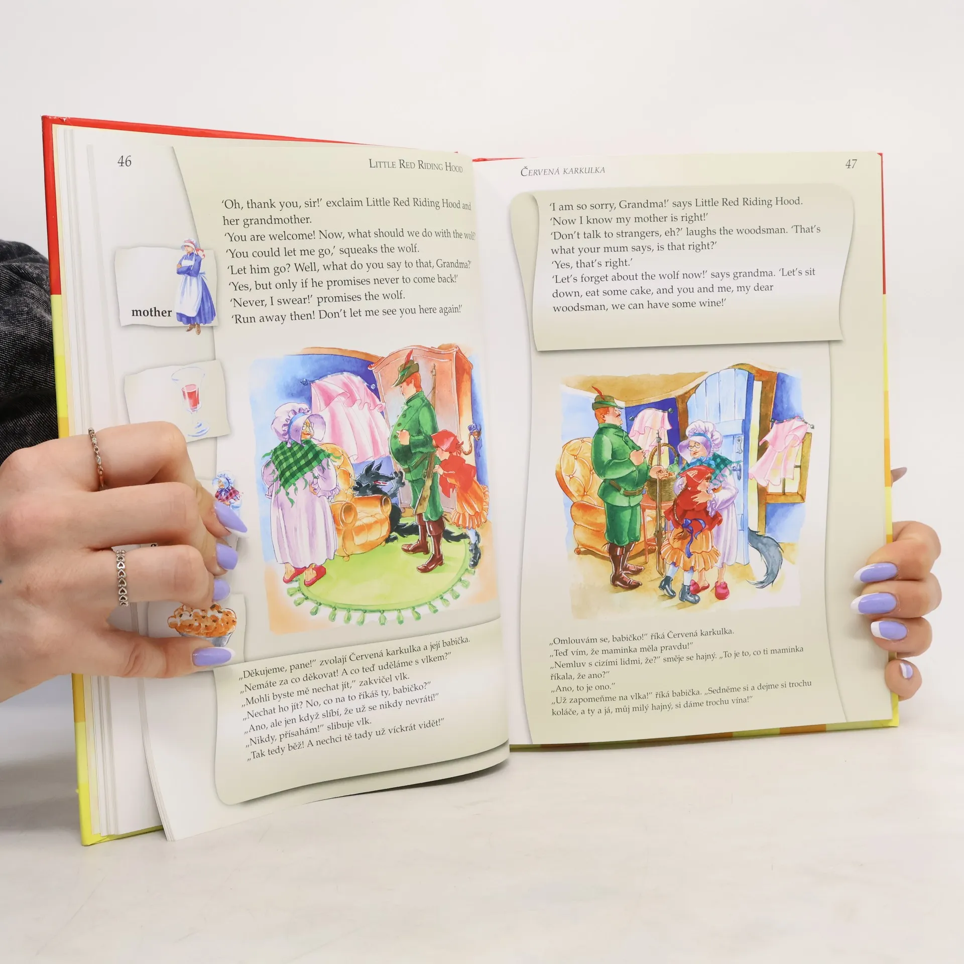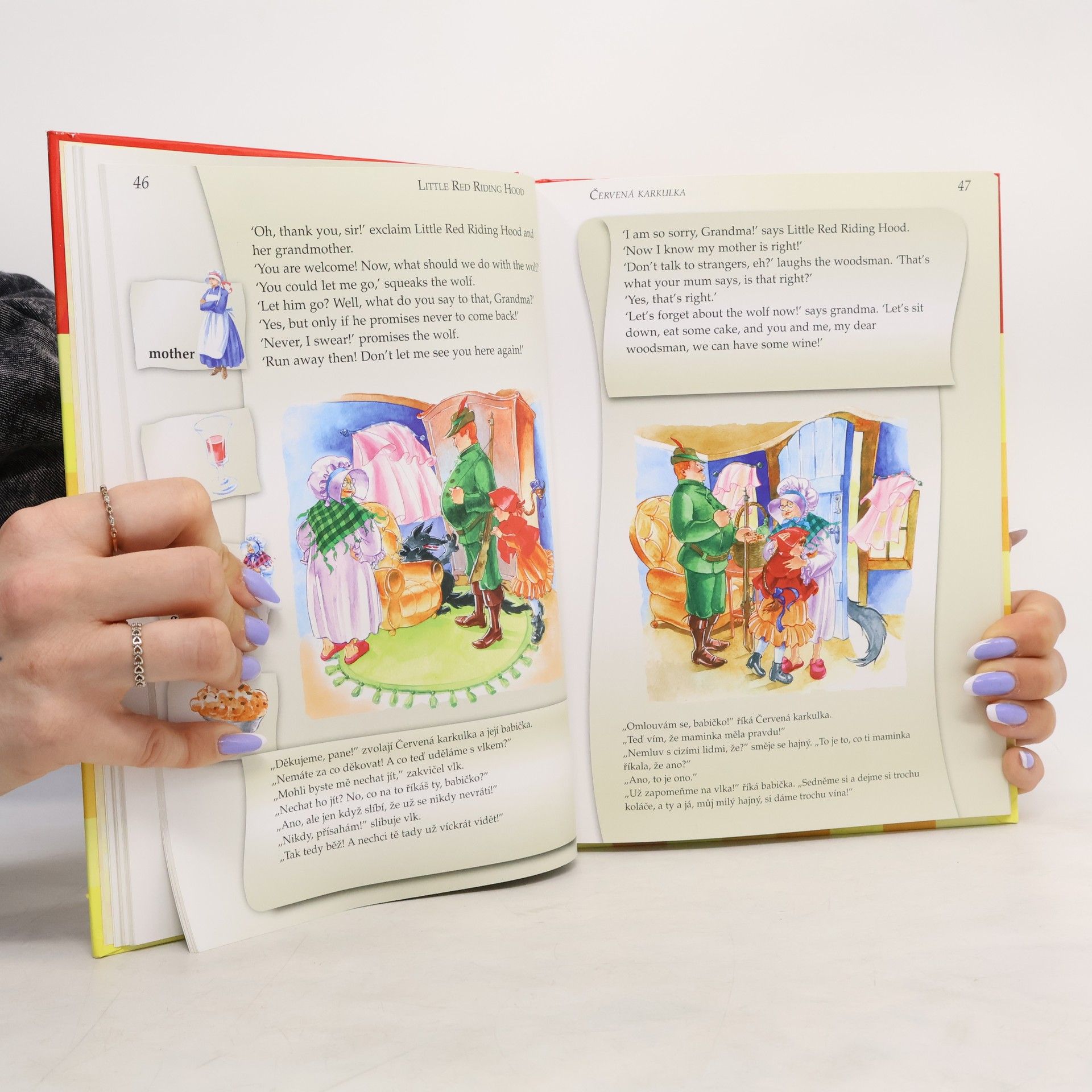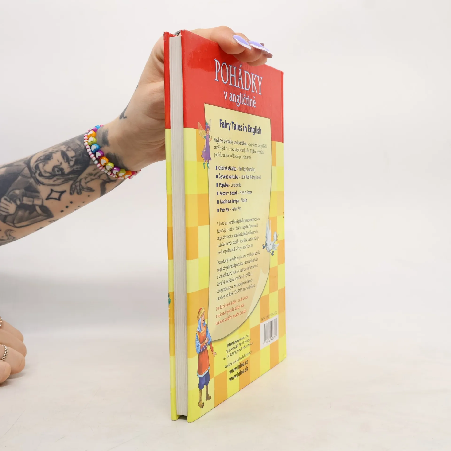 Bohatě ilustrovaná knížka pohádek v dvojjazyčné verzi - anglicko-české. Obsahuje následující pohádky: O Popelce, Červená karkulka, Aladinova lampa, Kocour v botách, Petr Pan, Ošklivé káčátko. Knížka je doplněna souhrným anglicko-českým slovníčkem s fonetickým přepisem a tabulkou výslovnosti a nahrávkou, která je zdarma ke stažení na www.infoa.cz/zbozi/pohadky-v-anglictine/