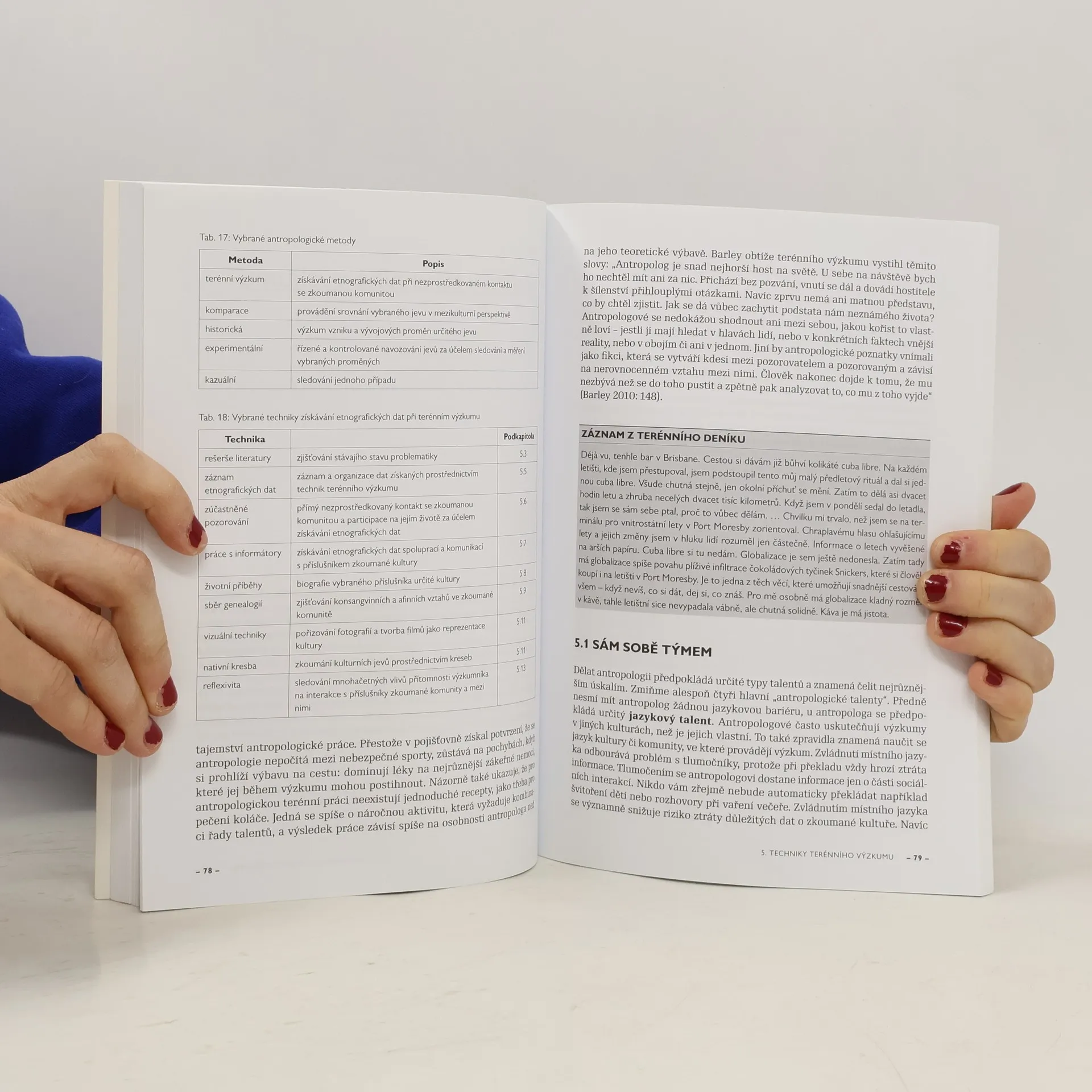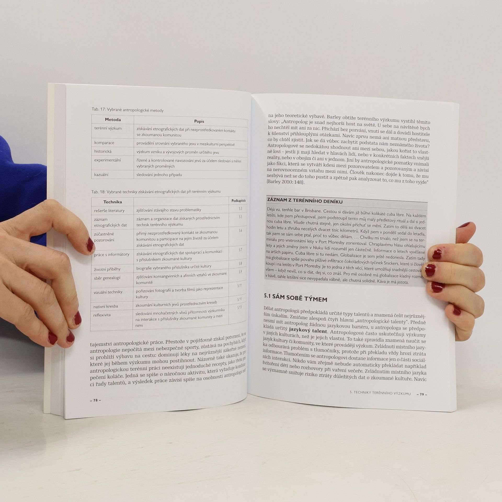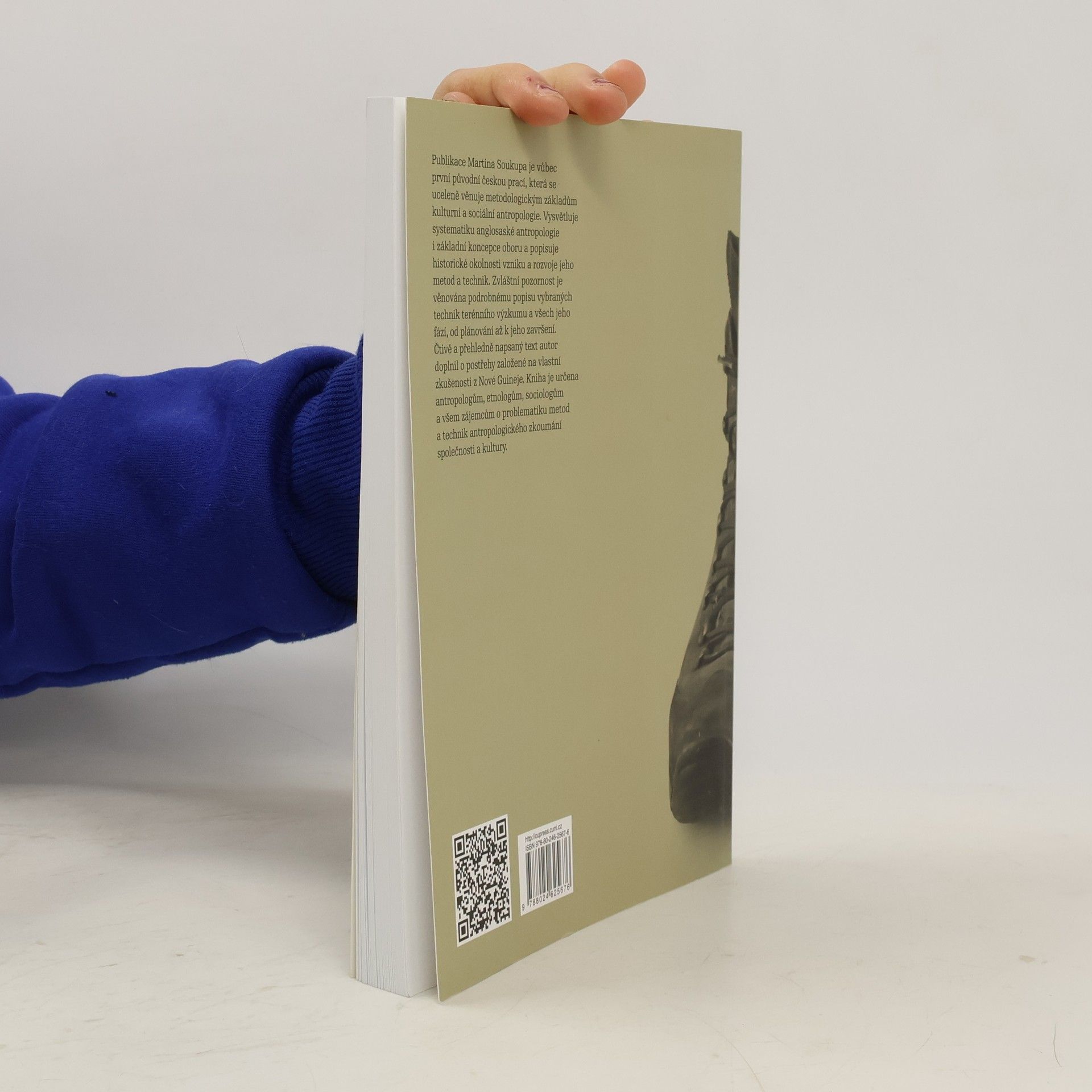 Publikace Martina Soukupa je vůbec první původní českou prací, která se uceleně věnuje metodologickým základům kulturní a sociální antropologie. Vysvětluje systematiku anglosaské antropologie i základní koncepce oboru a popisuje historické okolnosti vzniku a rozvoje jeho metod a technik. Zvláštní pozornost je věnována podrobnému popisu vybraných technik terénního výzkumu a všech jeho fází, od plánování až k jeho završení. Čtivě a přehledně napsaný text autor doplnil o postřehy založené na vlastní zkušenosti z Nové Guineje. Kniha je určena antropologům, etnologům, sociologům a všem zájemcům o problematiku metod a technik antropologického zkoumání společnosti a kultury.