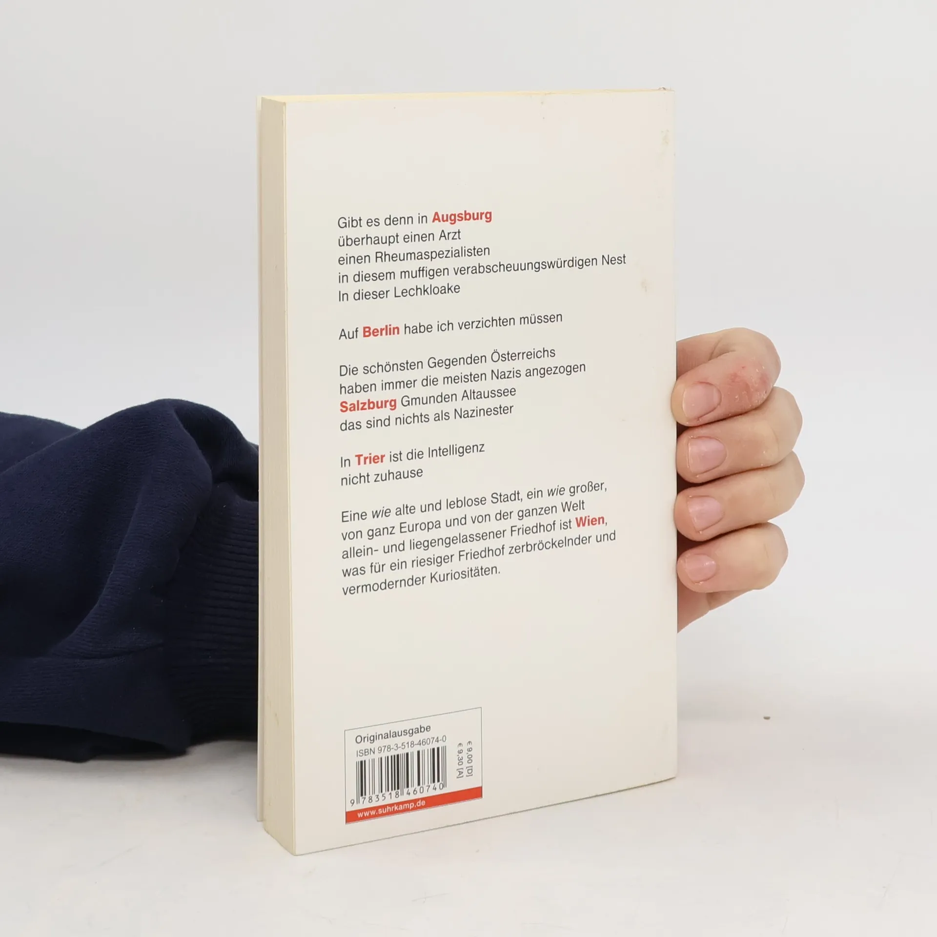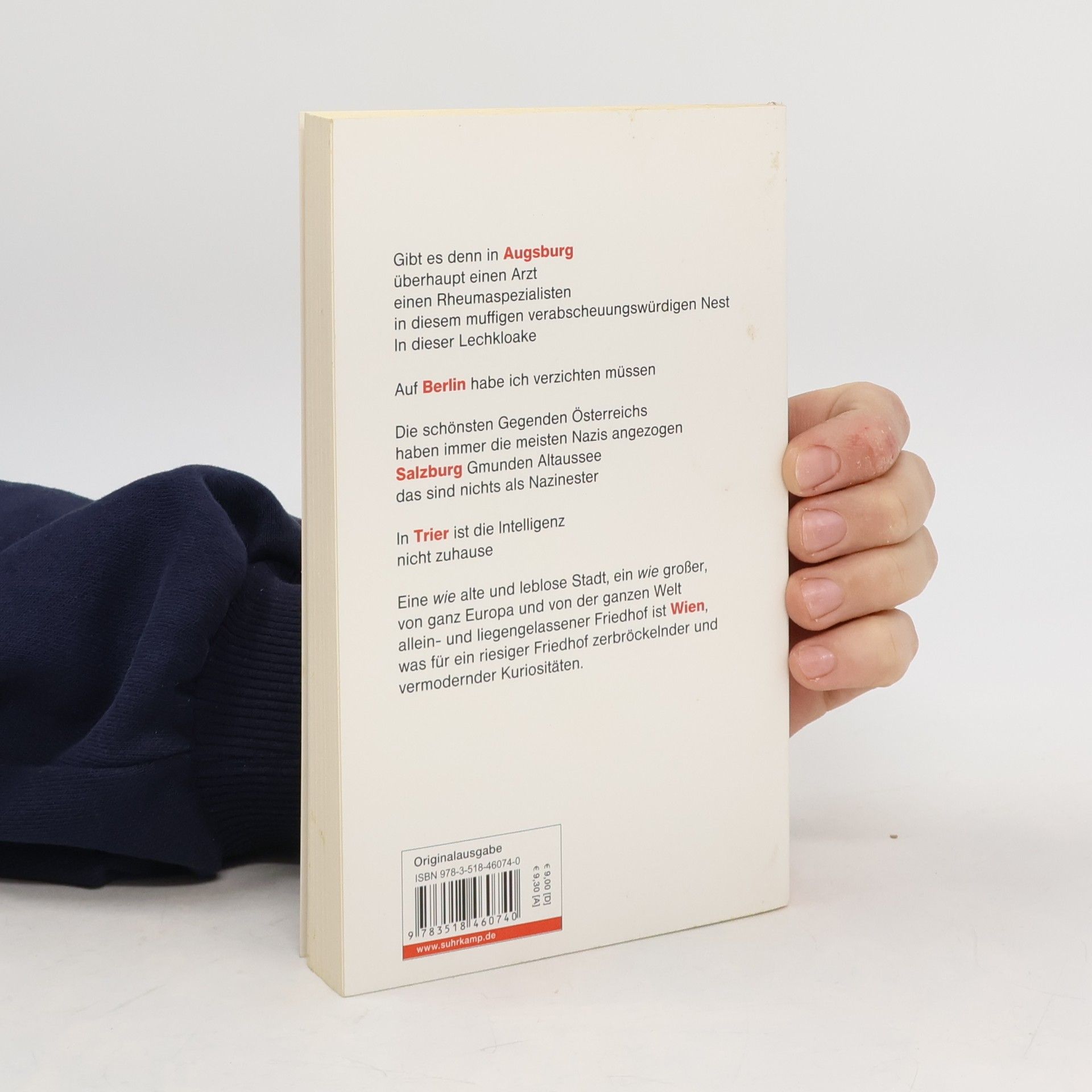 Augsburg, das »muffige verabscheuungswürdige Nest«, die »Lechkloake«. Überhaupt: »Salzburg, Augsburg, Regensburg, Würzburg, ich hasse sie alle, weil in ihnen jahrhundertelang der Stumpfsinn warmgestellt ist.« »Bremen verabscheute ich vom ersten Moment an, es ist eine kleinbürgerliche unzumutbare sterile Stadt.« Übrigens Trier: »Man geht nicht ungestraft nach Trier / man geht nach Trier und macht sich lächerlich.«