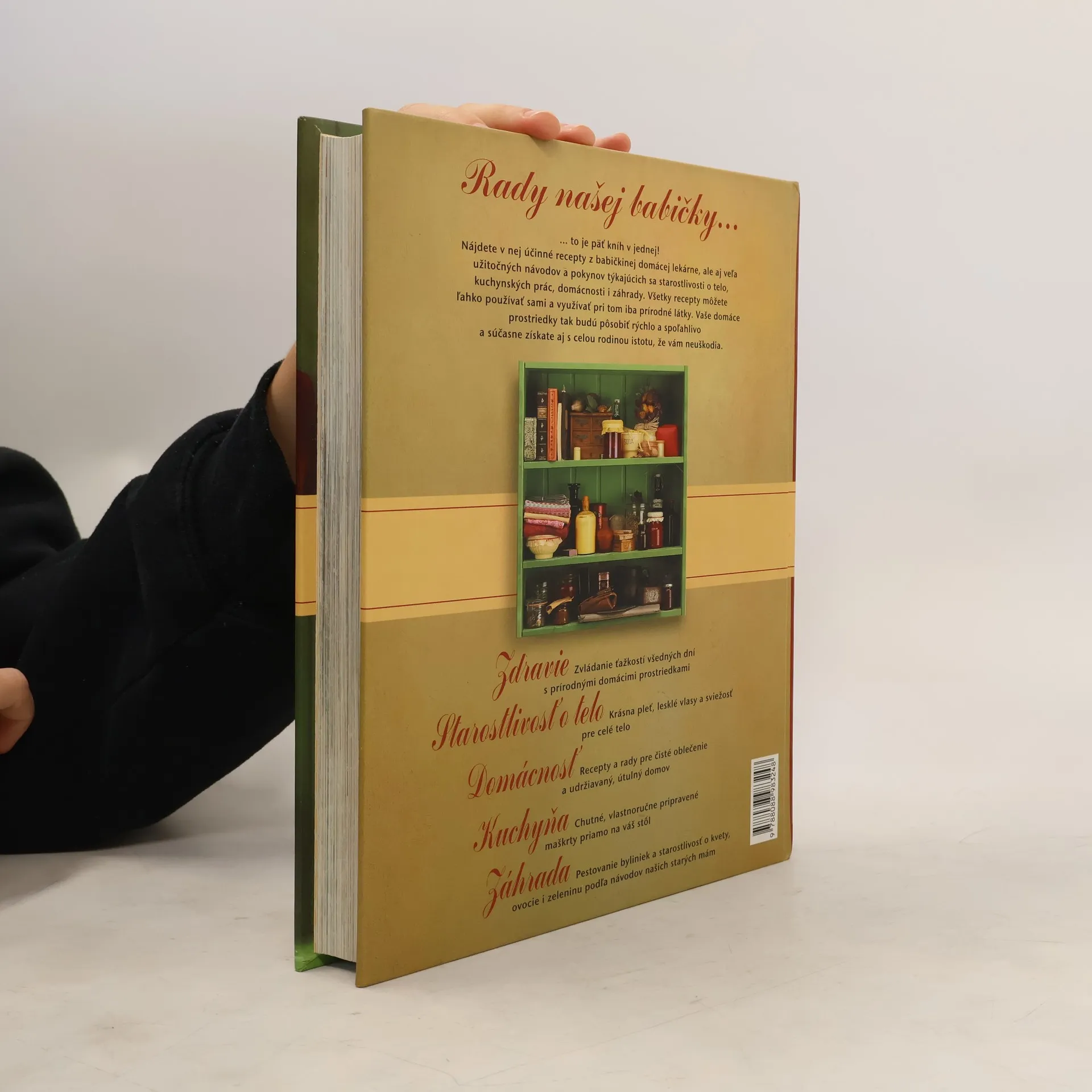 Odpoveď na tieto a mnohé ďalšie otázky ponúka praktická príručka Rady našej babičky. Bohato ilustrovaná kniha obsahuje 1200 generáciami overených nápadov, tipov, receptov a šikovných riešení – od vlastnoručne vyrobeného bylinkového octu až po rastlinné hnojivo, od olejov do kúpeľov až po škrobiace prípravky a od čistiacich prostriedkov až po ochranu proti moľom.