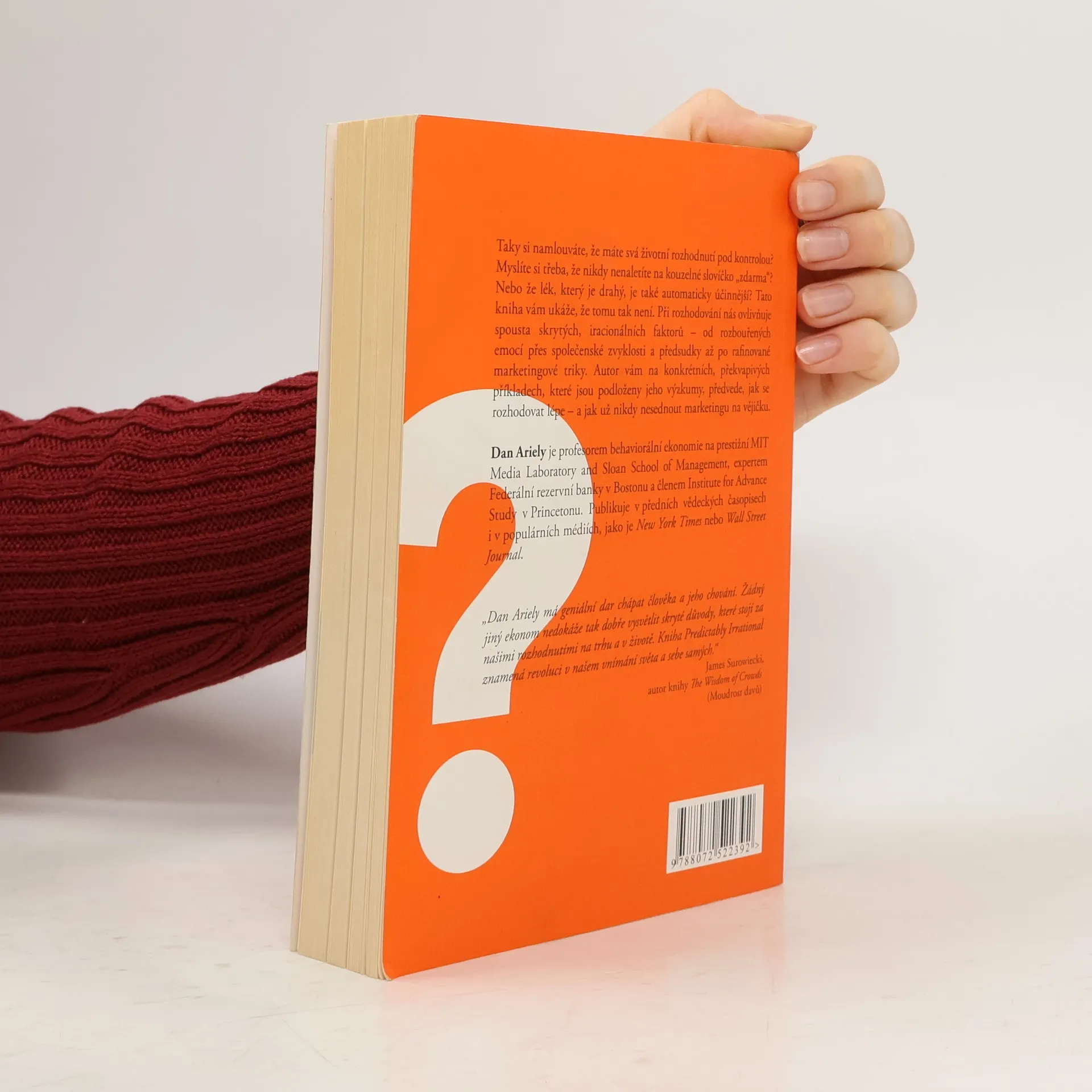 Iracionální faktory v ekonomice i v životě Taky si namlouváte, že máte svá životní rozhodnutí pod kontrolou? Myslíte si třeba, že nikdy nenaletíte na kouzelné slovíčko „zdarma“? Nebo že lék, který je drahý, je také automaticky účinnější? Tato kniha vám ukáže, že tomu tak není. Při rozhodování nás ovlivňuje spousta skrytých, iracionálních faktorů – od rozbouřených emocí přes společenské zvyklosti a předsudky až po rafinované marketingové triky. Autor této vysoce ceněné knihy vám na konkrétních, překvapivých příkladech, které jsou podloženy jeho výzkumy, předvede, jak se rozhodovat lépe – a jak už nikdy nesednout marketingu na vějičku.