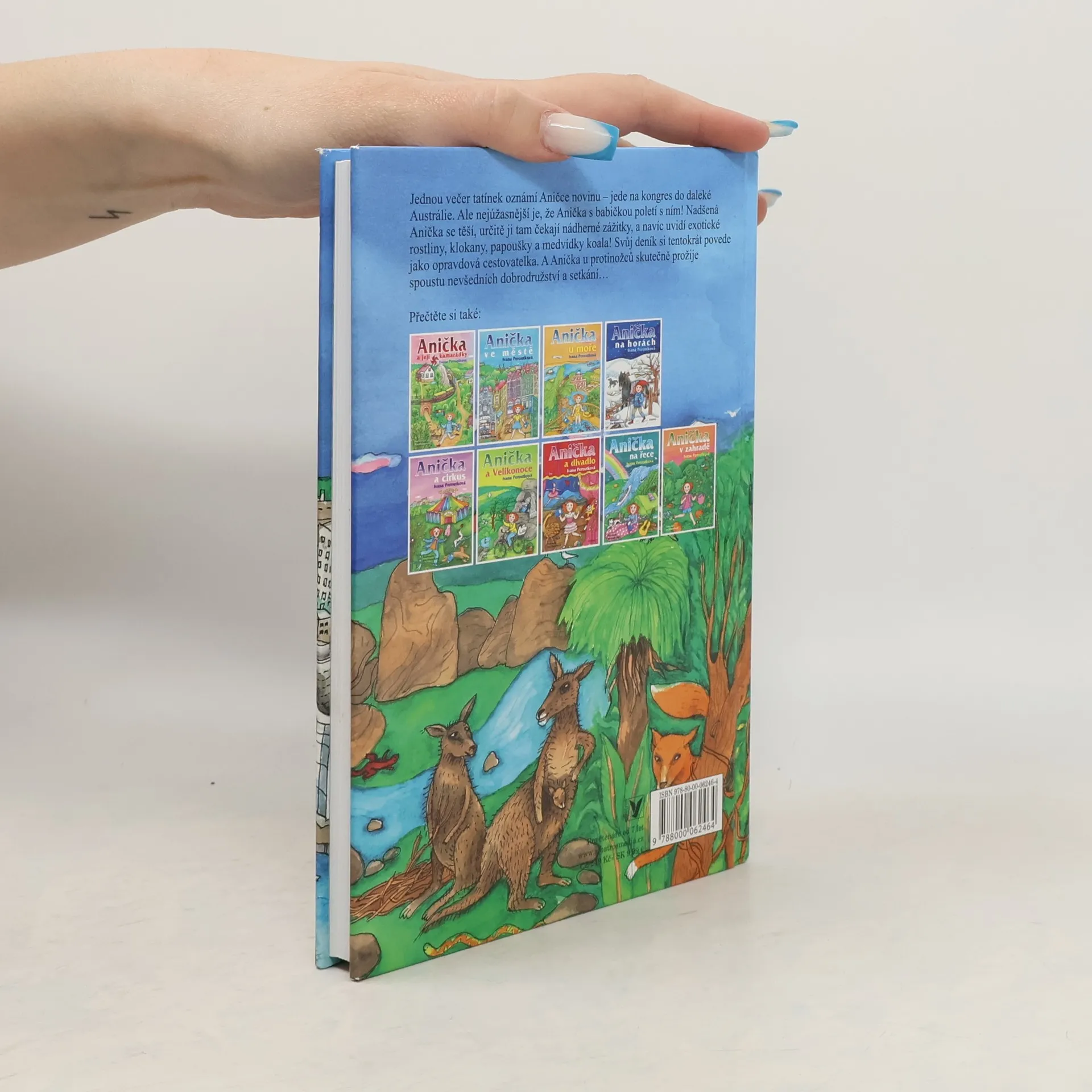 Jednou večer tatínek oznámí Aničce novinu - jede na kongres do daleké Austrálie. Ale nejúžasnější je, že Anička s babičkou poletí s ním! Nadšená Anička se těší, určitě ji tam čekají báječné zážitky, a navíc uvidí exotické rostliny, klokany, papoušky a medvídky koala! Svůj deník si tentokrát povede jako opravdová cestovatelka. Anička u protinožců skutečně prožije spoustu nevšedních dobrodružství a setkání.