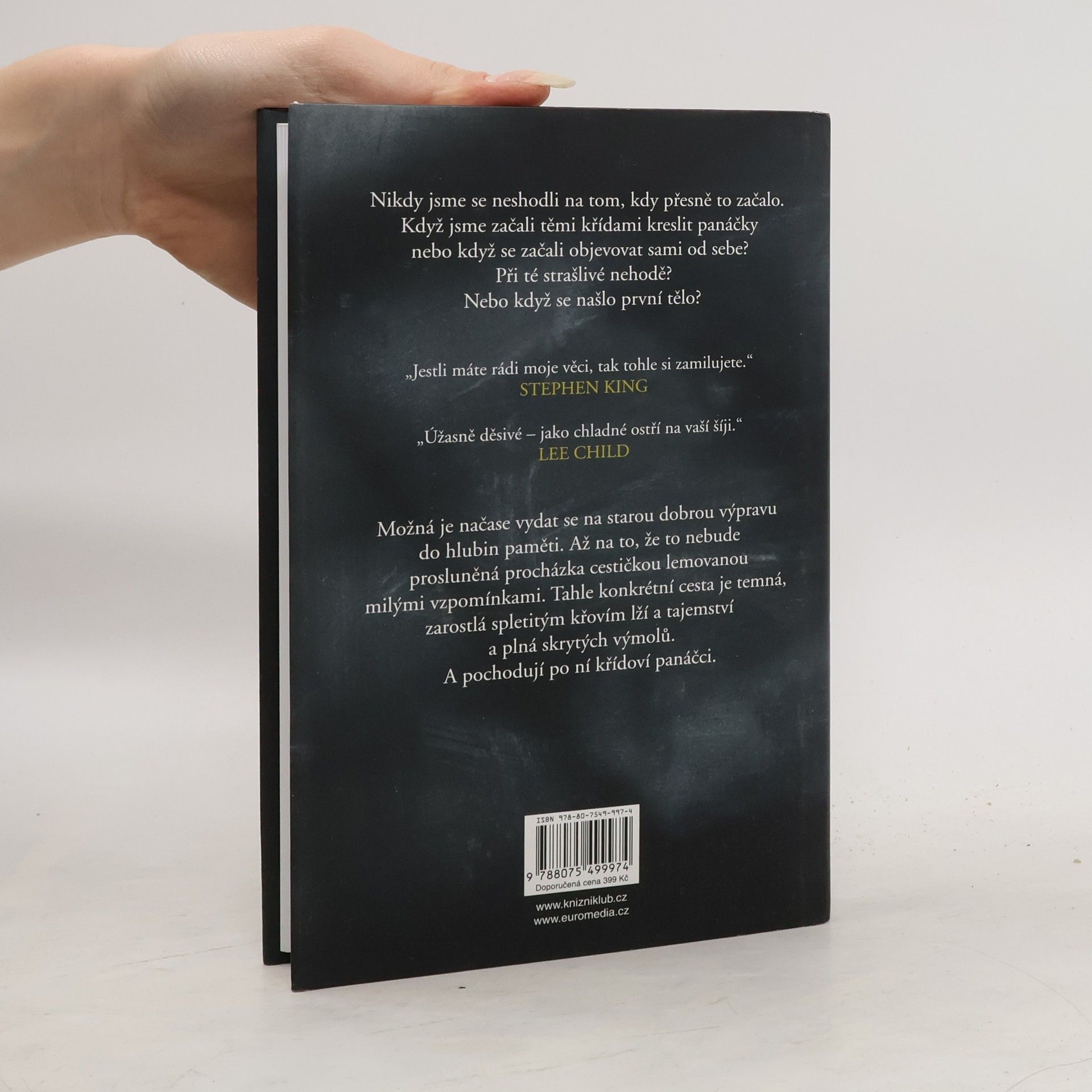 Všichni máme tajemství. Před některými utíkáme, ale ona si nás najdou. A některé hry končí vždycky stejně… Mysteriózní thriller Kříďák je tu – a nedá se před ním utéct. Cítíte to v lese, ve škole i na hřišti, cítíte to v domech a v lunaparku. Cítíte to na většině míst v malém městečku Anderbury… strach, že vás někdo nebo něco sleduje. Začalo to na pouti roku 1986, kdy se stala ta nehoda. Toho dne potkal dvanáctiletý Eddie pana Hallorana – pana Křídu. Ten přivedl Eddieho na myšlenku nevinné hry pro něj a partu jeho přátel: za pomoci křídových kreseb si mohli nechávat vzkazy. Byla to docela zábava – dokud je křídoví panáčci nedovedli k tělu. Mrtvému dívčímu tělu, rozřezanému na kousky. Tahle událost se jim nesmazatelně vryla do nočních můr. A třicet let poté najdou v dopisních schránkách záhadnou obálku – s panáčkem a kusem křídy. Strašáci z dětských let totiž možná stále dokážou zabíjet.