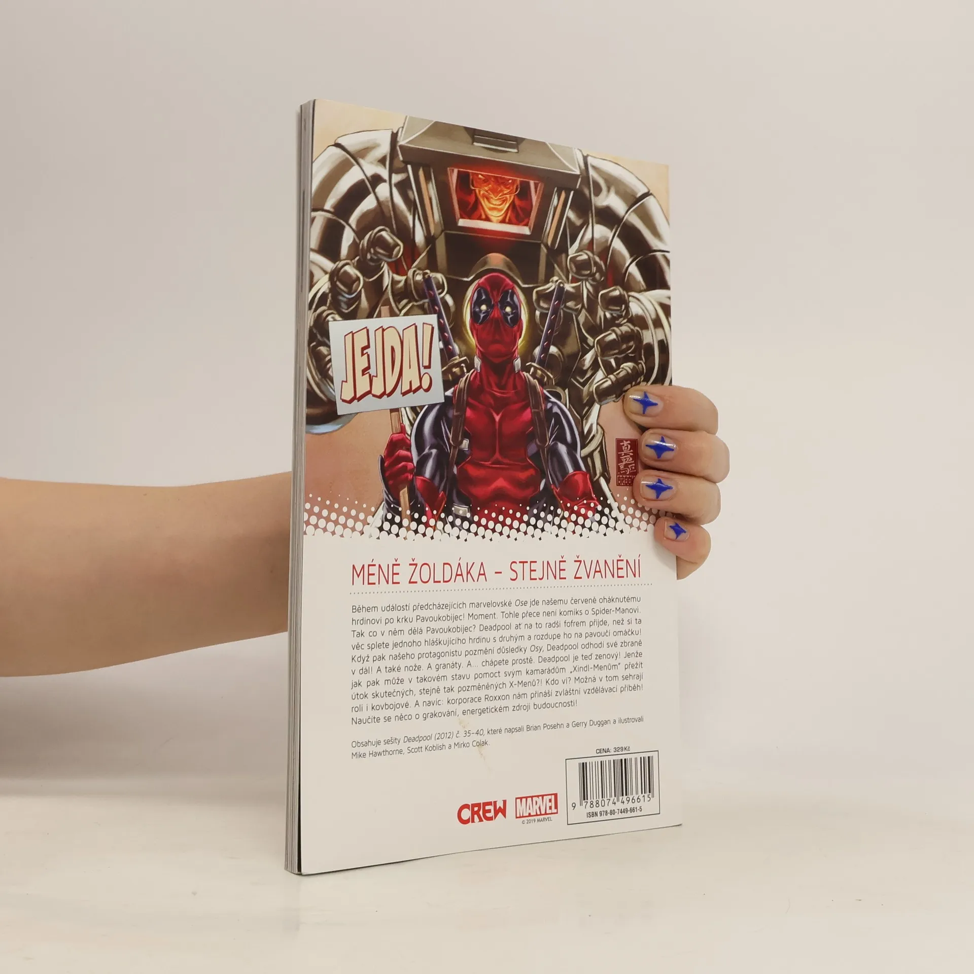 MÉNĚ ŽOLDÁKA - STEJNĚ ŽVANĚNÍ Během událostí předcházejících marvelovské Ose jde našemu červeně oháknutému hrdinovi po krku Pavoukobijec! Moment. Tohle přece není komiks o Spider-Manovi. Tak co v něm dělá Pavoukobijec? Deadpool ať si na to radši fofrem přijde, než si ta věc splete jednoho hláškujícího hrdinu s druhým a rozdupe ho na pavoučí omáčku! Když pak našeho protagonistu pozmění důsledky Osy, Deadpool odhodí své zbraně v dál! A také nože. A granáty. A... chápete prostě. Deadpool je teď zenový! Jenže jak pak může v takovém stavu pomoct svým kamarádům "Xindl-Menům" přežít útok skutečných, stejně tak pozměněných X-Menů?! Kdo ví? Možná v tom sehrají roli i kovbojové. A navíc: korporace Roxxon nám přináší zvláštní vzdělávací příběh! Naučíte se něco o grakování, energetickém zdroji budoucnosti!