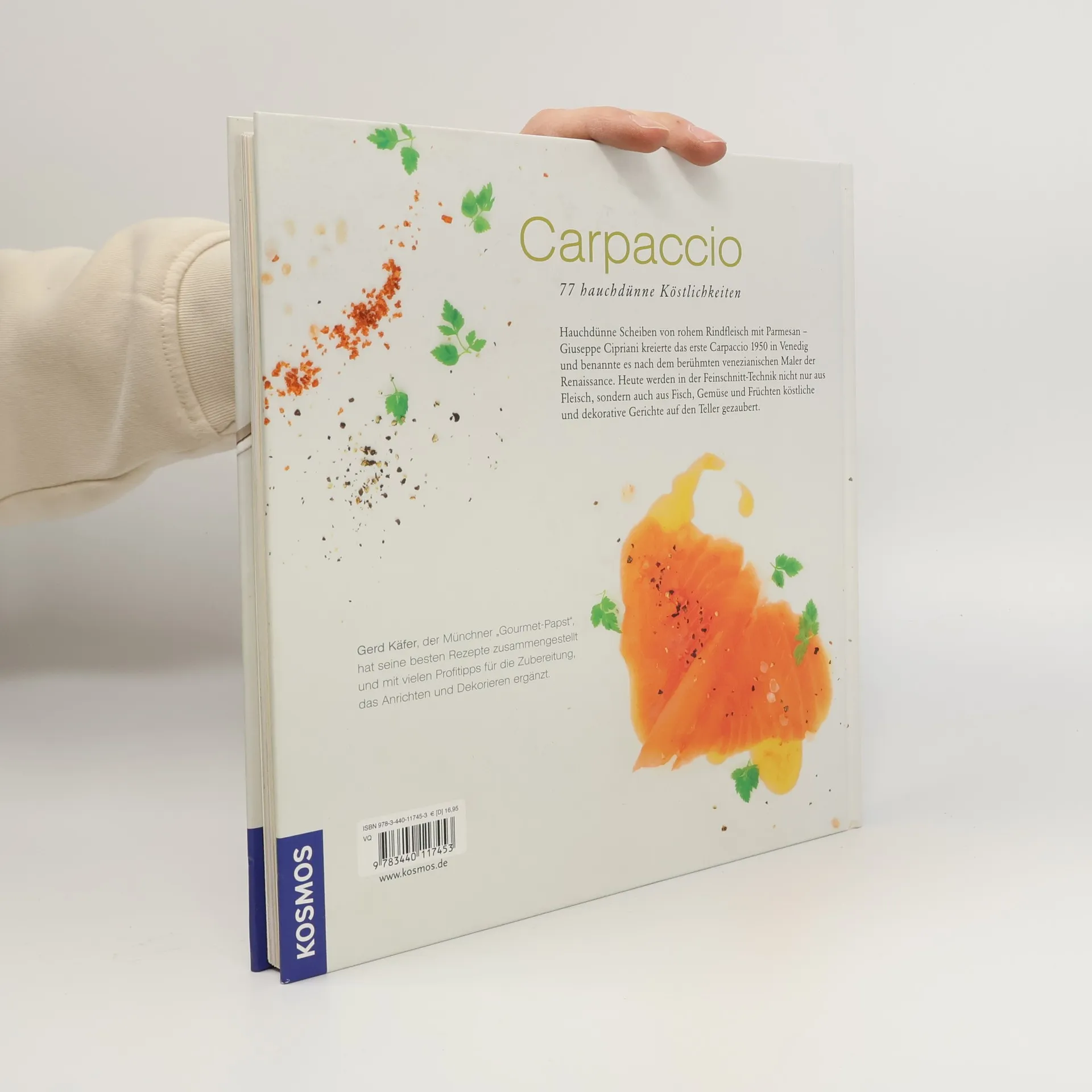 Hauchdünne Scheiben von rohem Rinderfilet mit Parmesan – Giuseppe Cipriani kreierte das erste Carpaccio 1950 in Venedig und benannte es nach dem berühmten venezianischen Renaissance-Maler. Heute werden in der Feinschnitt-Technik aus allen erdenklichen Produkten köstliche und dekorative Gerichte auf den Teller gezaubert. Der Münchner „Gourmet-Papst“ Gerd Käfer hat seine besten Rezepte, von einfach bis luxuriös, ausgewählt und mit vielen Profitipps für die Zubereitung, das Anrichten und Dekorieren ergänzt.