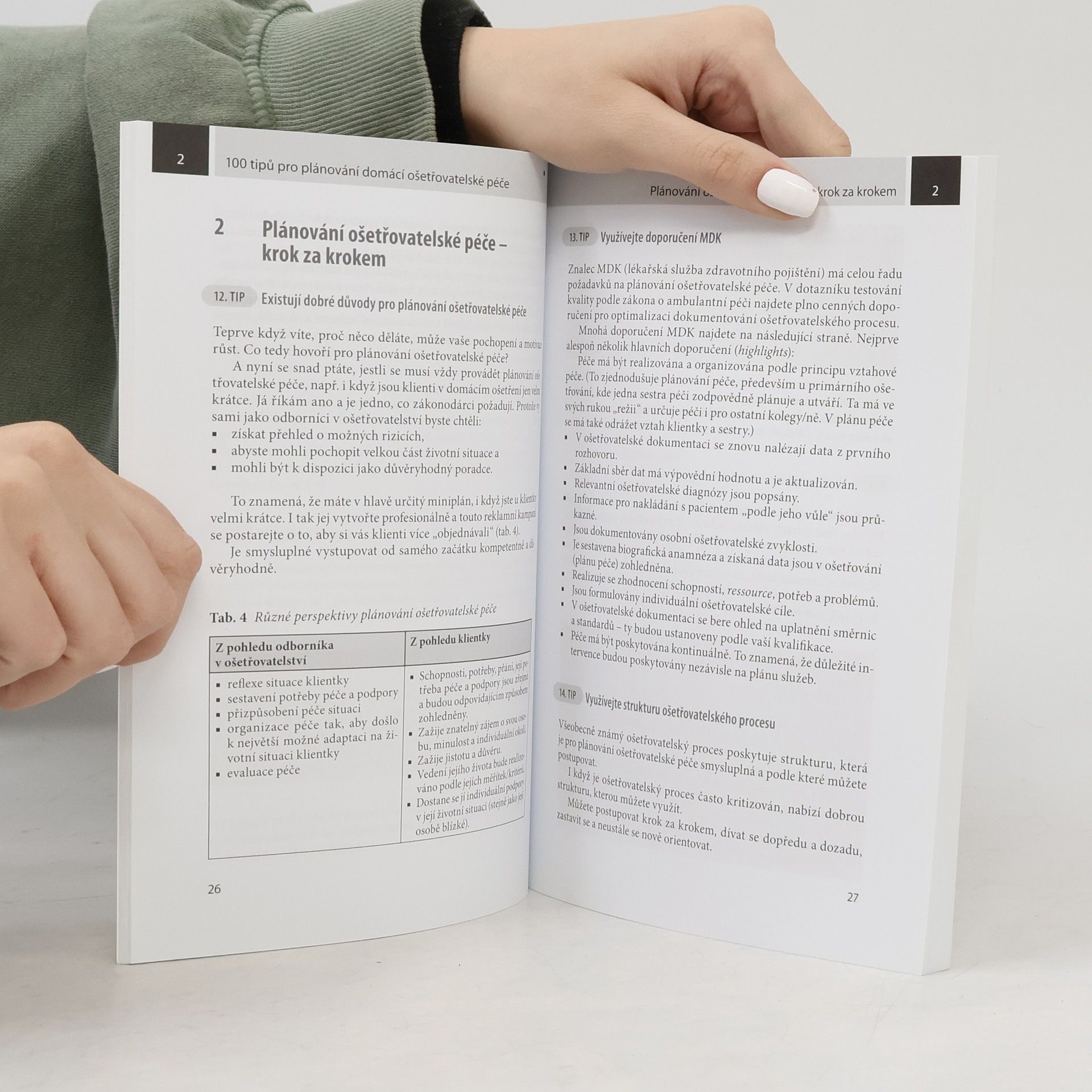 Publikace přináší 100 tipů jak zefektivnit a zlepšit péči o klienty v domácím prostředí a jak podpořit spolupráci s pečující rodinou; návody jak lépe a snadněji udržet klienta aktivního fyzicky i psychicky, jak se vyvarovat drobných chyb, které klienty demotivují, a jak pomoci pečujícím, kteří se o klienta v domácí péči starají; tipy a postřeh, jak dobře dokumentovat provedené výkony a na co se zaměřit, aby nedocházelo k nedostatku, nebo naopak opakování ošetřovatelské péče u starých a nevyléčitelně nemocných.