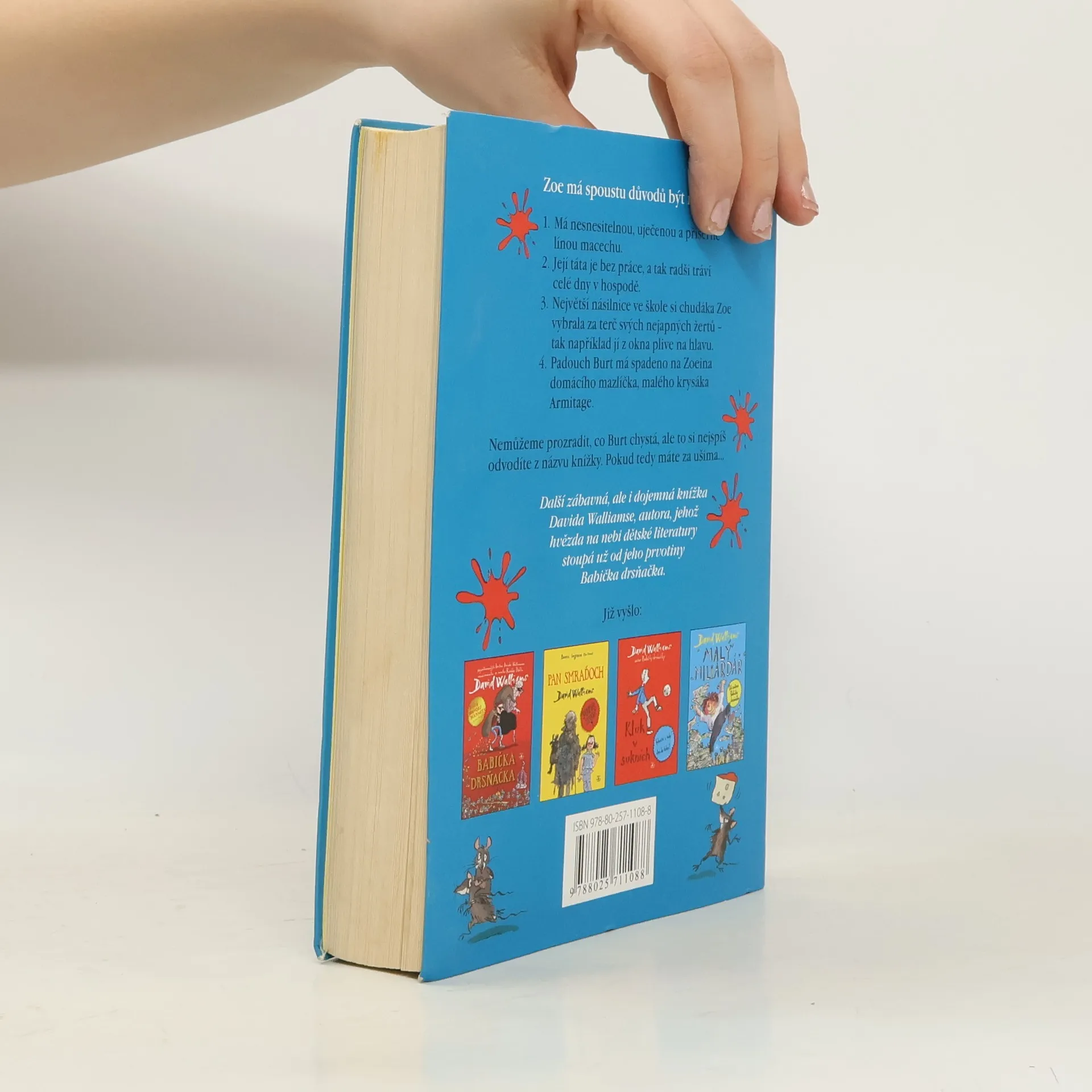 Další zábavná, ale i dojemná knížka Davida Walliamse, autora, jehož hvězda na nebi dětské literatury stoupá už od jeho prvotiny Babička drsňačka. Jak je u Walliamse obvyklé, nemají to jeho hrdinové v životě zrovna snadné. Ani Zoe není výjimkou. Její táta se po smrti Zoeiny mámy podruhé oženil, ale neměl v tomhle směru zrovna štěstí. Sheila je uječená a bezkonkurenčně nejlínější osoba pod sluncem, nebo aspoň v činžáku, kde rodina bydlí. Svoji nevlastní dceru bytostně nesnáší. A aby toho nebylo málo, největší násilnice ve škole si chudáka Zoe vybrala za terč svých nejapných žertů. Zoe se cítí osamělá a nešťastná. Proto se zaraduje, když jednoho dne do jejího pokoje zabloudí roztomilé krysí mládě – neděste se, může se to stát i v lepších rodinách. Holčička si ho rychle ochočí a začne ho učit cirkusovým kouskům. Na malého krysáka však číhá velké nebezpečí. Má na něj spadeno majitel firmy na výrobu... Čeho? To si snadno odvodíte z názvu knížky. První vydání.