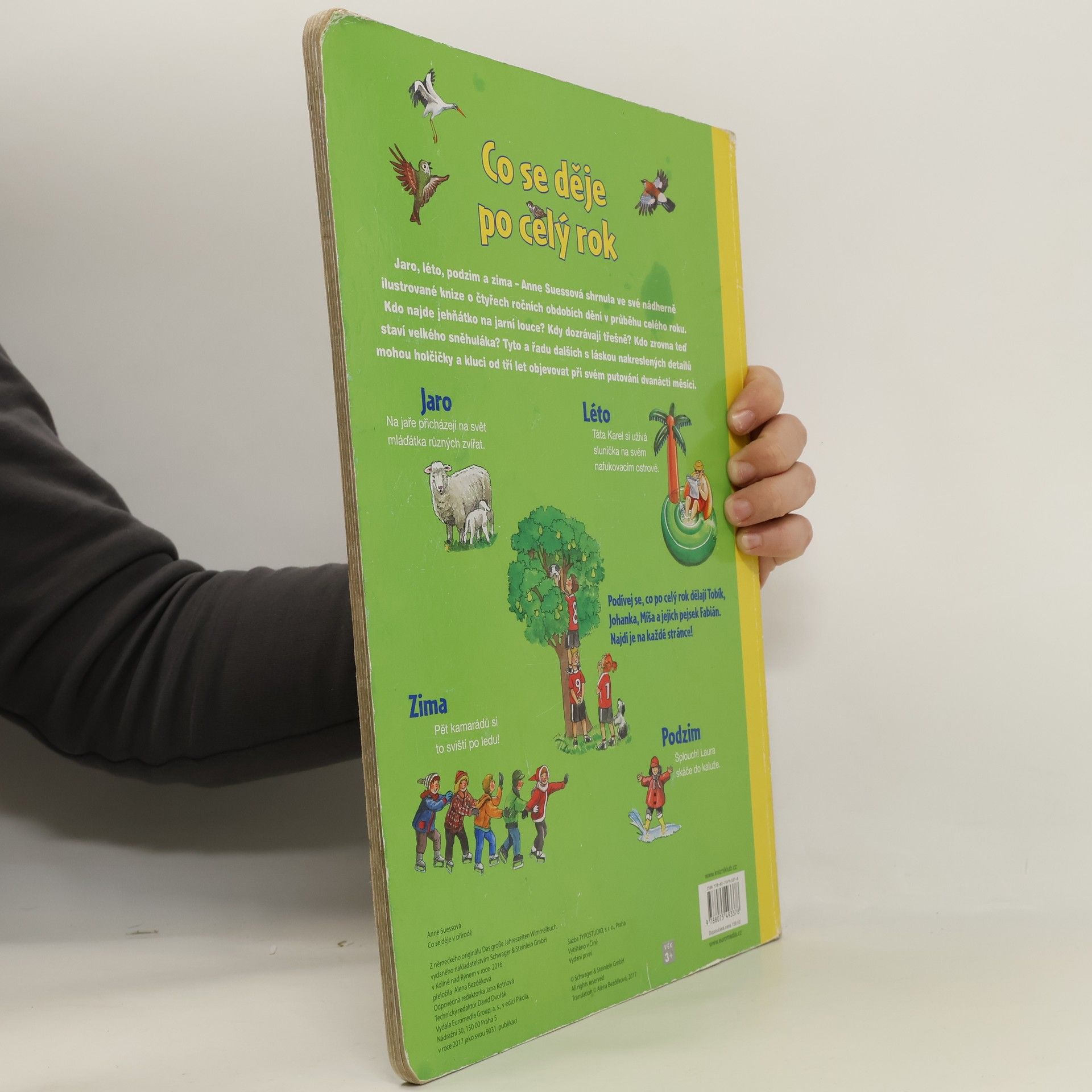 Jaro, léto, podzim a zima – Anne Suessová shrnula ve své nádherně ilustrované knize o čtyřech ročních obdobích dění v průběhu celého roku. Kdo najde jehňátko na jarní louce? Kdy dozrávají třešně? Kdo zrovna teď staví velkého sněhuláka? Tyto a řadu dalších s láskou nakreslených detailů mohou holčičky a kluci od tří let objevovat při svém putování dvanácti měsíci