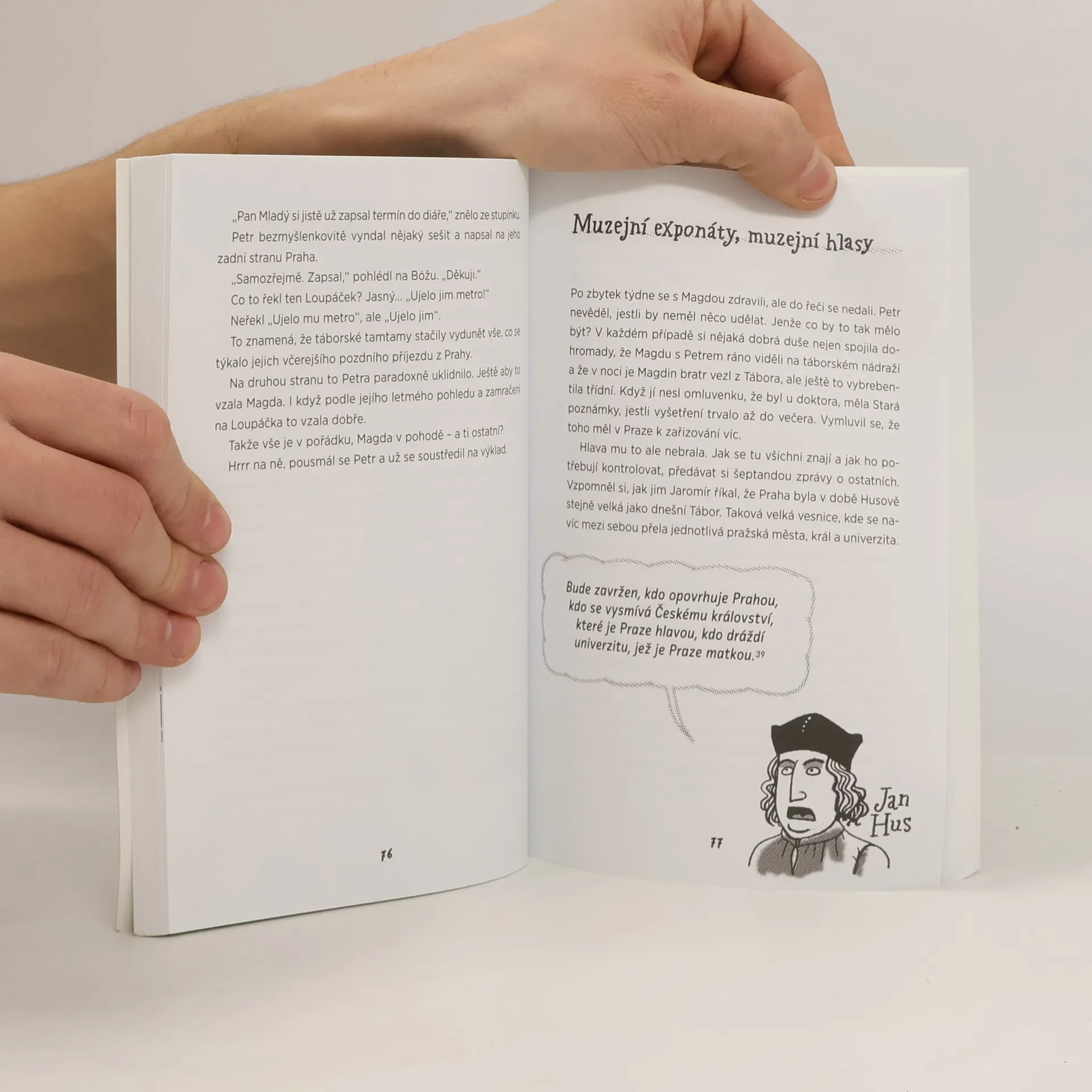 Petrův táta, novinář pátrající po spiknutích, se dostane do problémů, což donutí rodinu k rychlému odchodu z Prahy. Čtrnáctiletý Petr se ocitá v malé jihočeské vesnici Hroby, zklamaný z otce, který se potýká s depresí. Nečekaně mu však pomůže učitelka dějepisu, se kterou od začátku bojuje. Zadání referátu o Janu Husovi ho zavede na dobrodružnou cestu, která ovlivní nejen jeho, ale i jeho otce. Díky Husovi potkává zajímavé lidi a naváže přátelství se spolužačkou Magdou, což otci dodá motivaci bojovat za pravdu. Místa mají paměť a umožňují lidem propadnout se do minulosti. Kniha se zaměřuje na etické poselství Husova příběhu pro dnešní mládež a na témata jako víra, odpovědnost a občanská statečnost, s nimiž se mladí čtenáři často nesetkávají. Příběh je doplněn infoboxy, které čtenářům přibližují historické reálie a fakta o Husově životě. Dialogy mezi postavami poskytují odborné informace na základě nejnovějších výzkumů o Husovi, čímž obohacují hlavní text a umožňují čtenářům lépe porozumět historickému kontextu.