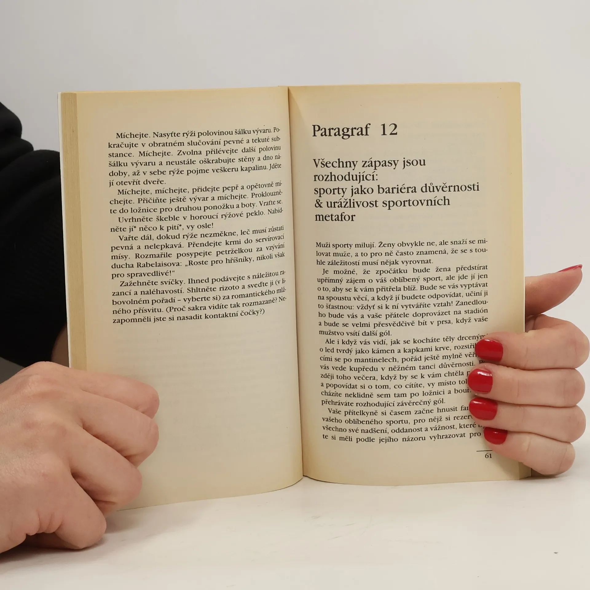 Klasická ukázka toho, jak může být název knihy zavádějící. Nehybné ultrafeministky se mohou probrat z bezvědomí, neboť kniha je o něčem zcela jiném, než podtitul napovídá. Zdánlivě je ve 24 paragrafech, 3 dodatcích a 6ti tabulkách splněno to, co název knihy slibuje, výsledkem je však s typickou anglickou ironií, nadsázkou a humorem podaný obraz věky vypracovaných zvyků, chování, vztahů a podstaty obou pohlaví a jejich partnerské komunikace a nekomunikace. O tom, že autoři nešetří ženy ani muže, netřeba pochybovat, není zřejmě náhodou, že překladu se ujala právě žena. Vzhledem ke 100 stránkovému rozsahu je kniha lehce stravitelná a humor neunaví. pokud čtenář či čtenářka v některých pasážích poznají sebe, partnera(y), či vzájemné (byť dočasné) vztahy, svědčí o tom, že autoři věděli co tvoří a stvořili to dobře.