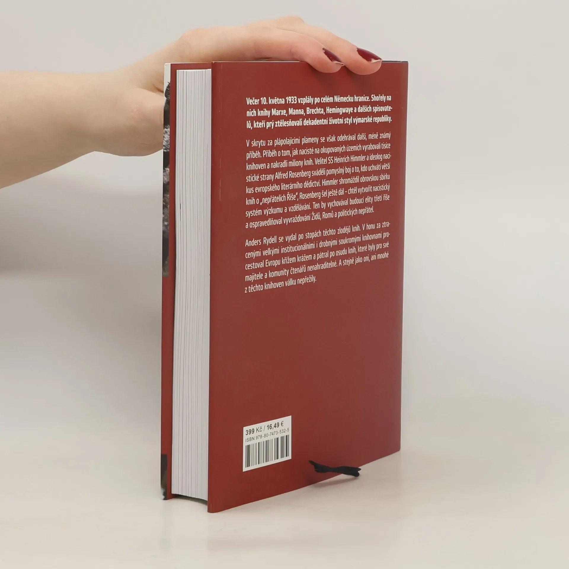 Večer 10. května 1933 vzplály po celém Německu hranice. Shořely na nich knihy Marxe, Manna, Brechta, Hemingwaye a dalších spisovatelů, kteří prý ztělesňovali dekadentní životní styl Výmarské republiky. V skrytu za plápolajícími plameny se však odehrával další, méně známý příběh. Příběh o tom, jak nacisté na okupovaných územích vyrabovali tisíce knihoven a nakradli miliony knih. Velitel SS Heinrich Himmler a ideolog nacistické strany Alfred Rosenberg sváděli pomyslný boj o to, kdo uchvátí větší kus evropského literárního dědictví. Himmler shromáždil obrovskou sbírku knih o „nepřátelích říše“, Rosenberg šel ještě dál – chtěl vytvořit nacistický systém výzkumu a vzdělávání. Ten by vychovával budoucí elity třetí říše a ospravedlňoval vyvražďování Židů, Romů a politických nepřátel. Anders Rydell se vydal po stopách těchto Zlodějů knih. V honu za ztracenými velkými institucionálními i drobnými soukromými knihovnami procestoval Evropu křížem krážem a pátral po osudu knih, které byly pro své majitele a komunity čtenářů nenahraditelné. A stejně jako oni, ani mnohé z těchto knihoven válku nepřežily.