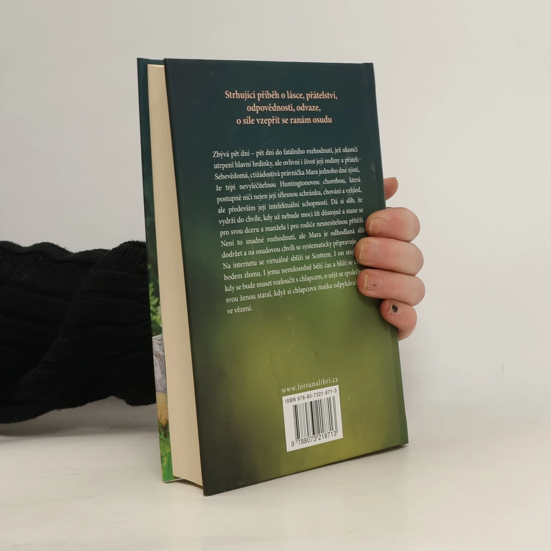 Strhující příběh o lásce, přátelství, odpovědnosti, odvaze, o síle vzepřít se ranám osudu. Zbývá pět dní - pět dní do fatálního rozhodnutí, jež ukončí utrpení hlavní hrdinky, ale ovlivní i život její rodiny a přátel. Sebevědomá, ctižádostivá právnička Mara jednoho dne zjistí, že trpí nevyléčitelnou Huntingtonovou chorobou, která postupně ničí nejen její tělesnou schránku, chování a vzhled, ale především její intelektuální schopnosti. Dá si slib, že vydrží do chvíle, kdy už nebude moci žít důstojně a stane se pro svou dceru a manžela i pro rodiče nesnesitelnou přítěží. Není to snadné rozhodnutí, ale Mara je odhodlaná slib dodržet a na osudovou chvíli se systematicky připravuje. Na internetu se virtuálně sblíží se Scottem. I on stojí před bodem zlomu. I jemu nemilosrdně běží čas a blíží se chvíle, kdy se bude muset rozloučit s chlapcem, o nějž se společně se svou ženou staral, když si chlapcova matka odpykávala trest ve vězení.